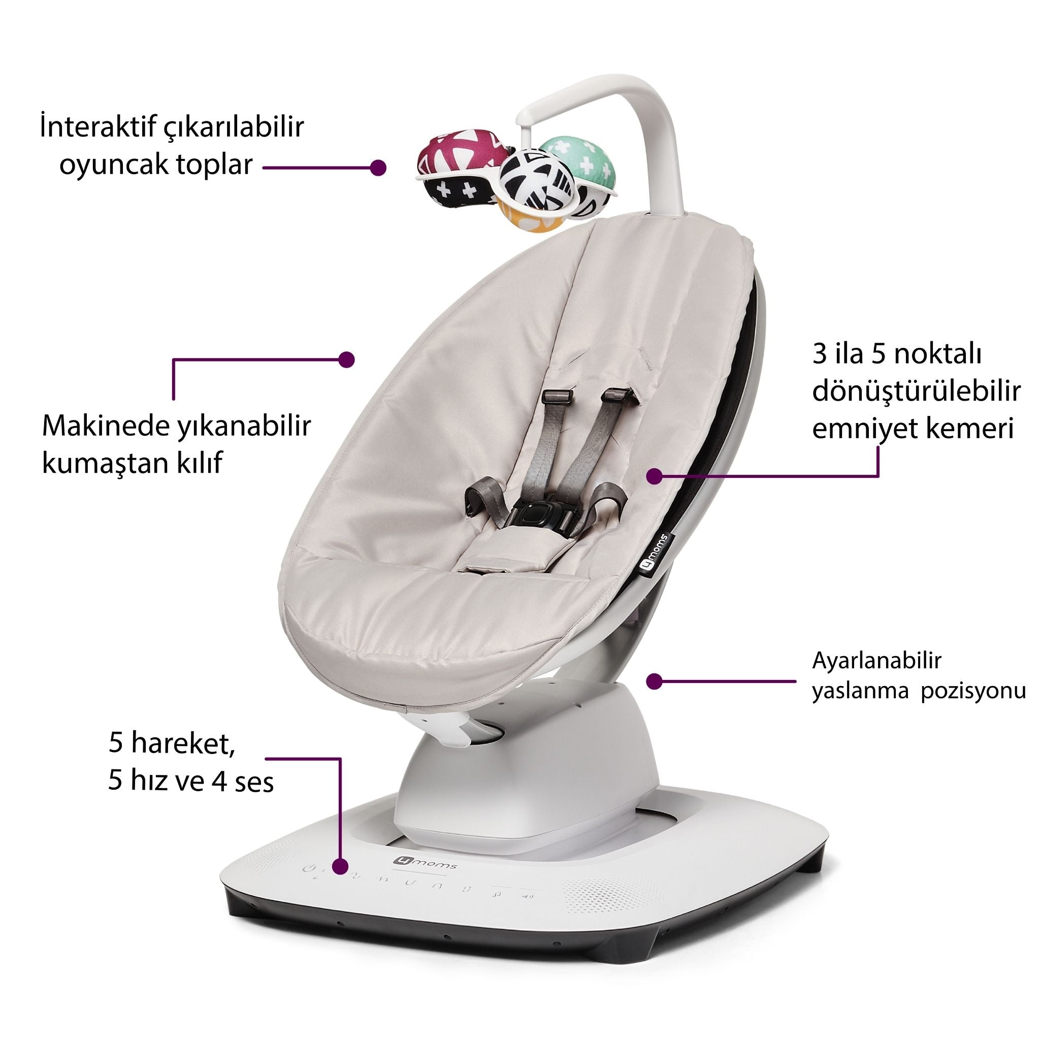 4Moms Mamaroo 5.0 Ana Kucağı, ebeveynlerin bebeklerini rahatlatırken yaptığı doğal hareketleri taklit eden yenilikçi bir tasarıma sahiptir. Beş farklı hareket ve beş hız seçeneğiyle toplamda 25 farklı kombinasyon sunarak bebeğinizin konforunu sağlar. Ayrıca, dört yerleşik ses seçeneğiyle bebeğinizi sakinleştirebilir veya herhangi bir MP3 cihazını bağlayarak kendi müziğinizi çalabilirsiniz. Koltuğun tam yatış özelliği, bebeğinizin rahatlamasına veya oturmasına olanak tanır. Kılıfı makinede yıkanabilir ve kolayca çıkarılıp takılabilir. Bluetooth ile 4moms uygulaması üzerinden hareket, hız ve sesi kolayca ayarlayabilirsiniz. Taşıma kapasitesi 9 kg olup, ürün elektrikle çalışır ve çevre dostudur.