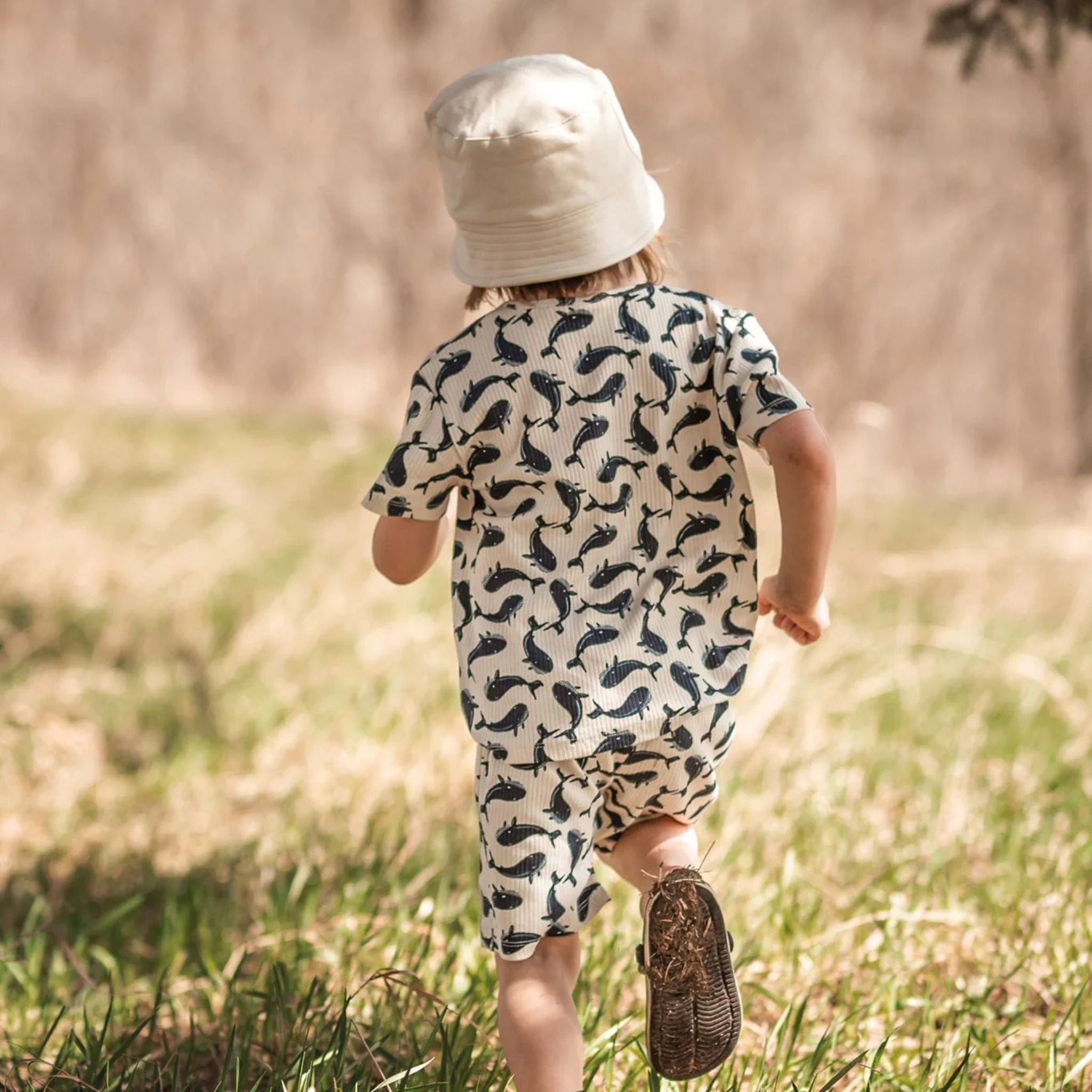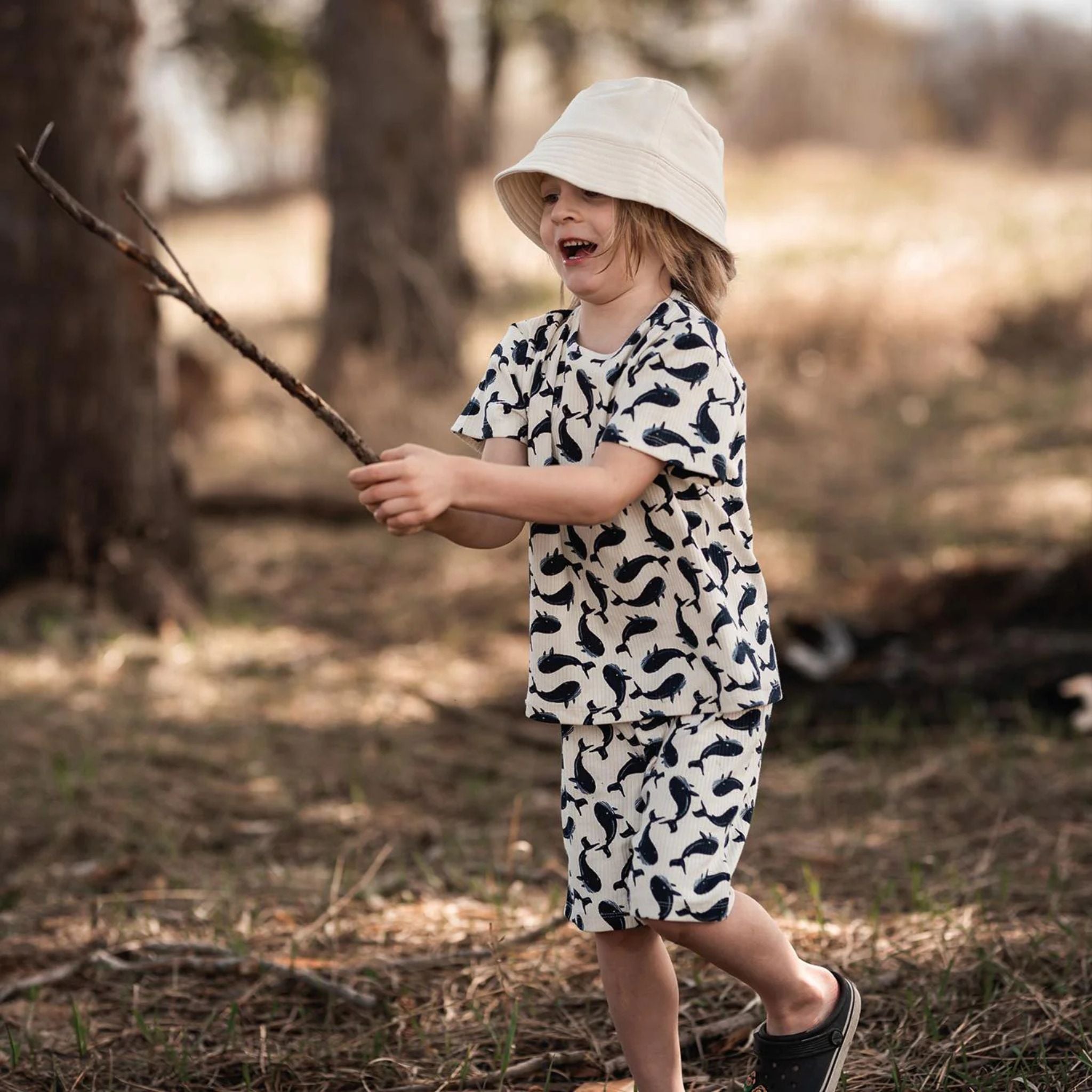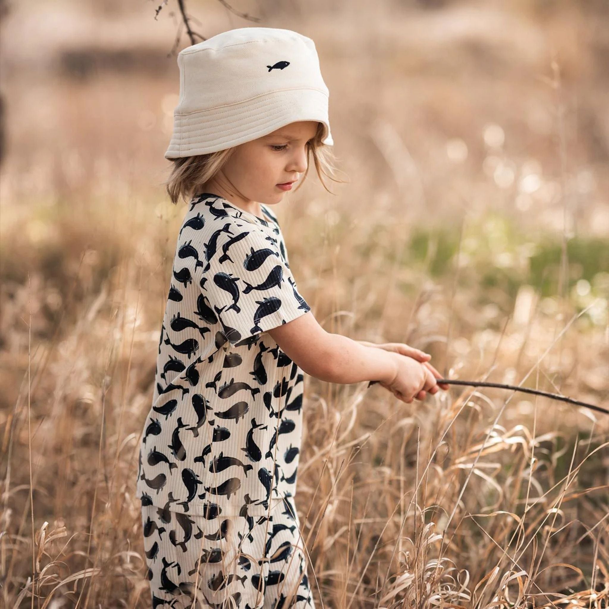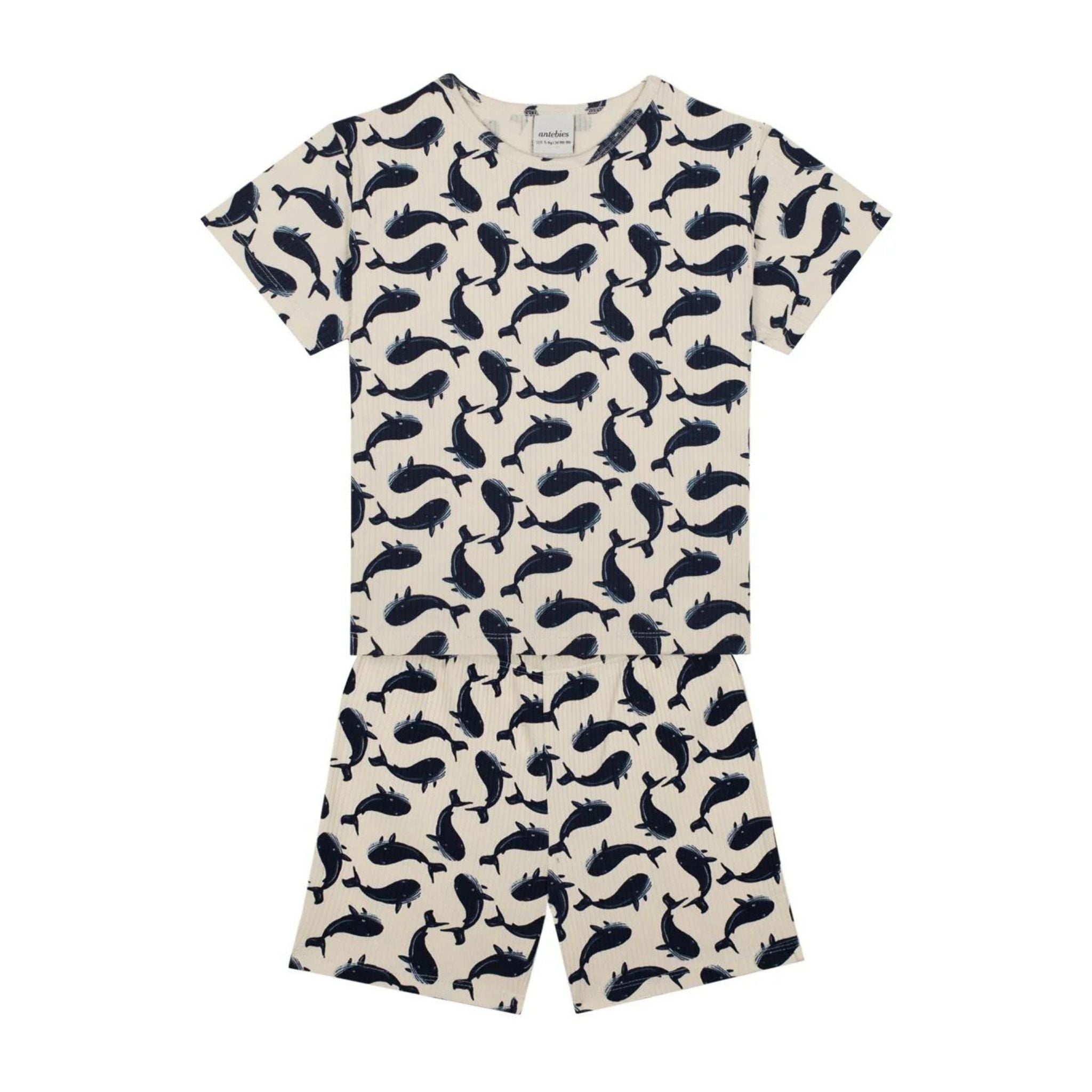 Balina Şortlu Pijama takımı, çocukların yaz akşamlarında rahatça uyuyabilmesi için hem konforlu hem de eğlenceli bir seçenek sunuyor. Lacivert tonlarıyla deniz temalı bir his yaratan bu takım; kısa kollu tişört ve elastik bel bantlı şorttan oluşur. Balina detaylı tasarımıyla çocukların ilgisini çekerken, %95 organik pamuk ve %5 elastan karışımlı ribana kumaşıyla maksimum rahatlık sağlar. Tişört kısmında yer alan patta çıtçıtlar, kolay giydirme olanağı sunar. Ayarlanabilir kordon detayı ise şortun bel kısmını çocuğunuzun bedenine göre ideal şekilde oturtmanızı sağlar. GOTS sertifikalı organik pamuktan üretilmesi sayesinde hassas ciltler için son derece uygundur.