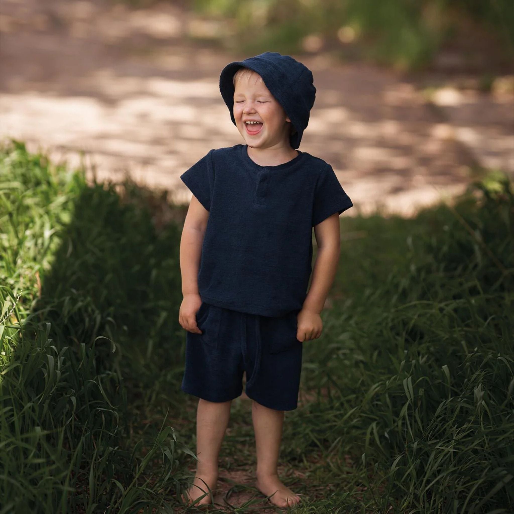 Lacivert Havlu Şortlu Set, yazın enerjisini taşıyan rengi ve nefes alabilir havlu kumaşıyla çocukların rahatlığı için özel olarak tasarlanmıştır. %100 Gots sertifikalı organik pamuktan üretilen bu iki parçalı takım; yumuşak dokusu, konforlu kesimi ve pratik detaylarıyla öne çıkar. Set içeriğindeki t-shirt, ön kısmında yer alan çıtçıtlar sayesinde kolayca giydirilebilirken; elastik bel yapısına sahip şort, ayarlanabilir sabit kordon detayıyla çocuğunuzun beline tam oturur. Günlük giyimden tatil valizlerine kadar her alanda tercih edilebilecek bu set, aynı zamanda sürdürülebilir üretim anlayışıyla çocuklar için sağlıklı bir stil sunar.