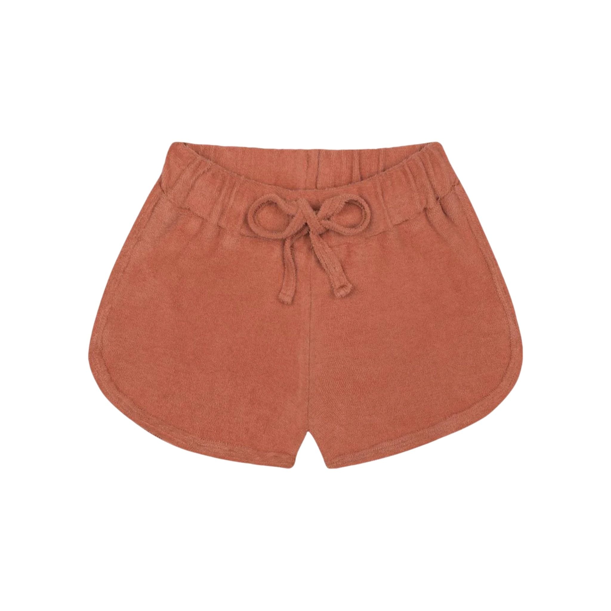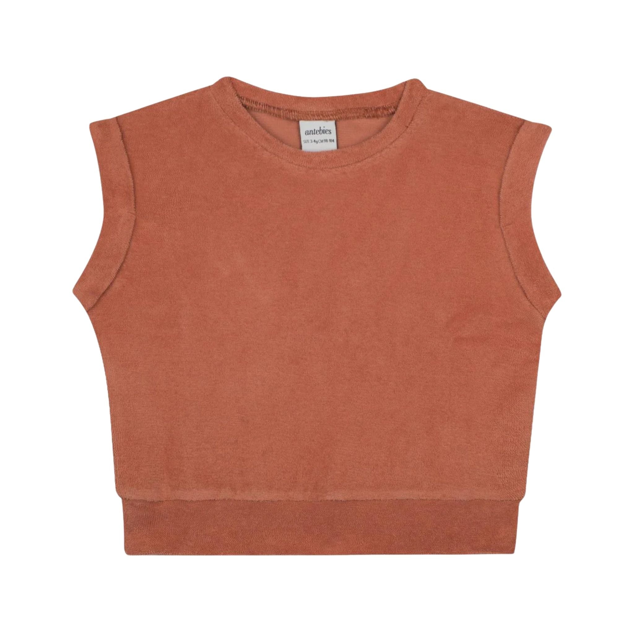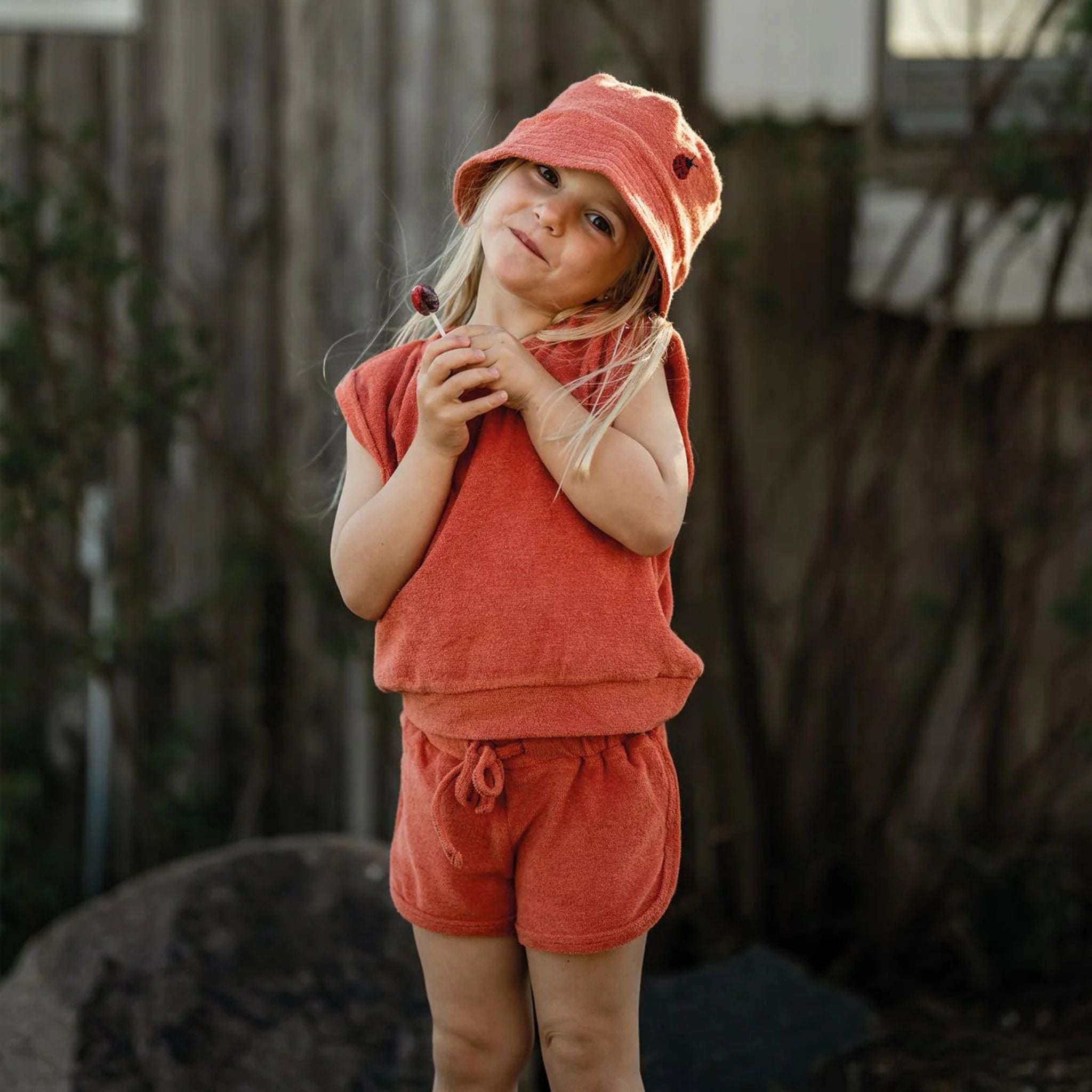 Mercan Havlu Şortlu Set, yaz aylarında çocukların hareket özgürlüğünü desteklerken maksimum konfor ve şıklık sunar. Canlı turuncu tonu ile enerjik bir görünüm sağlayan bu iki parçalı takım, %100 organik pamuk içeriğiyle hem cilde dost hem de nefes alabilir yapıdadır. Kolsuz üst parça, sıcak havalarda serin kalmayı kolaylaştırırken, yuvarlak kesimli etek ucu tasarımı hareket halindeki çocuklar için özgürlük sunar. Elastik bel bantlı ve kordon sabitli şort, kullanım esnasında kayma yapmaz ve güvenli bir deneyim sunar. Havlu kumaş dokusu sayesinde yumuşaklığı üst seviyede olan bu set, yazlık tatiller, oyun saatleri veya günlük geziler için ideal bir tercih olur. Hem rahat hem de zarif detaylarıyla gardırobun favorilerinden biri olmaya adaydır.