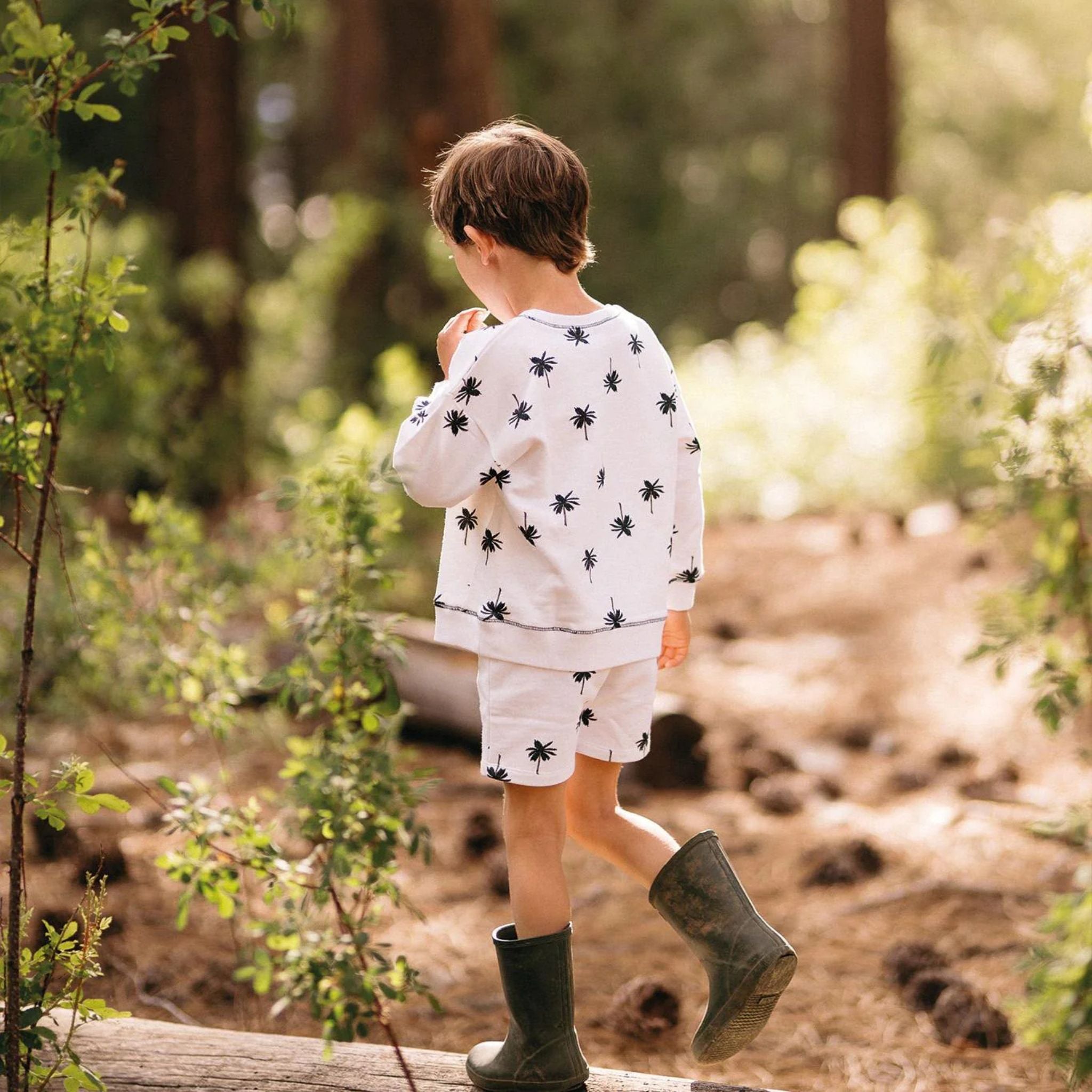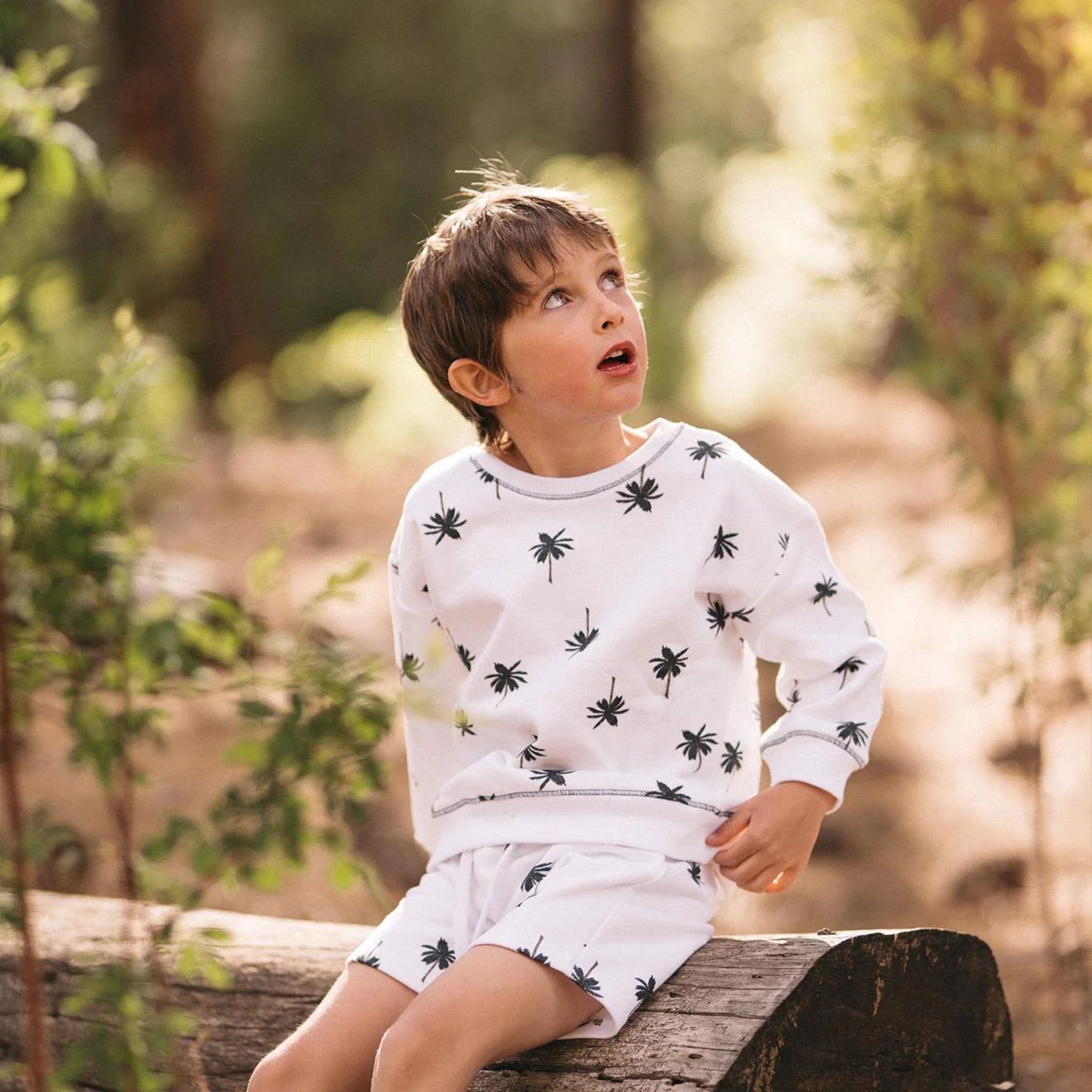 Palmiye Sweatshirt Şort Set, çocukların gün boyu özgürce hareket etmesini sağlayan konforlu yapısı ve şık tasarımıyla dikkat çeker. Doğadan ilham alınarak tasarlanan palmiye teması, yalın beyaz zeminle buluşarak minimal ama zarif bir görünüm sunar. %100 organik pamuk kumaşı sayesinde bebeğinizin hassas cildine karşı yumuşak ve nazik bir dokunuş sağlar. Gots sertifikalı üretimiyle sağlığa zararlı kimyasallardan arındırılmış bu set, güvenle tercih edilebilir. Uzun kollu, bisiklet yaka sweatshirt modeli; dikiş detayları ve ribana manşetleriyle hem tarz hem hareket kolaylığı sunarken, elastik belli şort kısmı ayarlanabilir sabit kordonuyla konforlu bir kullanım sağlar. Hem günlük kullanıma hem de şık yazlık kombinlere uyum sağlayan bu takım, ebeveynlerin favorisi olmaya aday.