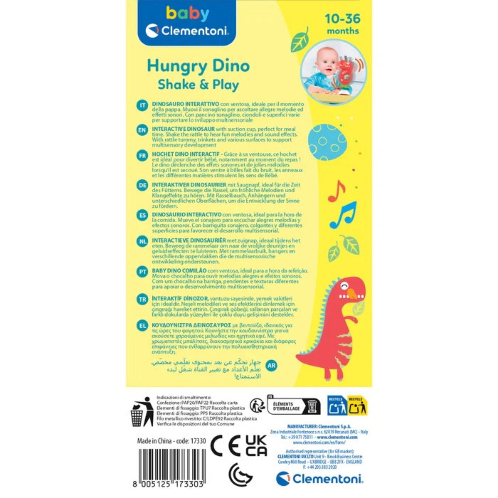 Emekleme ve yemek zamanlarını daha eğlenceli hale getirmek için özel olarak tasarlanan bu sevimli dinozor çıngırak, miniklerin gelişimine destek olurken onların dikkatini çekerek keyifli anlar sunar. Baby Clementoni Müzikli Dinozor Çıngırak, eğitici ve eğlendirici detaylarıyla emekleme döneminden itibaren bebeğinizin en sevimli oyun arkadaşlarından biri olacak!