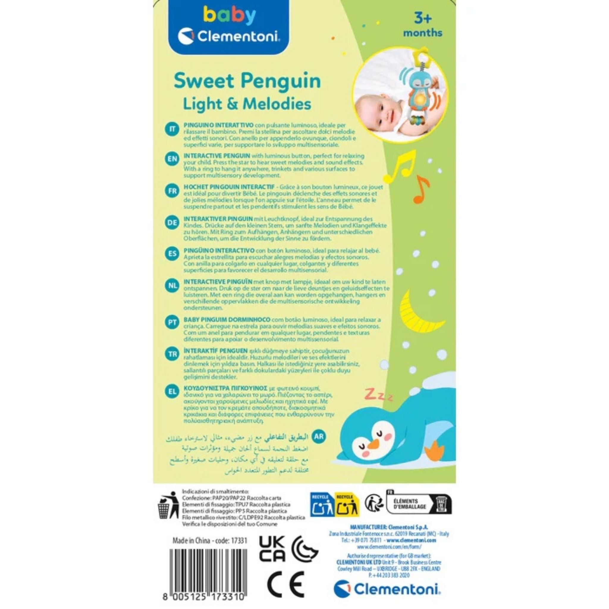 Sevimli penguen tasarımıyla bebeğinizin ilk aylarından itibaren yanında olacak bu ışıklı ve müzikli çıngırak, hem eğlenceli hem de yatıştırıcı özellikleriyle öne çıkar. Yumuşak melodiler, ışıklı yıldız butonu ve sallandıkça çıkan çıngırak sesi, bebeğinizin duyusal gelişimini destekler. Pratik halkası sayesinde kolayca beşik, bebek arabası veya ana kucağına takılabilir. Sallandığında hareket eden renkli halkalar hem görsel hem işitsel uyaran sağlar. Işıklı düğmesiyle dikkat çekerken, sakinleştirici melodileriyle bebeğinizin rahatlamasına yardımcı olur. Bebeğinizin ilk arkadaşlarından biri olacak bu penguen çıngırak, hem yatıştırıcı etkisi hem de güvenli tasarımıyla ebeveynlerin vazgeçilmezi olmaya aday!