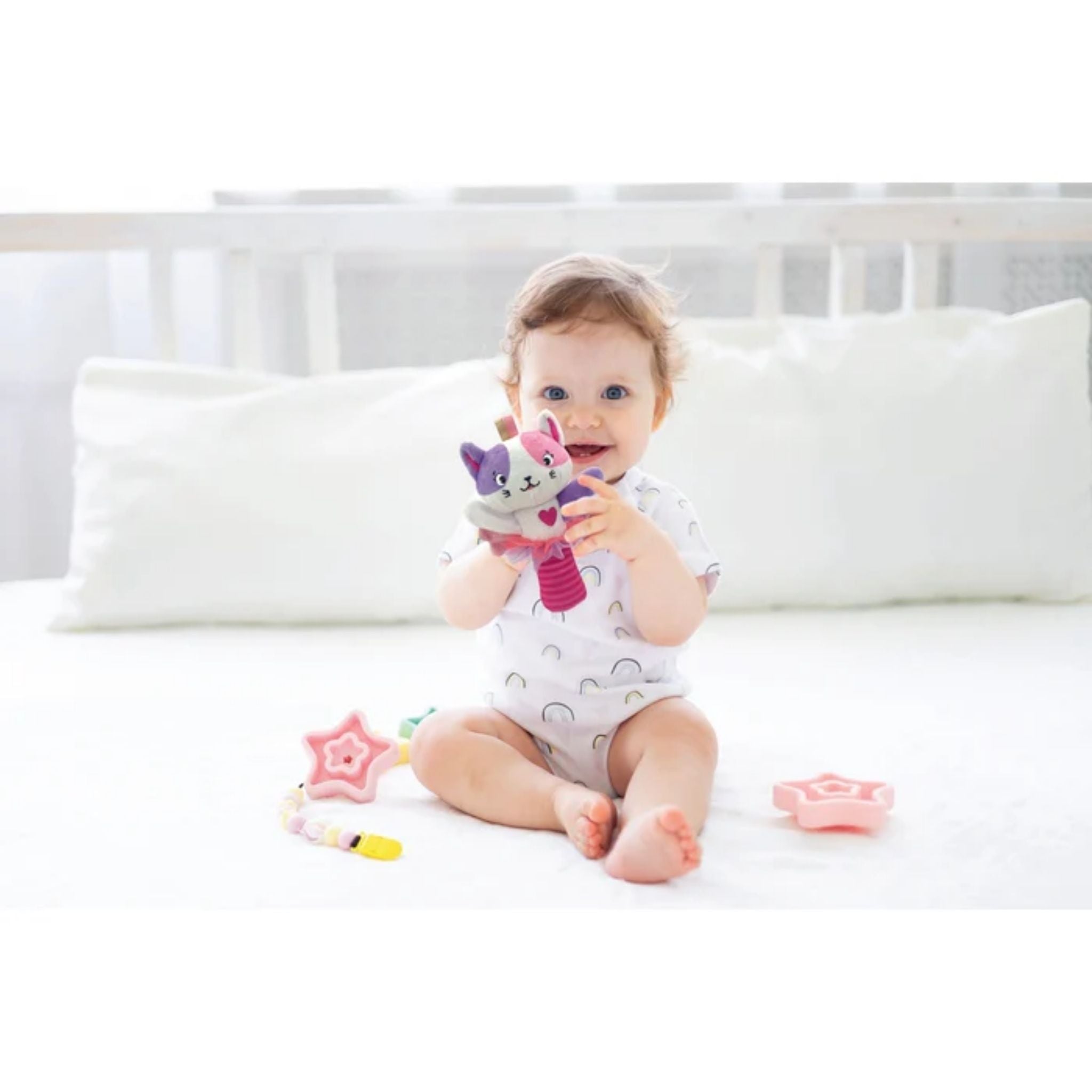 Baby Clementoni Sevimli Kedi Çıngırak, bebeklerin ilk aylarda duyusal dünyayı keşfetmesine yardımcı olmak için özel olarak tasarlanmış yumuşacık ve hafif bir oyuncağıdır. Farklı kumaş dokularını bir araya getiren yapısı, bebeğin dokunma duyusunu harekete geçirirken hışırdayan yüzeyleri ve içindeki çıngırak sesi işitsel farkındalığı artırır. Ergonomik formu sayesinde minik eller tarafından rahatça kavranabilir. Üzerindeki pratik halka, oyuncağın bebek arabasına, ana kucağına veya beşik kenarına kolayca asılmasına olanak tanır. Böylece kedi çıngırak, evde ve dışarıda bebeğin her an yanında olabilir. Makinede yıkanabilir olması ise hijyen açısından büyük kolaylık sağlar. İtalya’da tasarlanıp geliştirilen bu model, kaliteli malzemeleri ve güven veren yapısıyla ebeveynlerin rahatlıkla tercih edebileceği bir üründür.