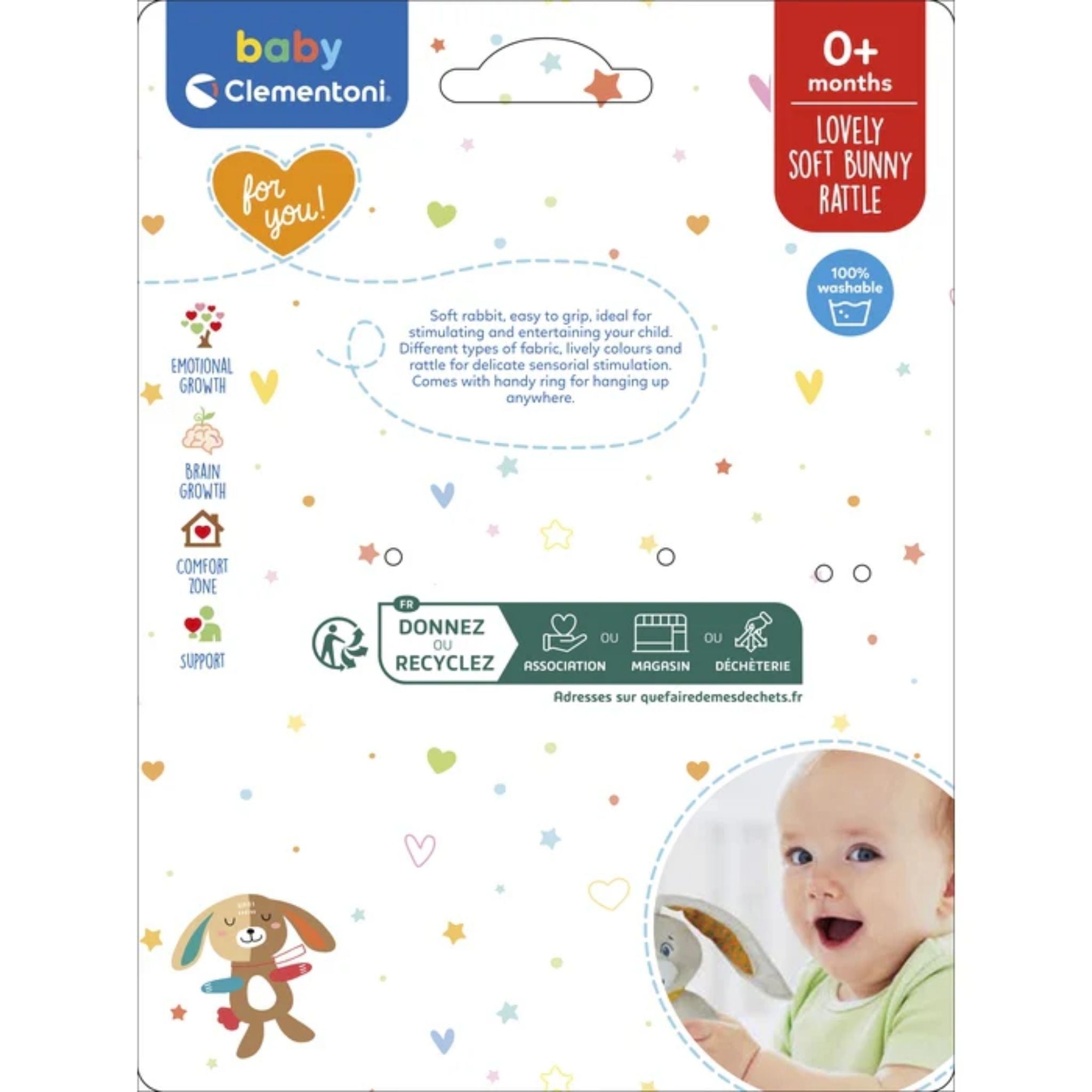 Baby Clementoni Sevimli Tavşan Çıngırak, bebeklerin ilk aylarda duyusal becerilerini desteklemek için tasarlanmış yumuşacık bir oyuncaktır. Hafif yapısı sayesinde minik eller tarafından kolayca kavranabilir. Farklı dokulara sahip kumaş yüzeyi, bebeğin dokunma duyusunu harekete geçirirken parlak renkleri görsel algıyı destekler. Çıkardığı yumuşak çıngırak sesi işitsel farkındalığı artırır ve bebeğin dikkatini çekmeye yardımcı olur. Üzerindeki kullanışlı halka, oyuncu tavşanın bebek arabasına, ana kucağına veya beşik kenarına asılmasını sağlar. Böylece bebek günün her anında güvenli bir şekilde yanında taşıyabilir. İtalya’da tasarlanan ürün, kalite ve ergonomi açısından bebeklere uygun şekilde geliştirilmiştir.