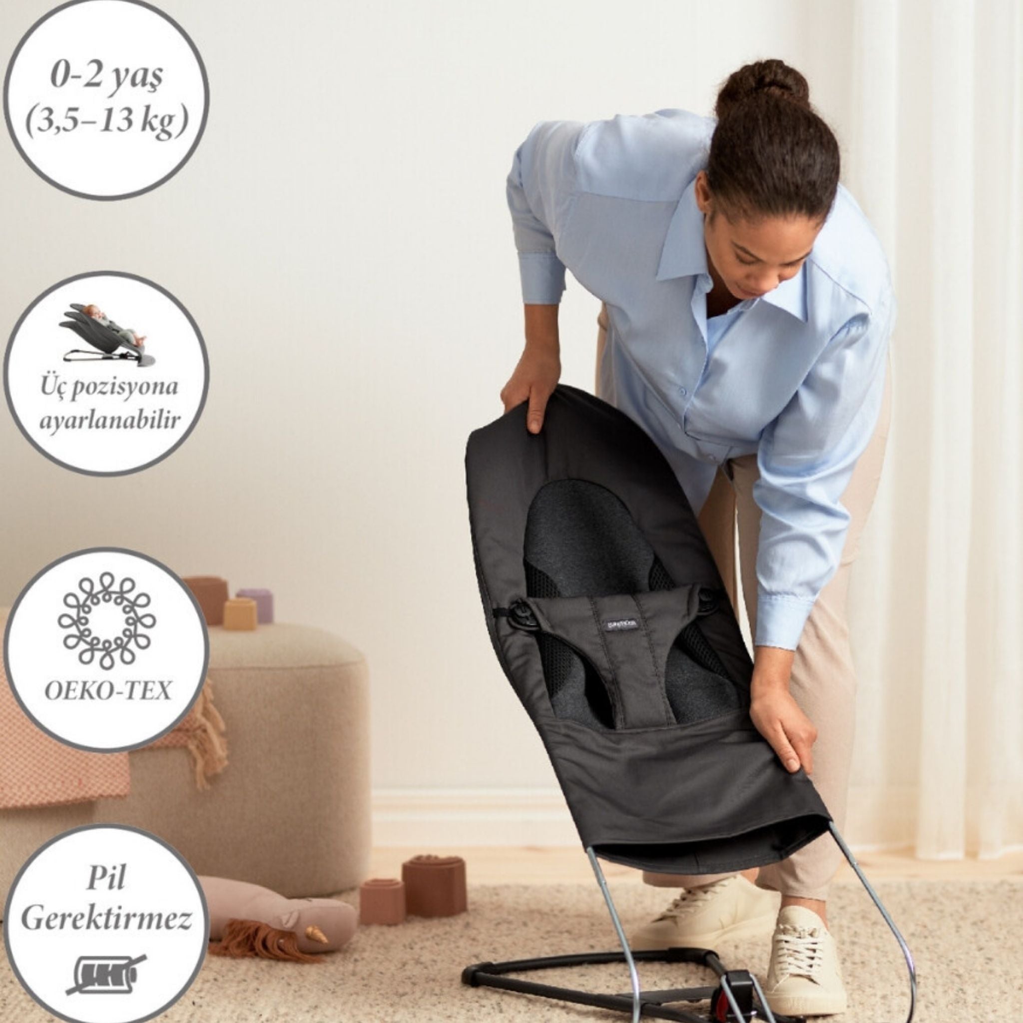 BabyBjörn Balance Soft Woven Jersey Ana Kucağı, doğumdan 2 yaşına kadar (0-13 kg) kullanılabilen, ergonomik tasarımı ve üçlü kumaş teknolojisi ile hem bebekler hem de ebeveynler için üstün konfor sağlar. Zarif Dark Grey rengi ve premium kumaş dokusu, şıklığı ve işlevselliği bir araya getirir. Üçlü kumaş teknolojisi; hava geçirgen Airy Mesh, kadifemsi yumuşak 3D Jersey ve dayanıklı Woven kumaşın birleşiminden oluşur. Bu özel kombinasyon, bebeğin cildine dost dokusu, nem emici yapısı ve dört mevsim kullanım konforuyla öne çıkar. Pediatristlerle iş birliği içinde geliştirilen ergonomik oturma bölgesi, bebeğin sırt, boyun ve başını doğru şekilde destekler. Doğal sallanma hareketi ile motor beceri ve denge gelişimini destekler. Pil veya elektrik gerektirmez; tamamen bebeğin kendi hareketleriyle çalışır. Çocuğunuz büyüdüğünde, kılıf ters çevrilerek ana kucak modu rahat bir çocuk koltuğuna dönüştürülebilir. Böylece tek ürünle uzun yıllar kullanım avantajı sunar. BabyBjörn Balance Soft Woven Jersey Üçlü Kumaş Dark Grey, konforu, güvenliği ve uzun ömürlü kullanımı bir araya getiren özel tasarımıyla, bebeğinizin ilk gününden itibaren en güvenilir yardımcınız olur.