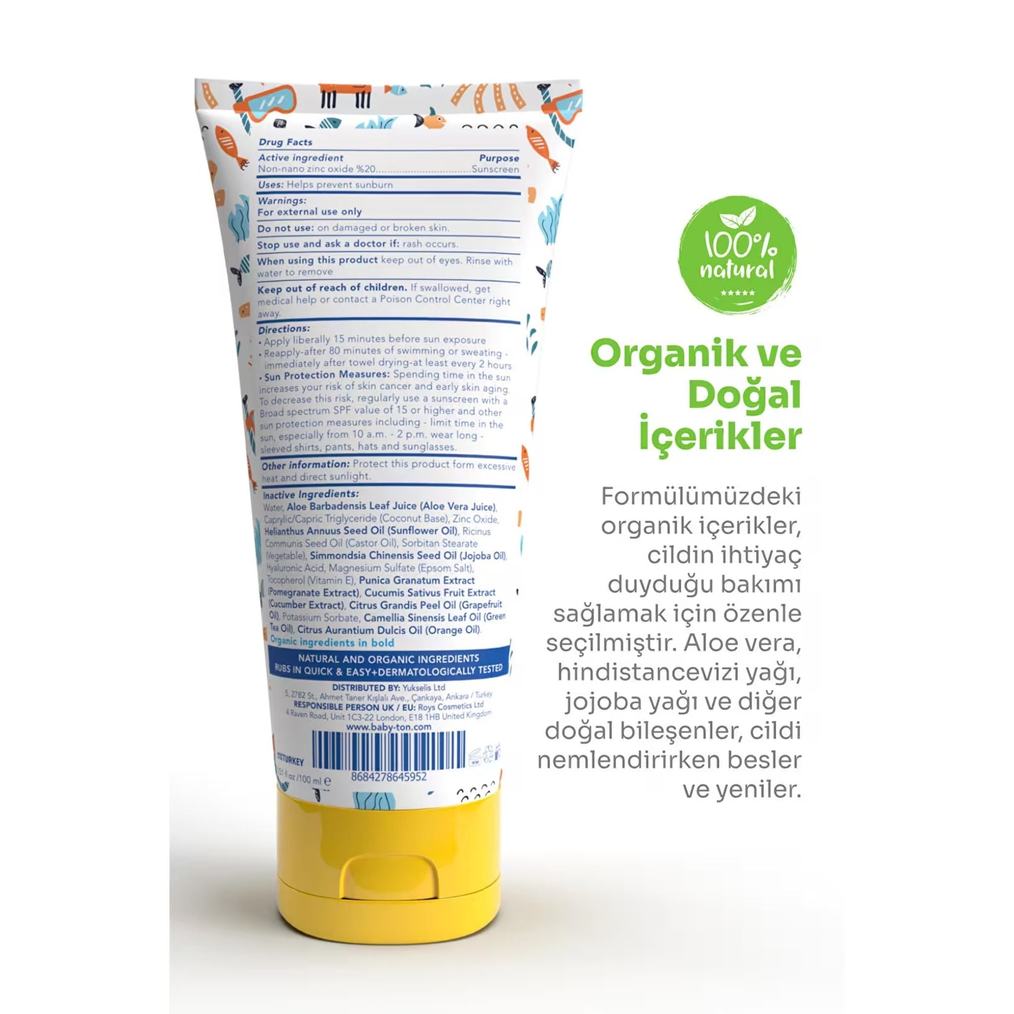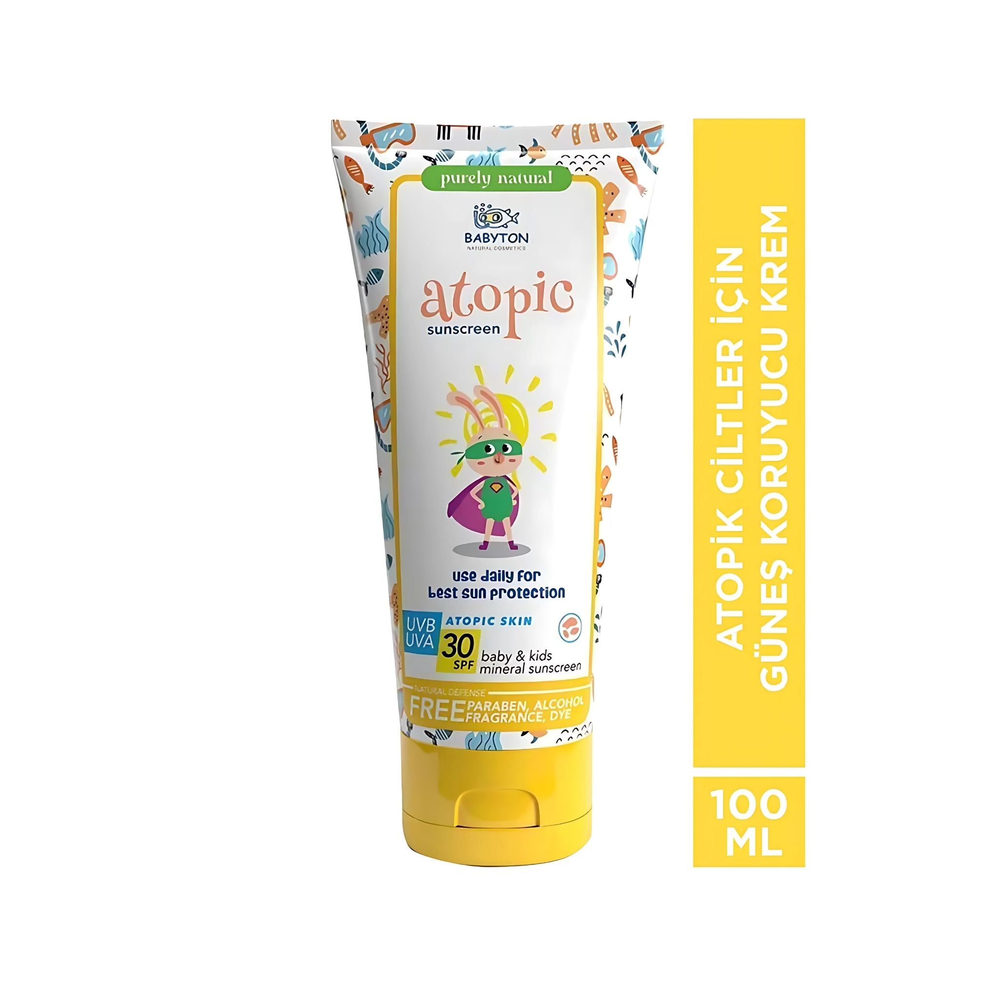 Babyton Atopic Sunscreen SPF30+, atopiye eğilimli ve aşırı hassas ciltler için özel olarak geliştirilmiş doğal bir güneş koruyucu kremdir. Güneşin zararlı UV ışınlarına karşı etkili koruma sunarken, cilt üzerinde hafif ve doğal bir bariyer oluşturarak nem dengesini destekler. %100 doğal içerikli bu mineral güneş kremi; aloe vera, hindistancevizi yağı ve jojoba yağı gibi doğal bileşenlerle zenginleştirilmiştir. Alkol, parfüm ve renklendirici içermemesi sayesinde en hassas ciltlerde dahi güvenle kullanılabilir. Günlük kullanıma uygun formülüyle bebeklerin ve çocukların cildini güneşin olumsuz etkilerine karşı korur.