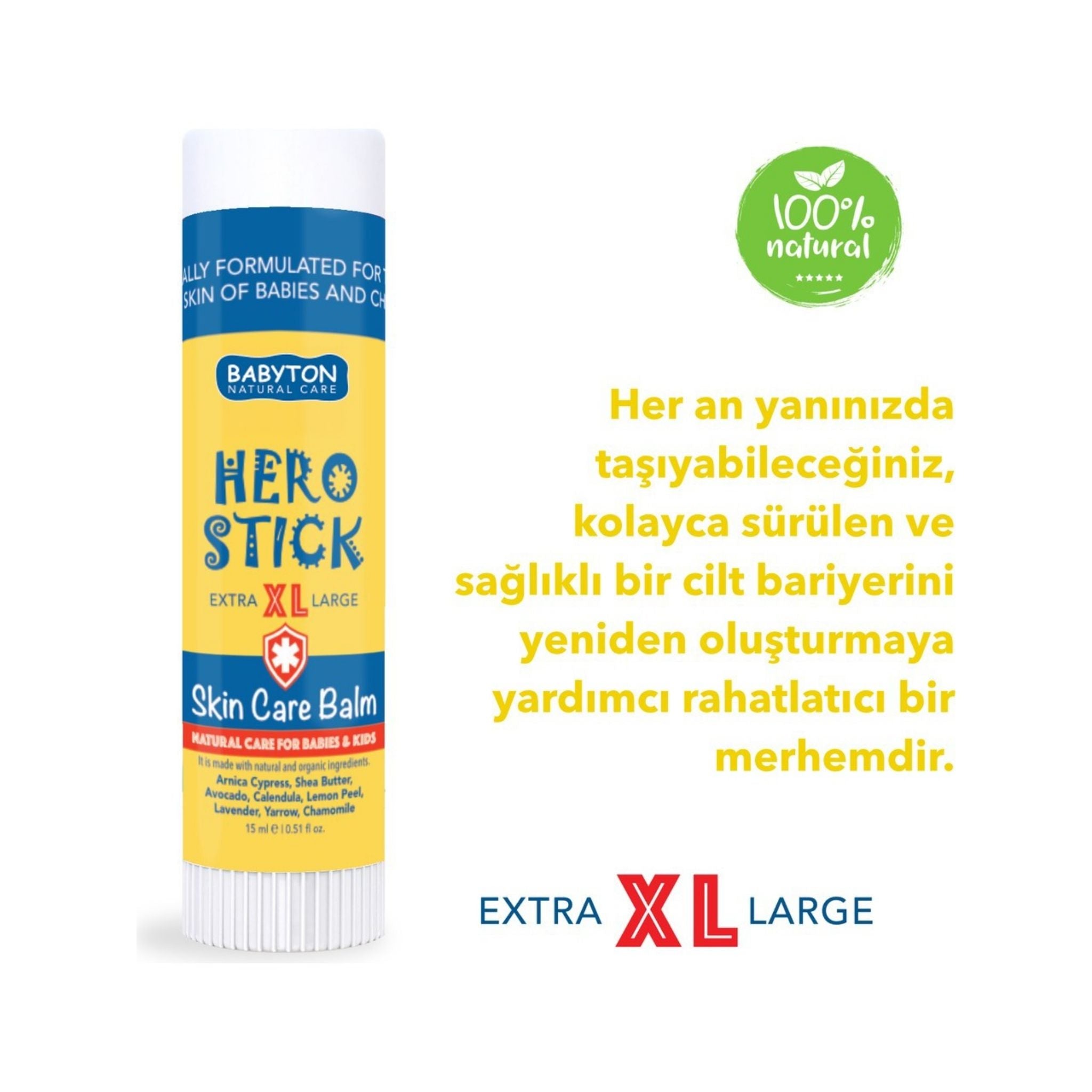Babyton XL Hero Stick, yoğun nem ihtiyacına sahip ciltler için özel olarak geliştirilmiş doğal ve organik içerikli bir balsamdır. Alkol ve parfüm içermeyen formülü sayesinde hassas ciltlerde güvenle kullanılabilir. Stick formu sayesinde uygulama kolaylığı sunan ürün, özellikle seyahatlerde ve dış mekan aktivitelerinde pratik bir çözüm sunar. Ciltte ipeksi bir tabaka oluşturarak uzun süreli nemlendirme etkisi sağlar. Özellikle dirsek, diz ve yüz gibi kuruluk sorununun yoğun yaşandığı bölgelerde etkili sonuç verir.