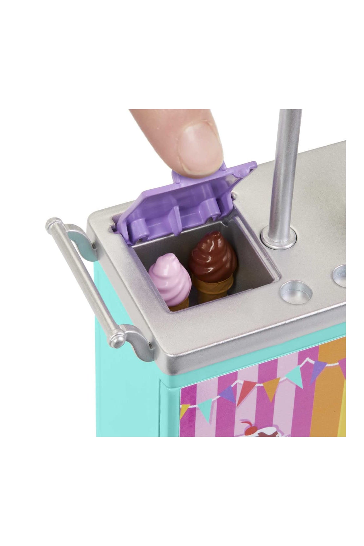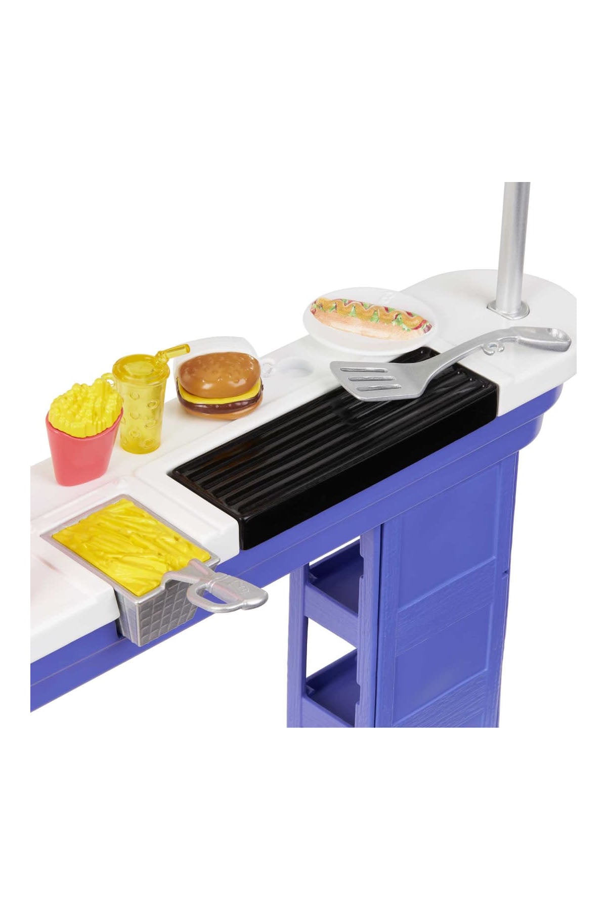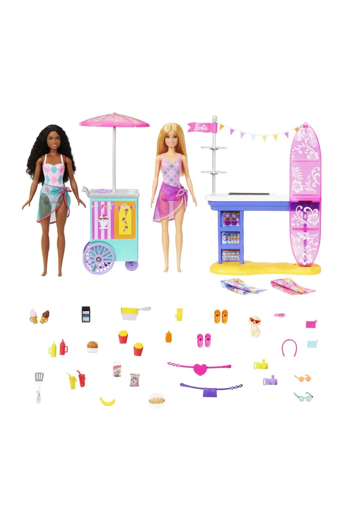 Renkli sörf tahtaları, dönebilen tekerleklere sahip dondurma büfesi, atıştırmalık standı ve detaylı yiyecek aksesuarları ile çocuklar gerçek bir sahil deneyimi yaşayabilecek. Hamburger, patates kızartması ve dondurma gibi favori yiyeceklerle oynayarak sipariş verebilir, kart okuyucu ve kredi kartlarıyla ödeme yapabilirler. Güneş gözlüğü, kamera, havlu ve diğer yaz temalı aksesuarlar ile sahil eğlencesi tamamlanıyor.