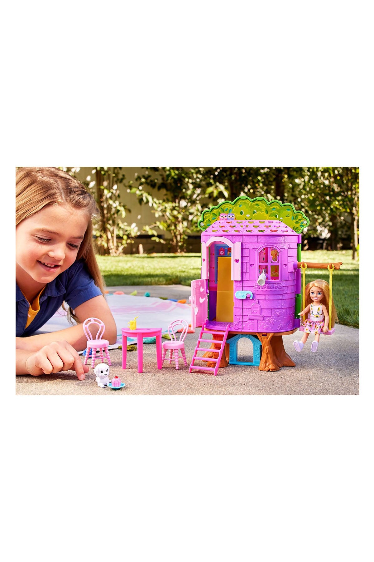 Ağaç evden esinlenilerek tasarlanan bu Barbie Chelsea oyun setiyle çocuklar ağaçların tepesindeki dünyada eğlenceye ve maceraya doyacak! Bu oyun setinde setten çıkan Chelsea bebek için hikaye anlatımını güçlendiren 10'dan fazla parça ve beş farklı oyun alanı bulunur. Tilki maskesi takmaktan ağaç dallarından sallanmaya kadar pek çok aktivite merdivenlerin tepesinde sizi bekliyor! Chelsea bebek çiçekli tulumu ve botlarıyla tüm gün dışarıda oynamaya hazır!