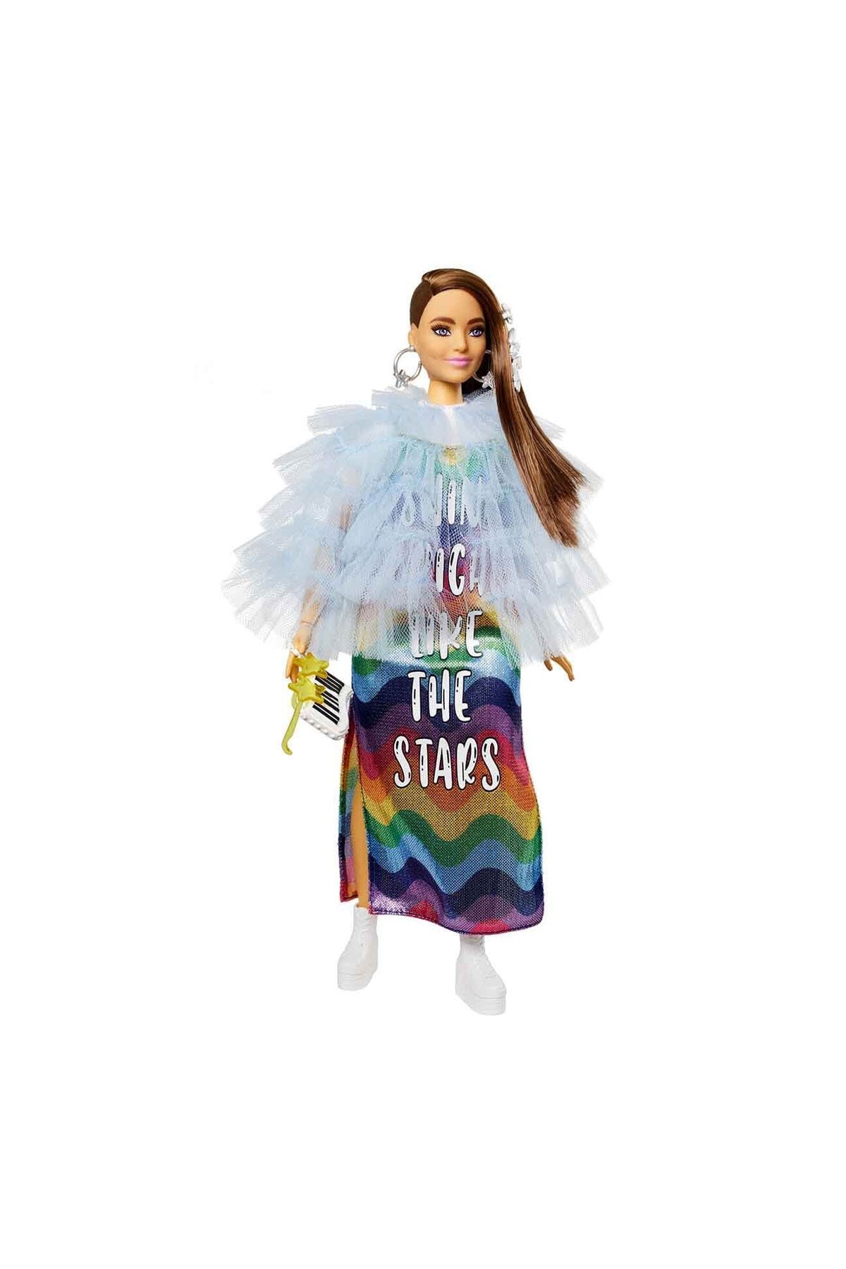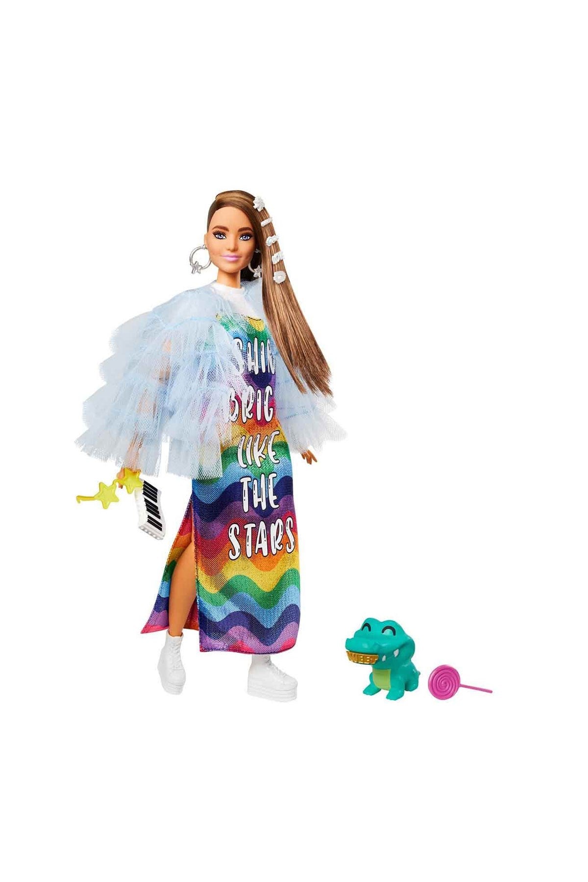 Her Barbie Extra bebeği kendine özgü tarzı, renkli ve şık kıyafetleriyle dikkat çeker. Parıltılı saçlar, özgün aksesuarlar ve şık elbiseler ile her anınız modaya ekstra ses getirir. “Shine Bright Like the Stars” mesajlı gökkuşağı desenli elbisesi ve fırfırlı tülden mavi ceketiyle cesur bir stil sergileyen bu bebek, özgüvenli ve eğlenceli bir görünüme sahip.