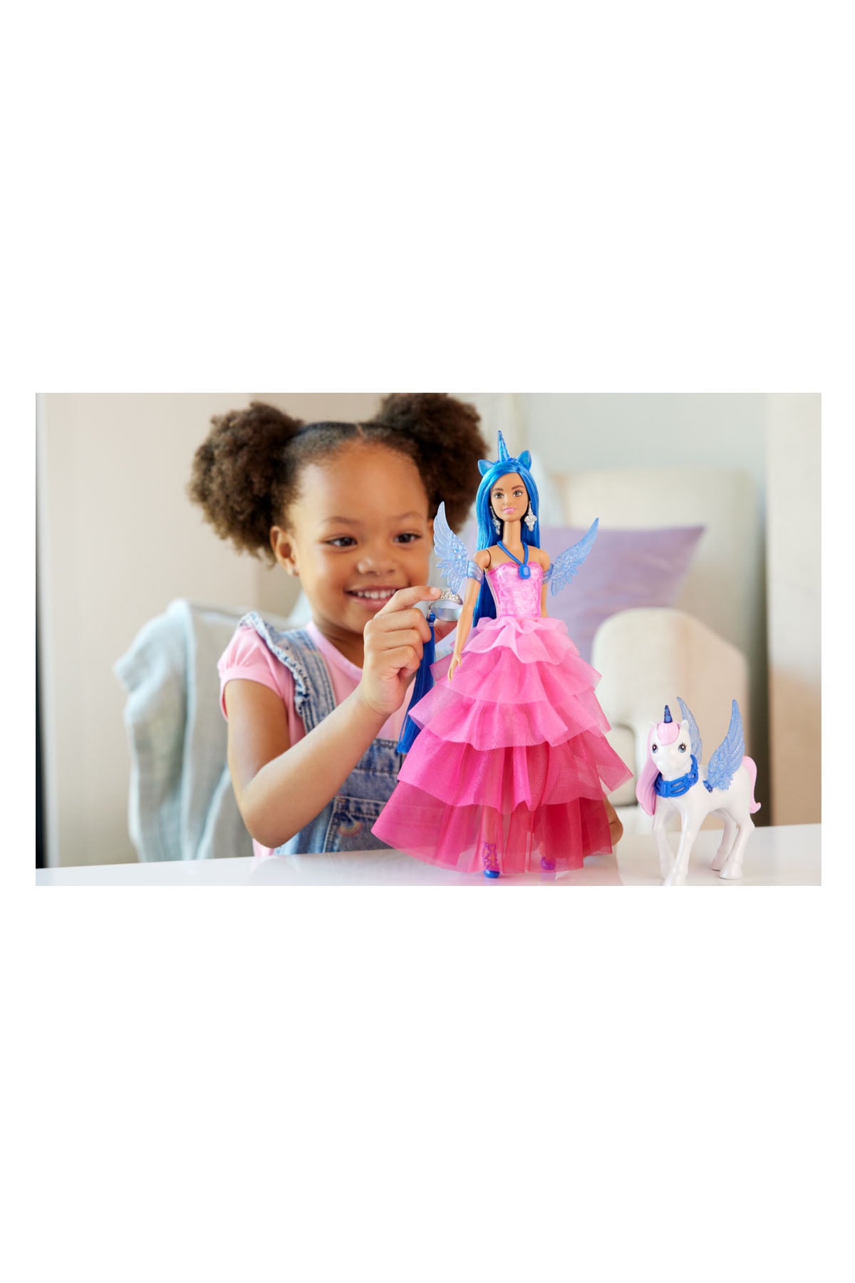 Barbie'nin 65. yıl dönümünü bu göz alıcı bebekle kutlayın! 'Barbie A Touch of Magic' dizisindeki karakterinden ilham alınarak tasarlanan bu bebek, renk geçişli pembe elbisesi ve masmavi saçlarıyla dikkat çekiyor. Tüm zarafetiyle parlayan Barbie, çıkarılabilir kuyruğu, kanatlı tacı ve unicorn figürüyle görsel şölen sunuyor. Aksesuarlar arasında gümüş küpeler, bant detaylı topuklu ayakkabılar ve saç fırçası bulunuyor. Bu özel tasarım, 'Barbie A Touch of Magic' dizisindeki karakteri yansıtarak çocukların hayal gücünü harekete geçiriyor.