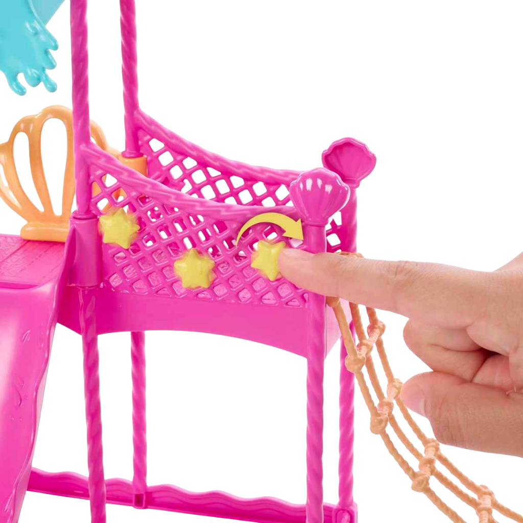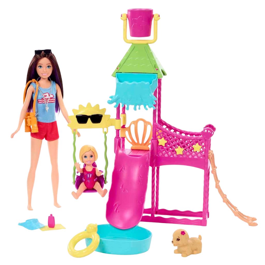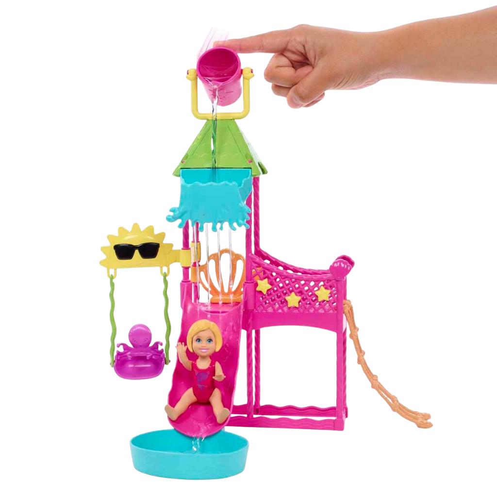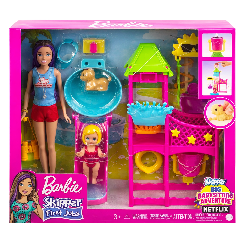 Barbie Skipper İlk İşler bebekleri ve oyun setleri, çocukların Barbie’nin genç ablası Skipper ile çalışma hayatını eğlenceli bir şekilde keşfetmelerine olanak tanır. Skipper and the Big Babysitting Adventure filminden ilham alan bu oyun seti, çocuklara hem sorumluluk duygusunu hem de hayal gücünü destekleyen oyun senaryoları sunar. Barbie Skipper’ın Su Parkı Eğlencesi Oyun Seti’nde Skipper, su parkında çalışarak öz geçmişine yeni bir iş deneyimi ekler. Gerçekten çalışan su kaydırağı, kovayla dökülen su mekanizması ve çok seviyeli oyun alanları sayesinde çocuklar, filmden sahneleri canlandırabilir ya da kendi hikayelerini oluşturabilir. Setin interaktif yapısı, oyunu daha gerçekçi ve eğlenceli hale getirir. Su parkında salıncak, halat merdiven ve dönen yıldızlarla süslenmiş köprü gibi farklı aktivite alanları bulunur. Su fışkırtan yavru köpek, oyuna sürprizli anlar katar. Çocuklar kovayı suyla doldurup kaydırağa dökerek havuzu doldurabilir, böylece gerçek bir su parkı deneyimi yaşayabilir. Set içerisinde yer alan aksesuarlar, hikâye kurmayı ve rol yapma oyunlarını destekler. Barbie Skipper’ın Su Parkı Eğlencesi Oyun Seti, 3 yaş ve üzeri çocuklar için yaz temalı, eğlenceli ve yaratıcı bir oyun deneyimi sunar. Sosyal becerilerin, hayal gücünün ve neden-sonuç ilişkisinin gelişimine katkı sağlar.