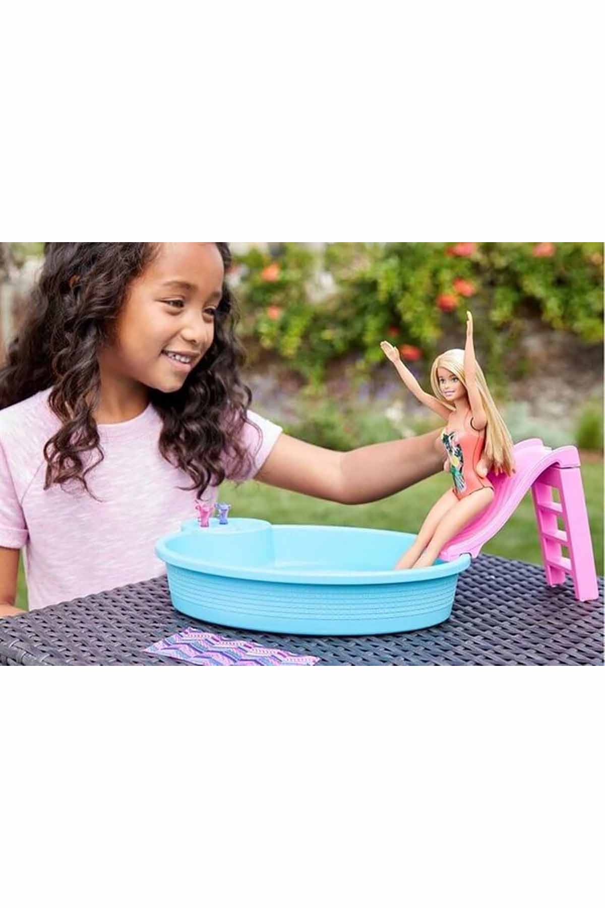 Barbie, havuzu ve kaydırağıyla yazın keyfini çıkarıyor! Kolayca doldurulup boşaltılabilen bu havuz, Barbie ve arkadaşları (ayrı satılır) için eğlenceli bir oyun alanı sunar. Kaydıraktan kayarak suya girebilir, oturma alanında dinlenebilir ve yazın tadını çıkarabilir.