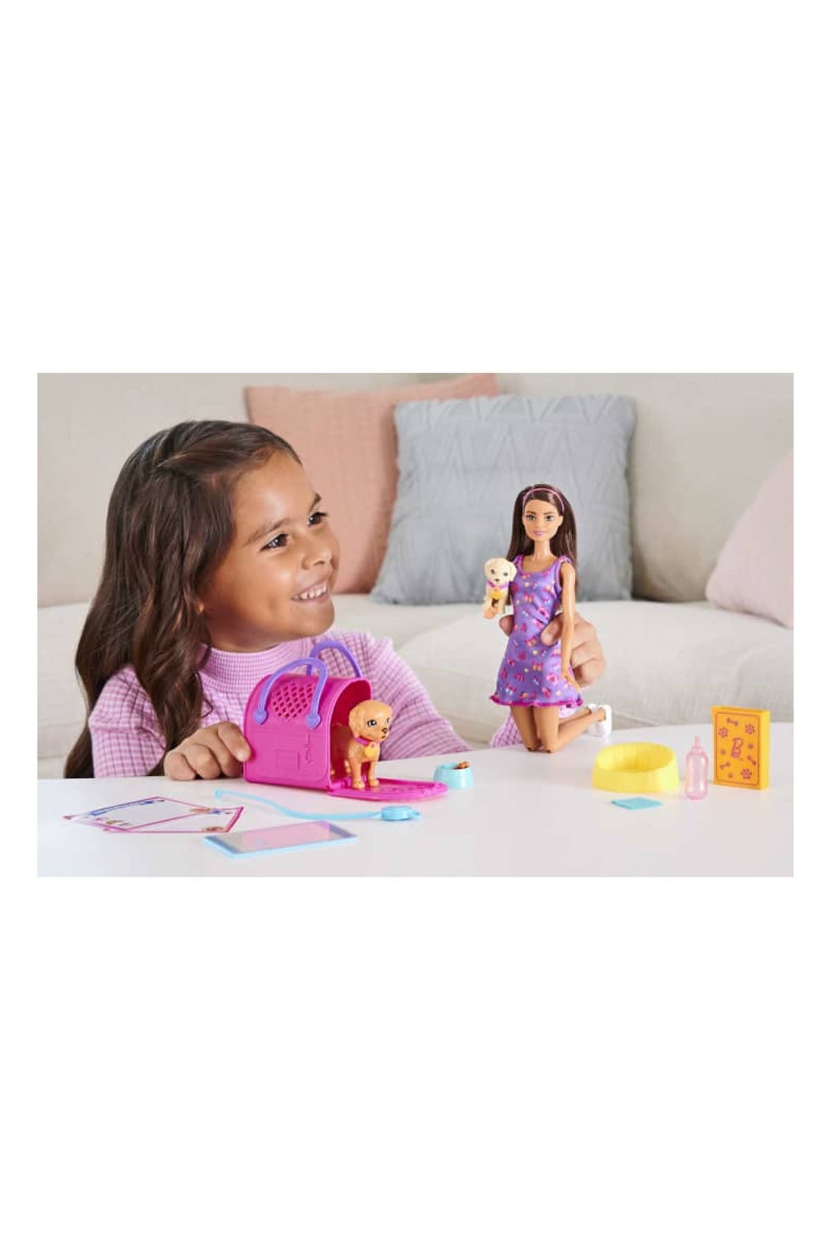 Hikaye anlatan parçalar, genç hayvan severlerin yeni bir köpek sahibi olmalarını ve iki sevimli yavru köpekle ilgilenmelerini, onları beslemelerini ve eğitmelerini sağlar. Renk değiştirme dönüşümü, besleme ve lazımlık zamanına rol oynama eğlencesi katar ve çalışan bir evcil hayvan taşıyıcı, besleyici oyunu genişletir.