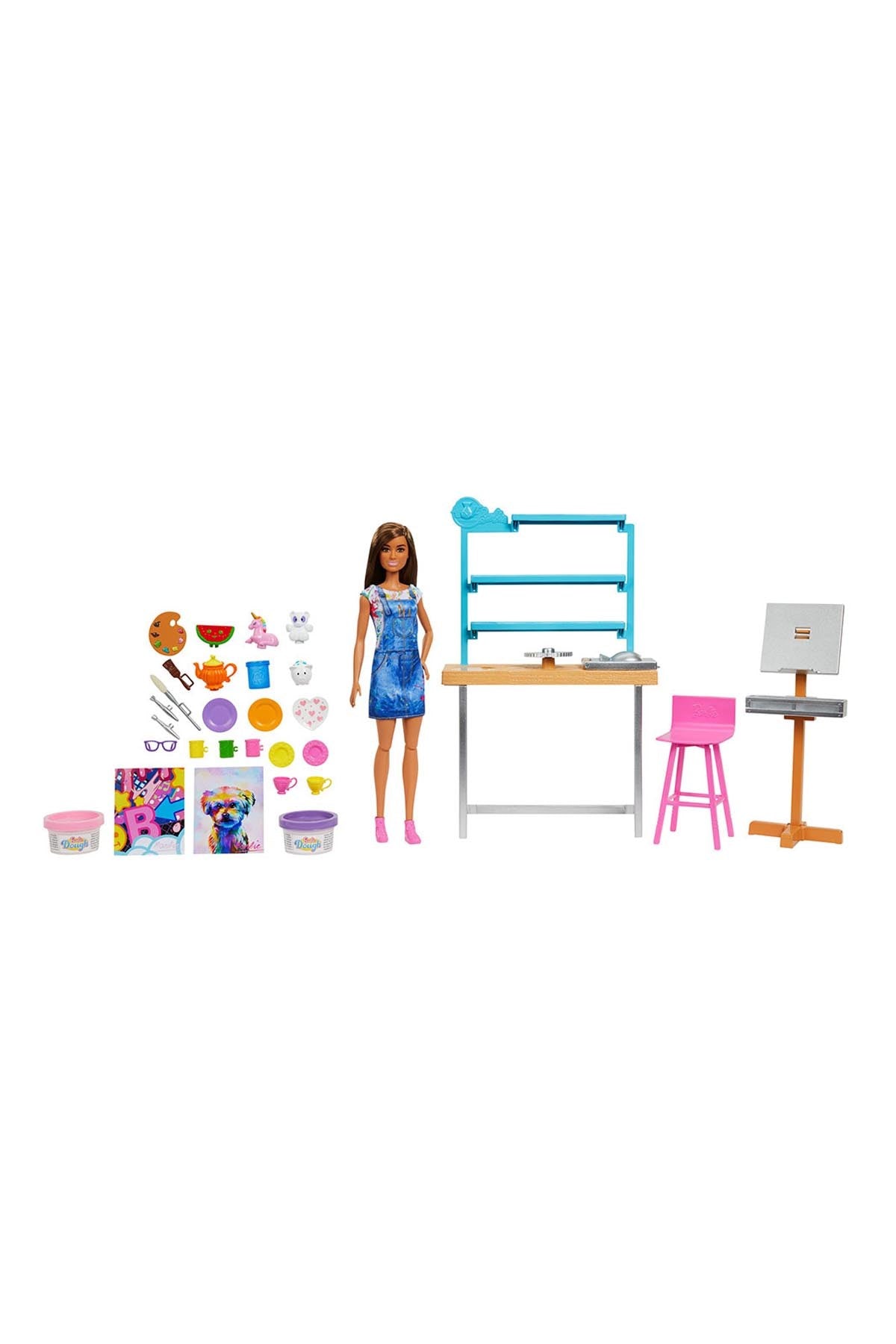 Çocuklar Barbie'nin Sanat Atölyesi'nde Barbie ile çok eğlenecek! Çocuklar, aynı zamanda çömlek ve resim yaparken rahatlamayı öğrenecek! Barbie bebeğin oyun hamurunu kaptan çıkararak başlayın ve top haline getirin. Oyun hamurunu vazo kalıbına yerleştirin. Bastırın ve yeni eserinizi hazırlayın! Vazoyu platforma yerleştirip bir damga seçin (kalpler veya yıldızlar). Platformu çevirerek oyun hamurunu şekillendirin ve bitirdiğinizde eserinizi rafa yerleştirin. Sünger fırçayı "soğuk suya" batırın ve beyaz renkli parçaları boyayarak başyapıtınızı oluşturun: Küçük domuzun sırtına mavi benekler koyun, kalp şekilli tabağa pembe kalpler yerleştirin, ayıcığın gözlerini mora boyayın. Eserlerinizi rafa yerleştirin ve keyifle sergileyin! Çocuklar oyun hamuruyla tekrar tekrar oynayarak yaratıcılıklarını konuşturma fırsatı bulabilir!