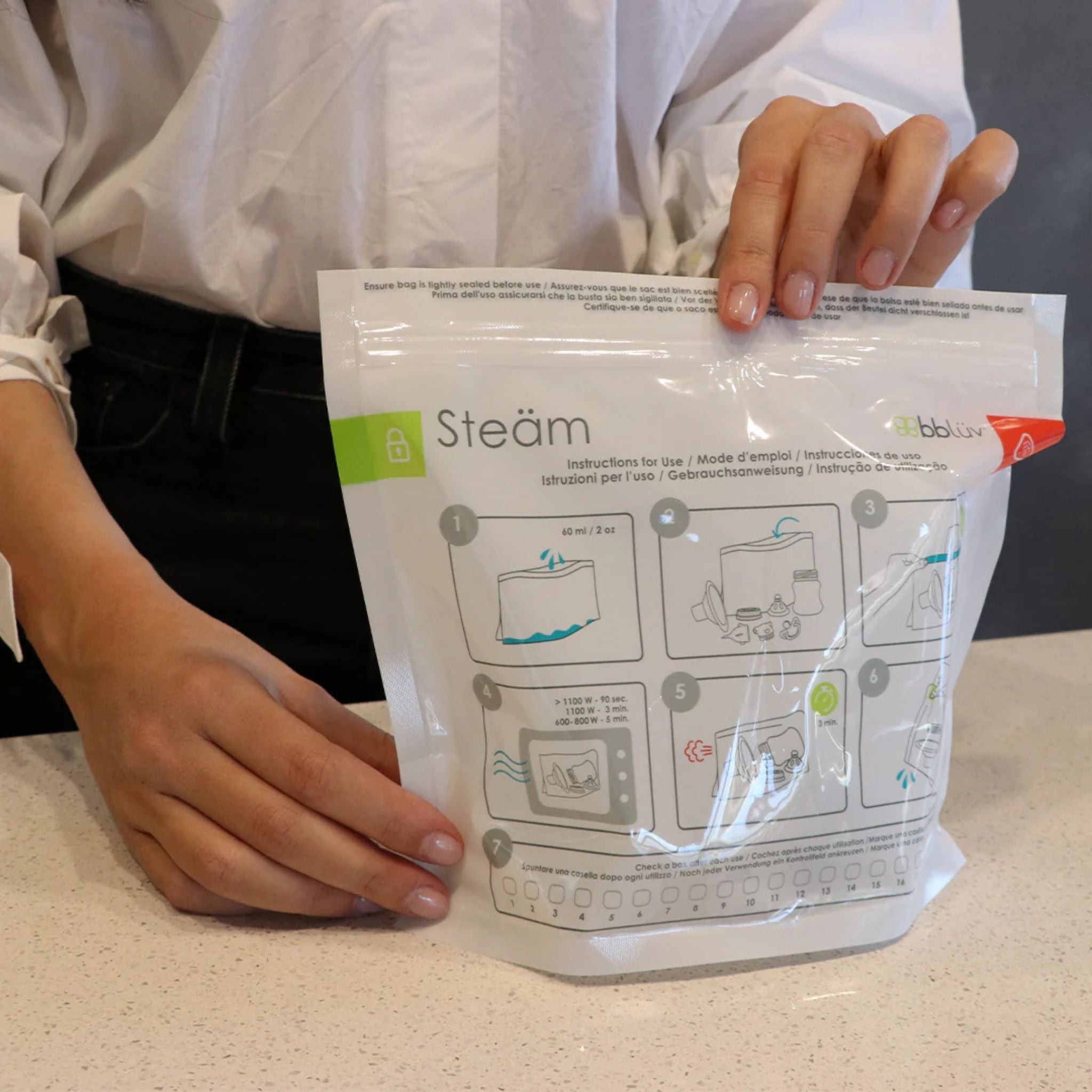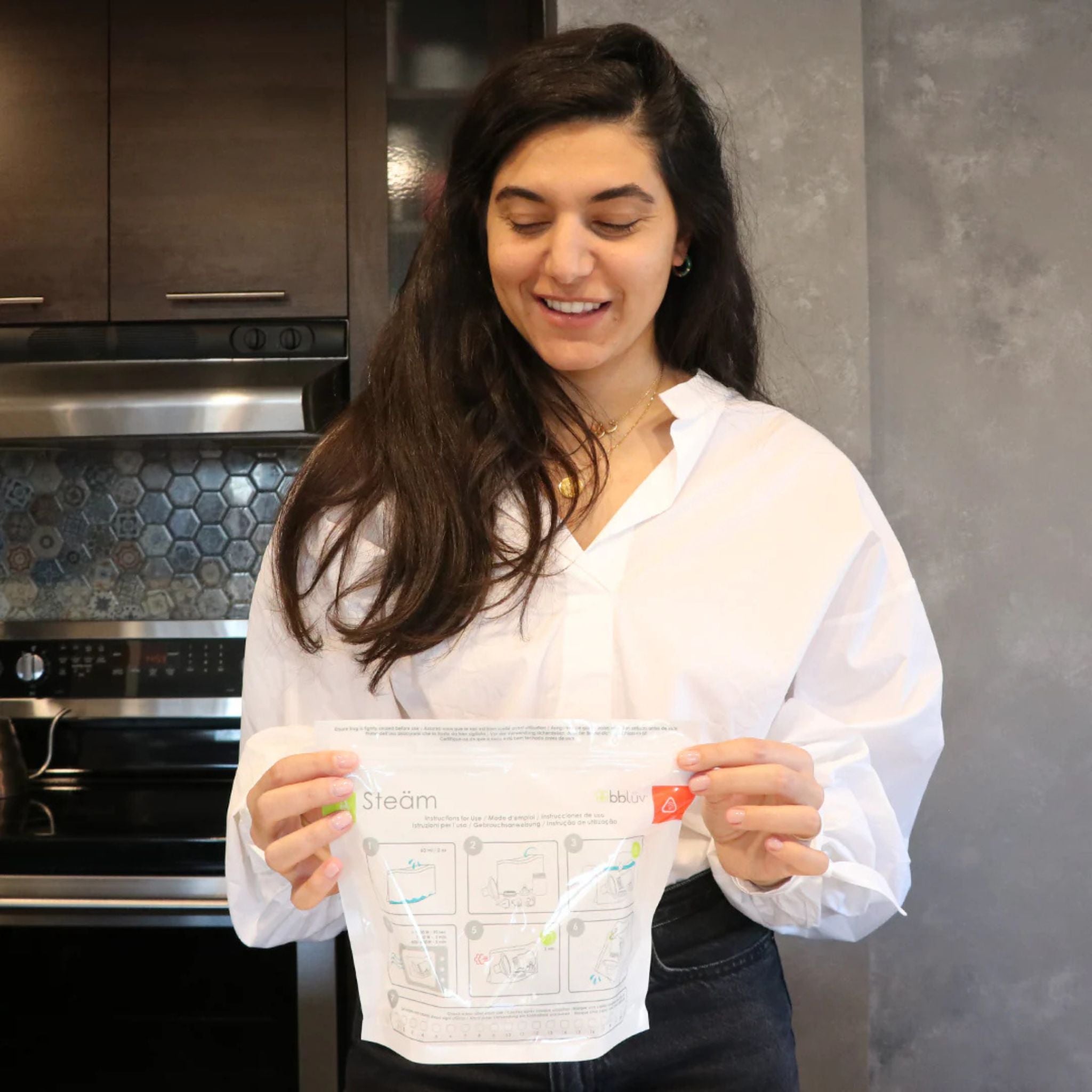 Bblüv Steäm Mikrodalga Sterilizasyon Poşeti; tüm sterilizasyon ihtiyaçlarınızı kolay, hızlı ve rahat hale getirir. bblüv steam mikrodalga poşeti biberonlarınızı, emziklerinizi, göğüs pompası parçalarınızı veya diğer bblüv ürün bileşenlerini sterilize etmek istiyorsanız, Mikrodalga Hızlı Buhar Bblüv Sterilizasyon torbası bakteri ve mikropları dakikalar içinde etkili bir şekilde yok eder! Birlikte verilen 6 torbanın her biri, her torbanın üzerinde basılmış takip edilmesi kolay talimatlarla toplam 120 sterilizasyon döngüsü için 20 defaya kadar yeniden kullanılabilir. Bblüv Steam ile nerede olursanız olun, siz ve bebeğiniz için her şeyi temiz ve güvenli hale getirmek kolaydır. Bblüv steam mikrodalga sterilizasyon poşeti annelerin onayından geçecektir!