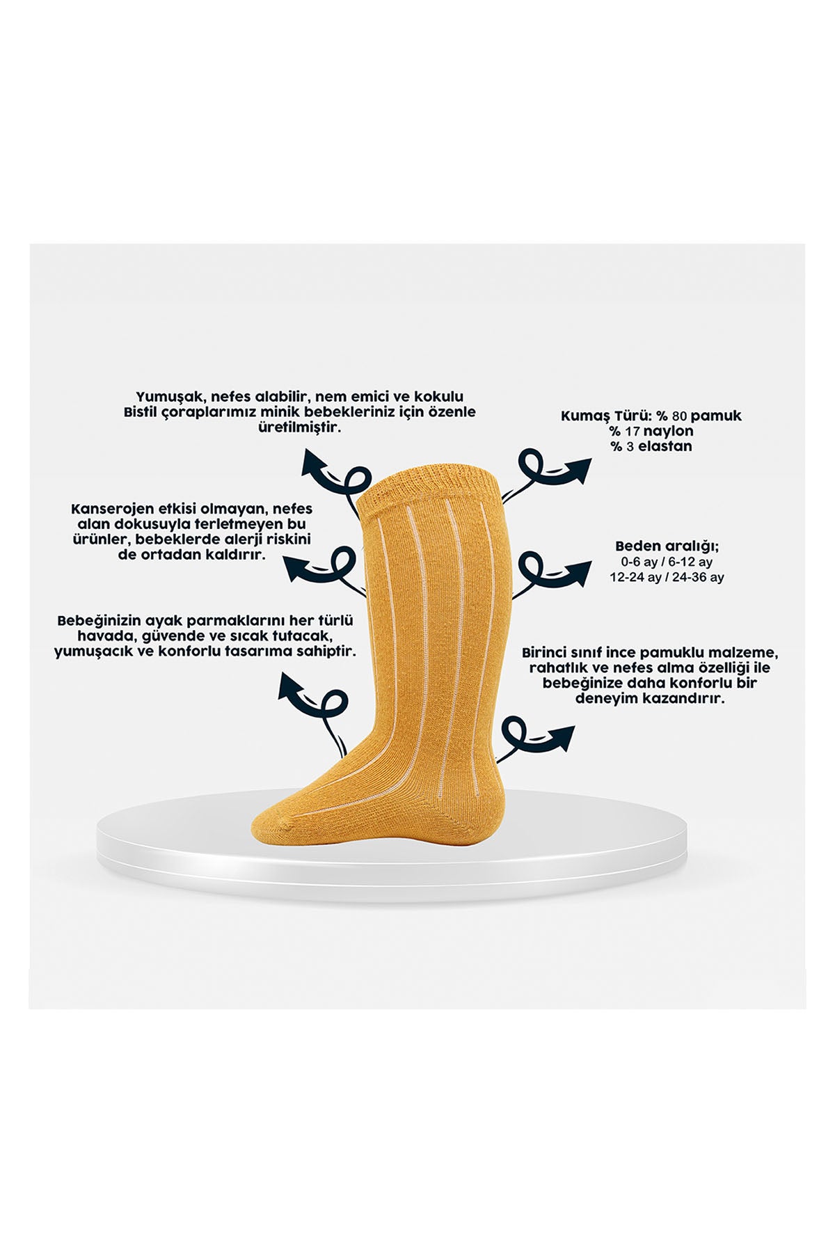 Günlük kullanımda yumuşak dokusu ve nefes alabilir yapısıyla konfor sunan Bistyle Dizaltı bebek çorapları, minik ayakları nazikçe sarar. Esnek ribana bilekler iz yapmadan kavrar; pürüzsüz dikiş yapısı tahrişi azaltmaya yardımcı olur. Renkli karamel ton kombinleriyle kolayca her kıyafetle eşleşir.