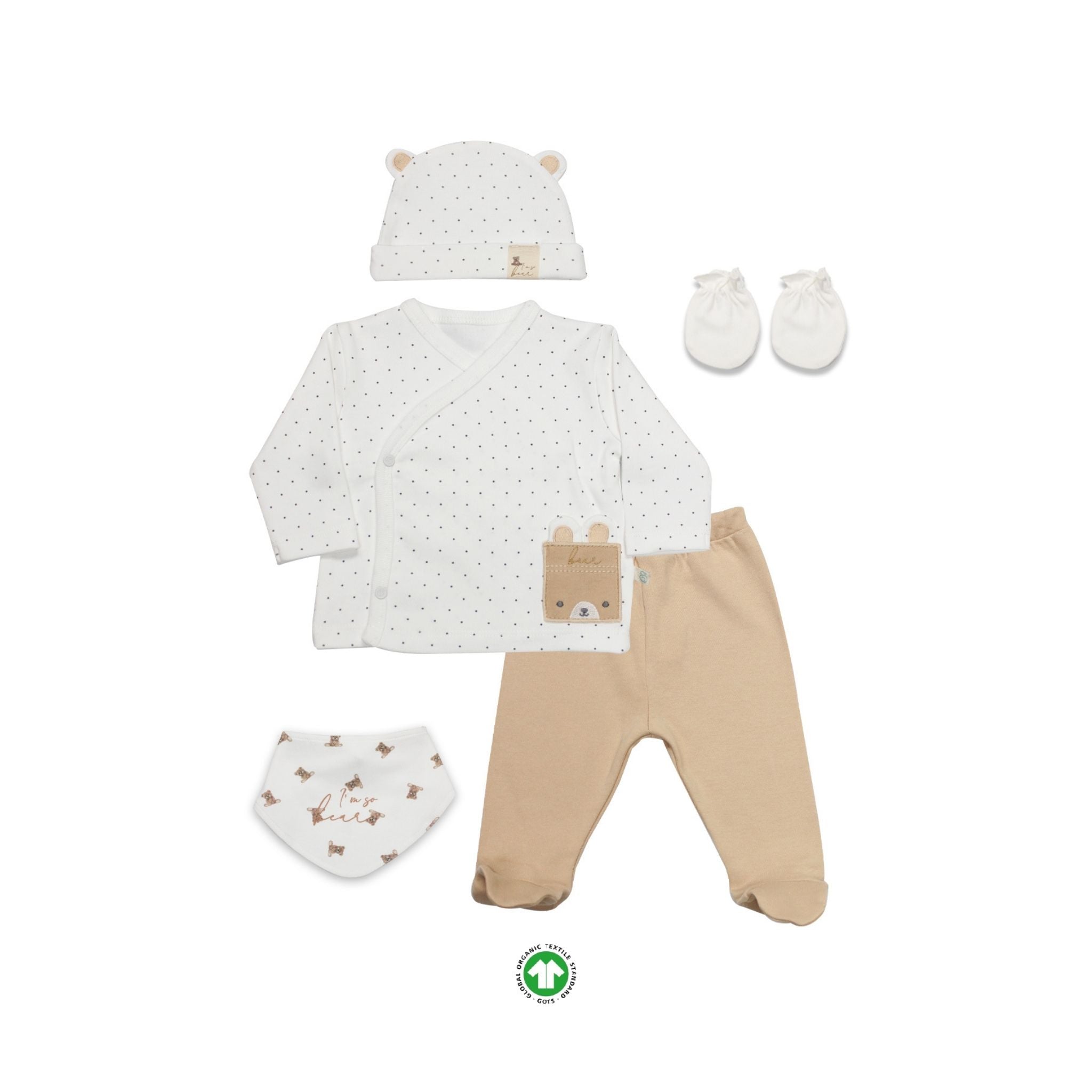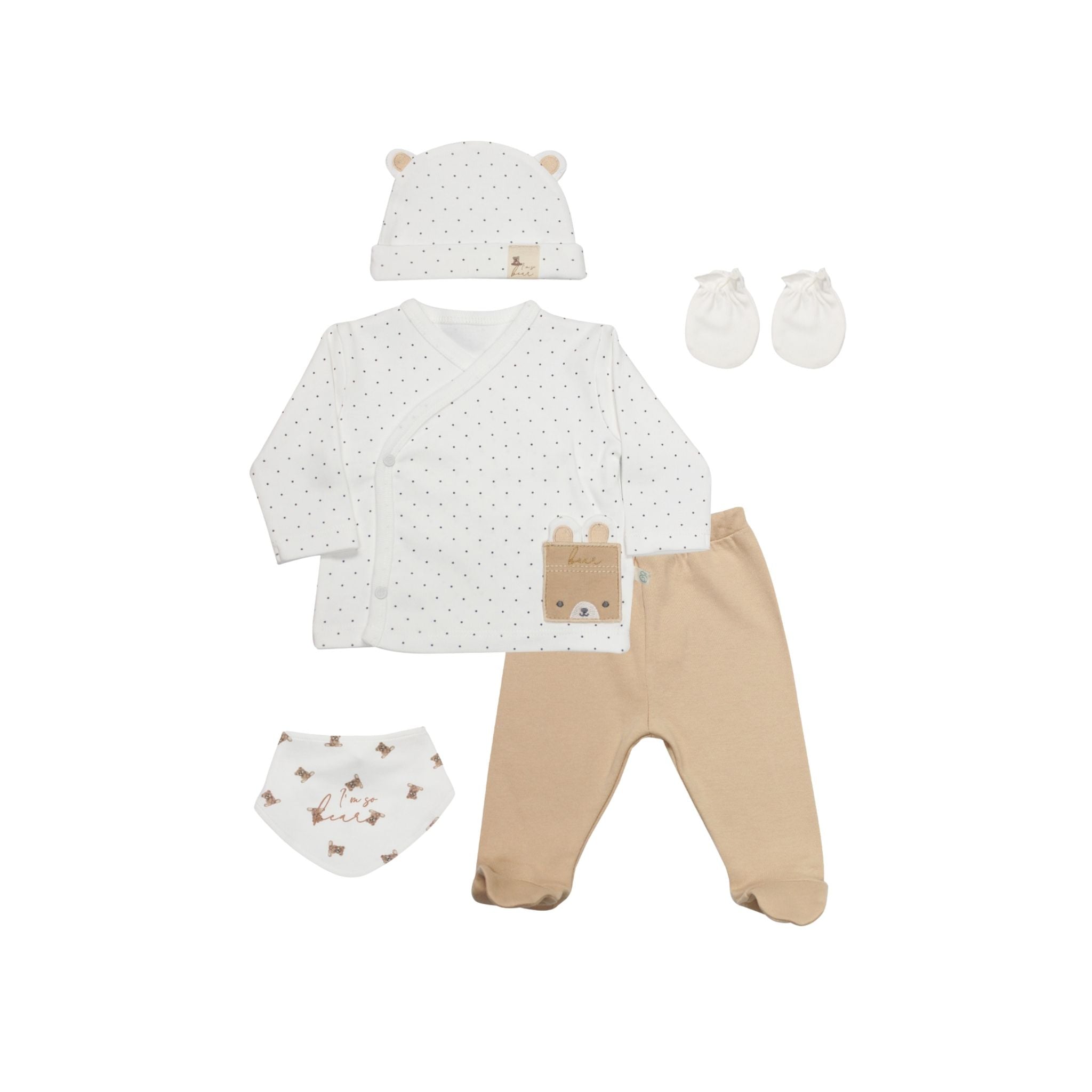 Bistyle I Am So Bear 5’li Hastane Çıkışı, yenidoğan bebekler için özenle hazırlanan, şıklığı ve konforu bir araya getiren özel bir settir. Sevimli ayıcık temalı detayları ve doğadan ilham alan bej tonlarıyla hem sade hem de modern bir stil sunar. %100 pamuklu yapısı sayesinde hassas bebek cildine tamamen uyum sağlar, yumuşak dokusuyla maksimum konfor sunar. İçeriğinde bulunan her parça doğum sonrası bebeğin temel ihtiyaçlarına yönelik olarak seçilmiştir. Günlük kullanım için ideal olan bu set, aynı zamanda zarif bir doğum hediyesi alternatifi olarak da tercih edilebilir. 30 derece makinede yıkanabilir ve uzun süre formunu korur.
