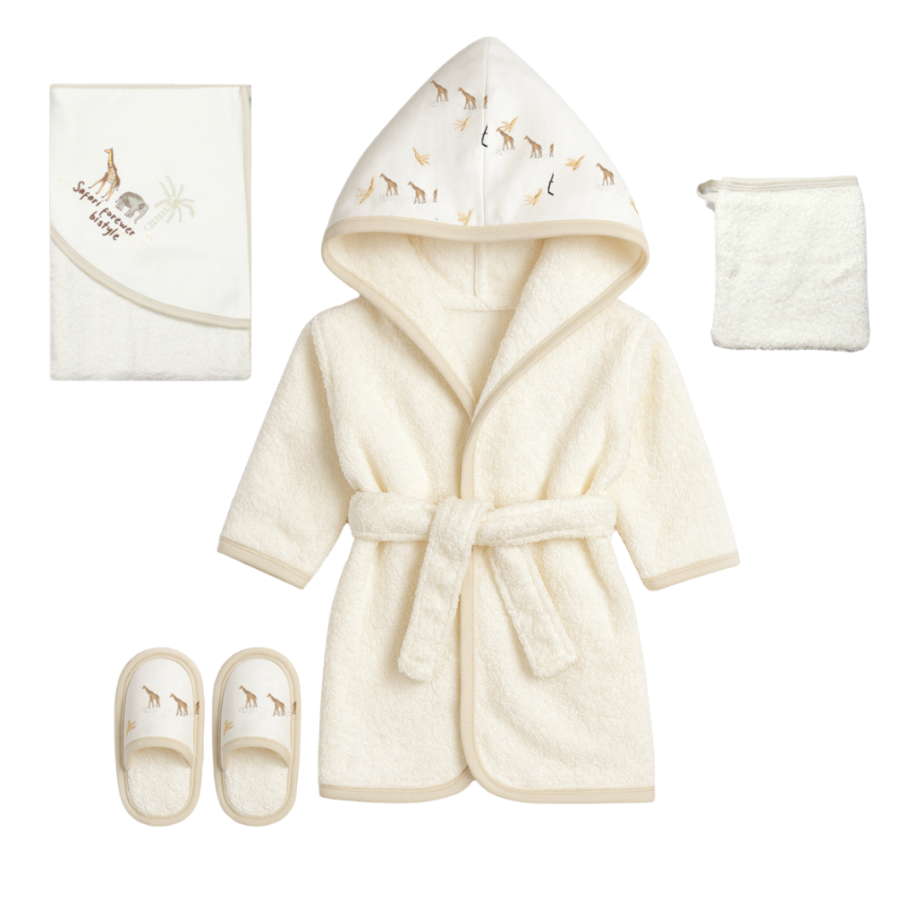 Bistyle Bornoz Seti Safari Forever, bebeğinizin banyo sonrası konforunu artırmak için tasarlanmış şık ve kullanışlı bir bebek banyo setidir. %100 pamuk havlu kumaştan üretilen bu set, yüksek emiciliğe sahip yapısı sayesinde bebeğinizin cildini nazikçe kurular ve hassas ciltler için güvenli bir kullanım sunar. Set içerisinde kapüşonlu bebek bornozu, kapüşonlu banyo havlusu, yumuşak havlu kesesi ve bebek terlikleri bulunmaktadır. Kapüşonlu bornoz tasarımı bebeğin başını sıcak tutmaya yardımcı olurken belden bağlama detayı sayesinde kolay ve pratik bir kullanım sağlar. Kapüşon kısmında yer alan sevimli safari temalı zürafa ve hayvan desenleri ürüne doğal ve eğlenceli bir görünüm kazandırır. Sete dahil olan kapüşonlu banyo havlusu, bebeğinizi banyodan sonra kolayca sarıp kurulayabilmeniz için idealdir. Yumuşak havlu kesesi bebeğinizin hassas cildi için nazik temizlik sunarken, terlikler banyo sonrası minik ayakların sıcak kalmasına yardımcı olur. Hem günlük kullanım hem de yeni doğan hediye seti olarak tercih edilebilecek bu ürün, fonksiyonel parçaları ve sevimli safari temasıyla bebeğiniz için konforlu bir banyo deneyimi sunar.