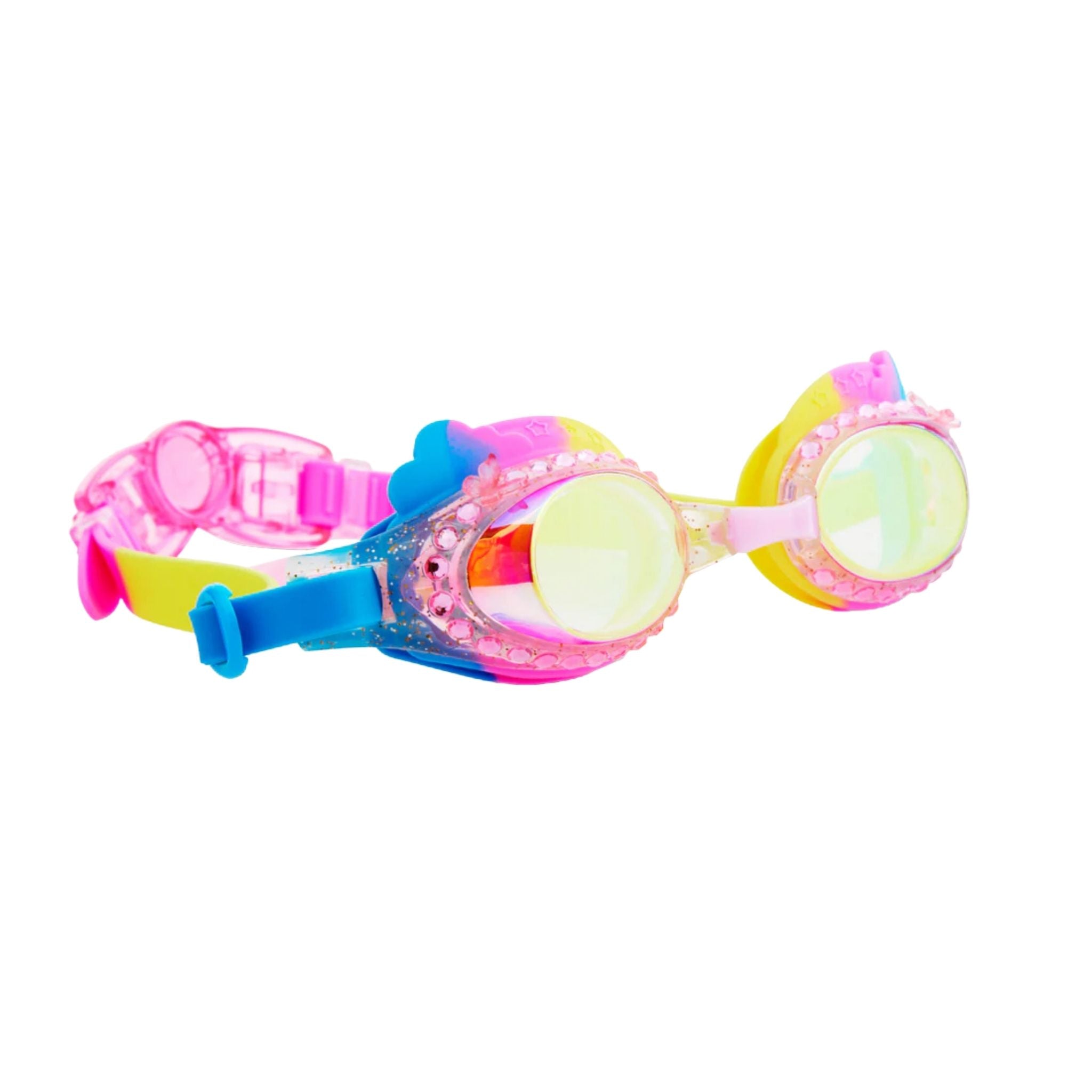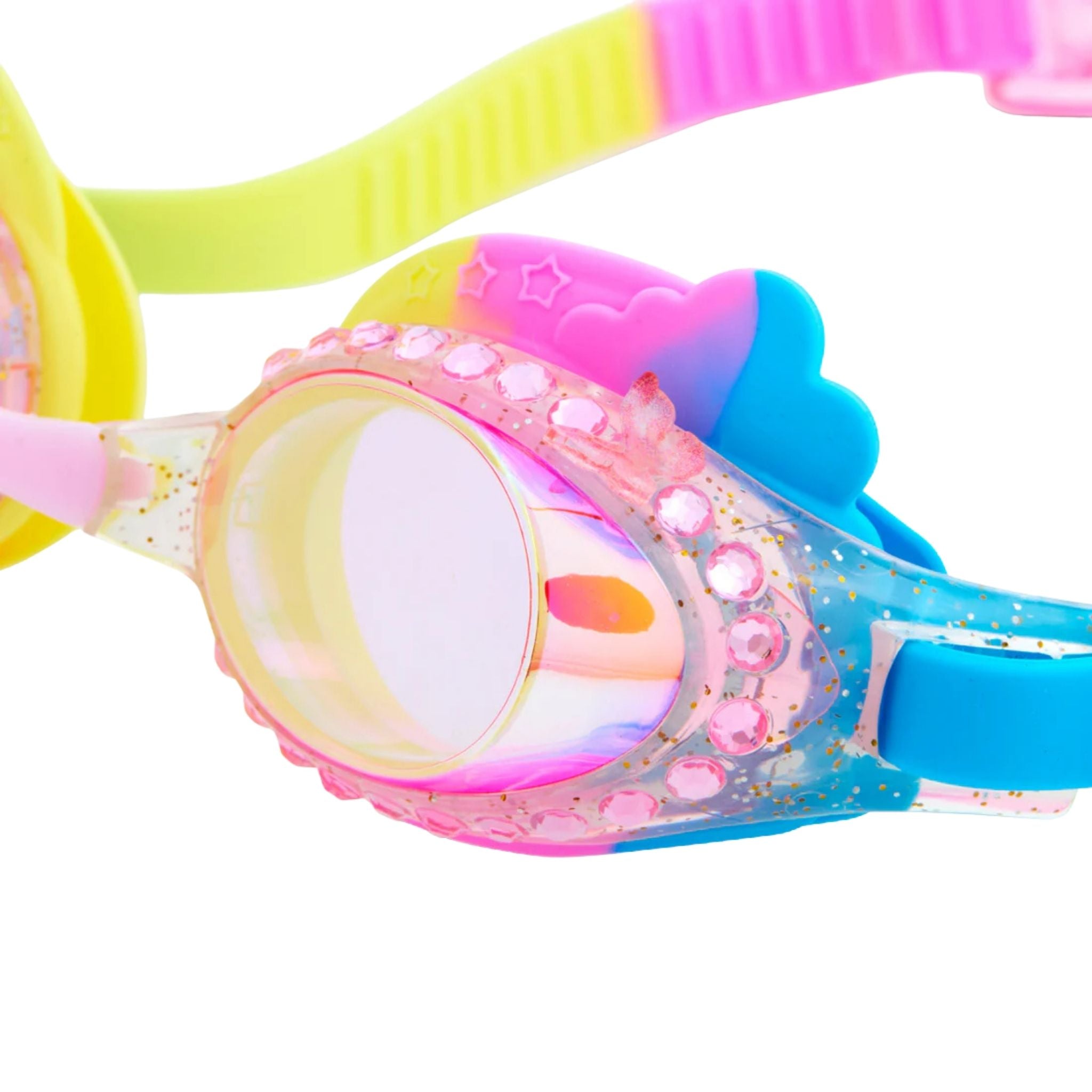 Renkli Bulutlar Gökkuşağı Çocuk Yüzücü Gözlüğü, çocukların hayal dünyasını yansıtan eğlenceli tasarımıyla yaz tatilinin favorisi olmaya aday. Parıltılı çerçevesi, yapay elmas detayları ve bulut formundaki sevimli contası ile bu gözlük, minik yüzücülere hem konfor hem de büyüleyici bir stil sunar. Uçan bir kelebek detayı ise her yüzüşe sihirli bir dokunuş katar. 3 yaş ve üzeri çocuklar için uygun olan bu yüzme gözlüğü, UV korumalı ve buğu önleyici lensleri sayesinde güvenli ve net bir görüş sağlar. %100 silikon ve lateks içermeyen yapısıyla yumuşak, esnek ve cilt dostudur. Ayarlanabilir baş kayışı, her çocuk için ideal uyumu sağlar. Renkli Bulutlar Gökkuşağı Yüzücü Gözlüğü ile çocuğunuzun yüzme anları masalsı bir serüvene dönüşsün! Stil, eğlence ve koruma tek bir gözlükte buluşuyor.