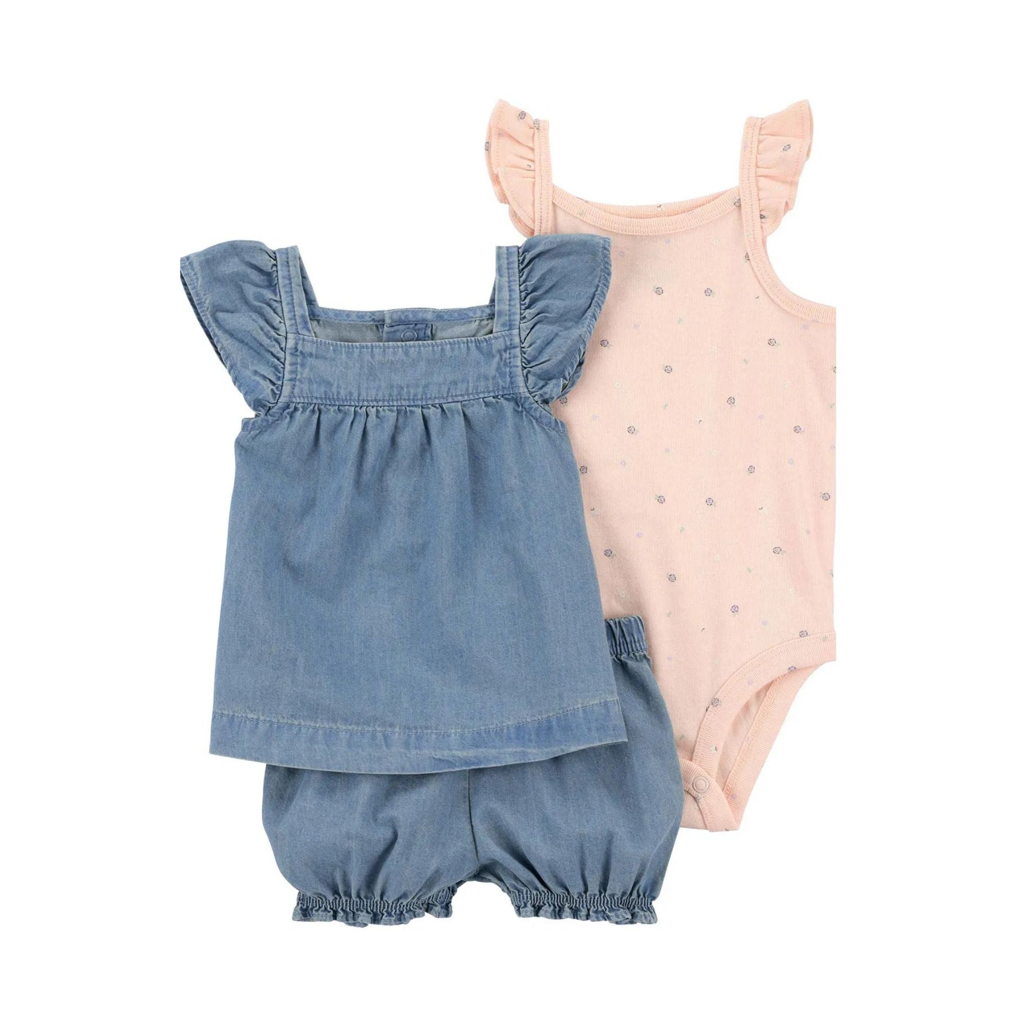 Yaz aylarında bebeklerin konforunu ve şıklığını bir araya getiren 3 parçalı şambre kıyafet seti, pratik kullanım özellikleri ve yumuşak dokusuyla öne çıkıyor. Fırfırlı kollara sahip şık üst, elastik bel bandıyla rahat bir şort ve bebeklerin cildine dost %100 pamuklu body ile tamamlanan bu set, günlük kullanım için idealdir. Şık tasarımıyla öne çıkan bu set, hem evde hem dışarıda kullanıma uygundur.