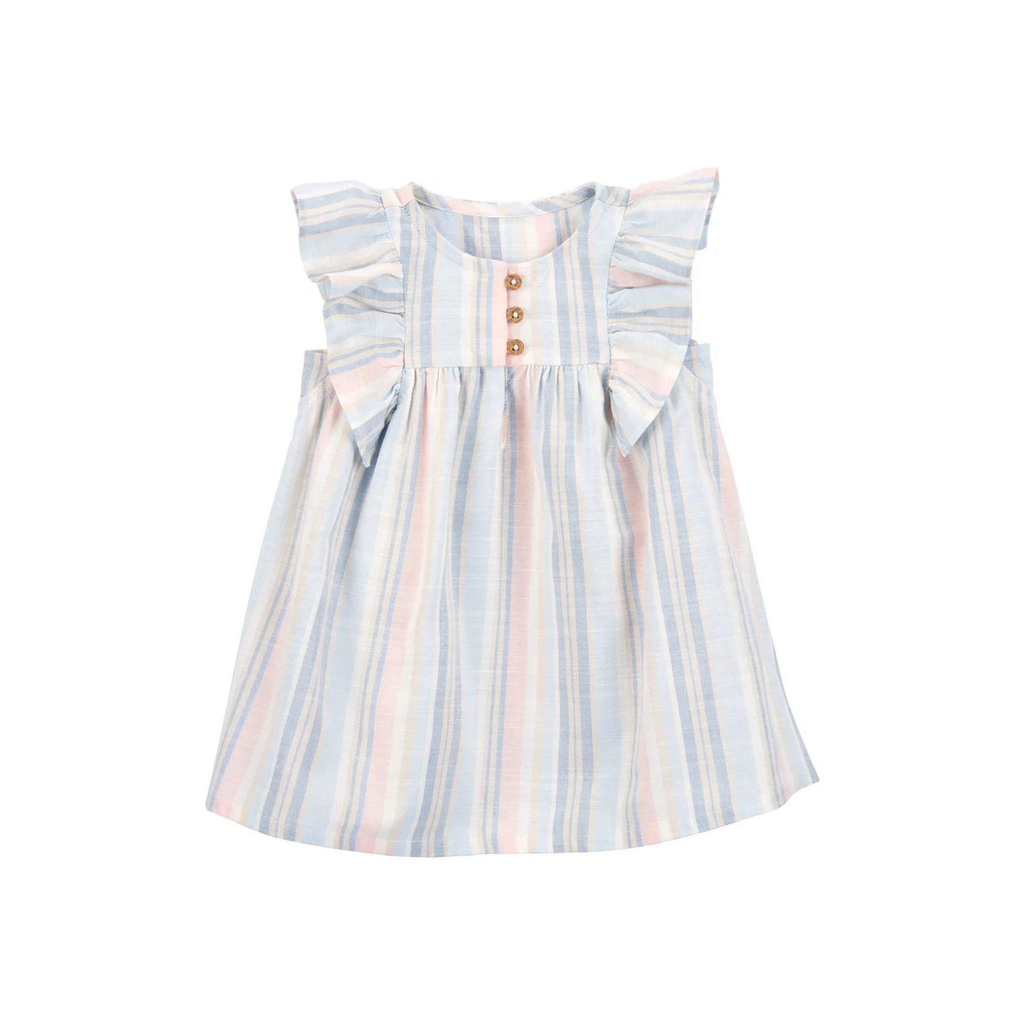 Carter's kız bebek elbise, doğal dokunuşları şık tasarımla buluşturarak yaz aylarında bebeğiniz için vazgeçilmez bir parça sunuyor. Çizgili desenlerle hareketlenen tasarım, volan kol detaylarıyla bebeğinizin stilini tamamlar. Kolsuz yapısı sıcak havalarda rahatlık sağlarken, yaka kısmında bulunan üç düğme zarif ve pratik bir kullanım sunar. Sürdürülebilirlik ilkesiyle üretilen ve doğa dostu olan %69 Lenzing™ Ecovero™ viskon ve %31 pamuk karışımı kumaşı sayesinde, bebeğinizin hassas cildine nazikçe uyum sağlar. Ayrıca sete dahil edilen uyumlu külot, bebek bezinin düzgün kalmasını sağlayarak bebeğinize gün boyu maksimum konfor sunar. Oeko-Tex sertifikasına sahip olan kumaşıyla sağlıklı ve güvenli bir seçimdir.