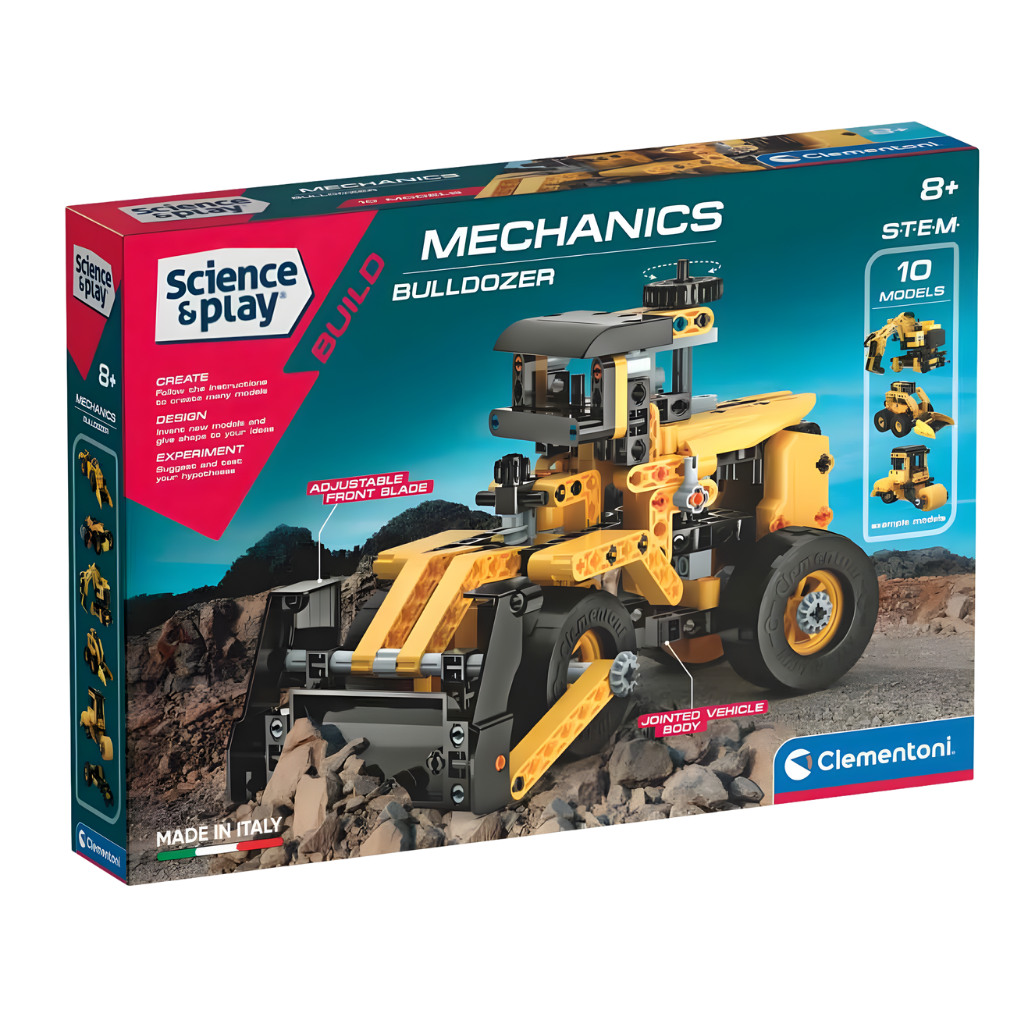 Clementoni Mekanik Laboratuvarı Buldozer, 8 yaş ve üzeri çocuklar için mekaniğin temel prensiplerini uygulamalı olarak keşfetmeye imkân tanıyan kapsamlı ve eğitici bir bilim setidir. Kaldıraçlar, dişliler ve makaralarla yapılan deneyler sayesinde çocuklar, gerçek mühendislik çözümlerinin nasıl çalıştığını adım adım öğrenir. Forklift, portal vinç, geleneksel vinç ve farklı kaldırma sistemleri gibi modellere uzanan bu yapı laboratuvarı, mekanik düşünmeyi destekleyen zengin bir kurulum süreci sunar. Çocuklar el becerilerini kullanarak parçaları bir araya getirirken aynı zamanda hipotez kurma, deneme ve sonuç çıkarma becerilerini geliştirir. İtalya’da tasarlanan ve geliştirilen bu set, öğrenmeyi kalıcı ve keyifli hale getiren bir STEM deneyimi sunar. Clementoni tarafından geliştirilen Techno-Logic Laboratuvarları serisinin bir parçası olan bu set, Bilim, Teknoloji, Mühendislik ve Matematik alanlarını oyunla birleştirir. Diferansiyel, kremayerli direksiyon ve kardan mafsalı gibi ileri seviye mekanik bileşenler sayesinde çocuklar, gerçek şantiye ve taşıma makinelerinin çalışma mantığını somut olarak deneyimler. Farklı modelleri inşa ederken her kurulum, yeni bir problem ve çözüm süreci sunarak yaratıcılığı ve analitik düşünmeyi destekler.