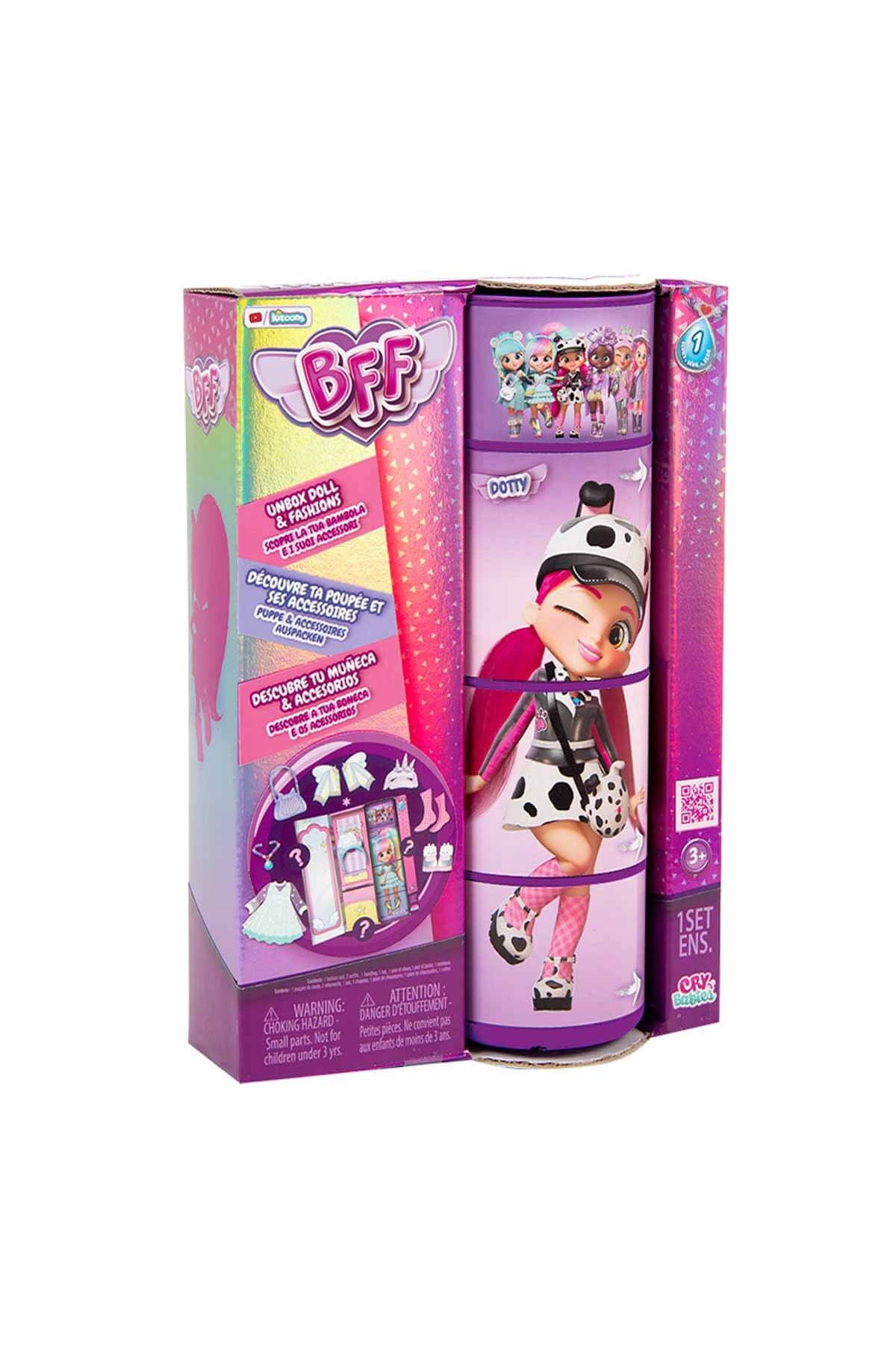 Cry Babies BFF ailesinin hayvanları ve şarkı söylemeyi çok seven karakteri Cry Babies BFF Bebeklers 1 Dotty kızlarla buluşmaya hazır! 20 cm uzunluğundaki Dotty’nin pembe ve ipeksi saçları tam 15 cm uzunluğunda! Üstelik tam altı farklı eklemi hareket ettirilebiliyor. Kutusu ise açıldıktan sonra gardıroba dönüşüyor. Kızlar Cry Babies BFF Dotty’nin trend kıyafetlerine bayılacaklar ve onunla zaman geçirmeyi çok sevecekler. Cry Babies BFF çizgi serisini Kitoons Türkiye kanalında, bebekleri ise gerçek hayatta kızlarla buluşuyor! Cry Babies Bff Bebekler, çocukların yaratıcılıklarının ve yeni hikayeler oluşturarak hayal güçlerinin gelişmesine katkı sağlar. Arkadaşlarıyla oynayacakları oyunlar sosyalleşmelerine katkı sağlar.