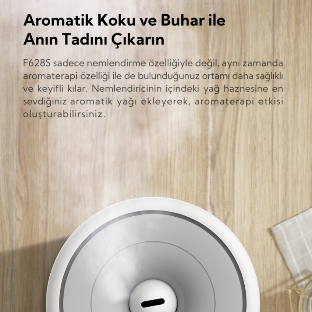 Deerma F628S Ultraviyole (UVC) Soğuk Buhar Makinesi, yaşam alanlarında ideal nem dengesini sağlamak için geliştirilmiş yüksek kapasiteli ve sessiz bir hava nemlendiricisidir. Ultrasonik soğuk buhar teknolojisi sayesinde havadaki nem oranını dengelerken, UVC özelliği ile suyun hijyenik kalmasına katkı sağlar. Özellikle bebek odaları, yatak odaları ve geniş yaşam alanları için konforlu bir kullanım sunar. 5 litrelik geniş su haznesi sayesinde tek seferde uzun süreli kullanım imkânı sunar. Şeffaf su seviye göstergesi ile haznedeki su miktarı kolayca takip edilebilir ve ihtiyaç halinde pratik şekilde su eklenebilir. Düşük enerji tüketimi ve sessiz çalışma yapısı ile gün boyu ve gece kullanımına uygundur. Aromaterapi özelliği sayesinde ortama hoş bir koku yayılmasına imkân tanır. Uygun aromatik yağlar eklenerek daha ferah ve rahatlatıcı bir ortam oluşturulabilir. Dijital ekranı üzerinden sıcaklık ve nem değerleri anlık olarak takip edilebilir ve hedeflenen nem oranı kolayca ayarlanabilir.