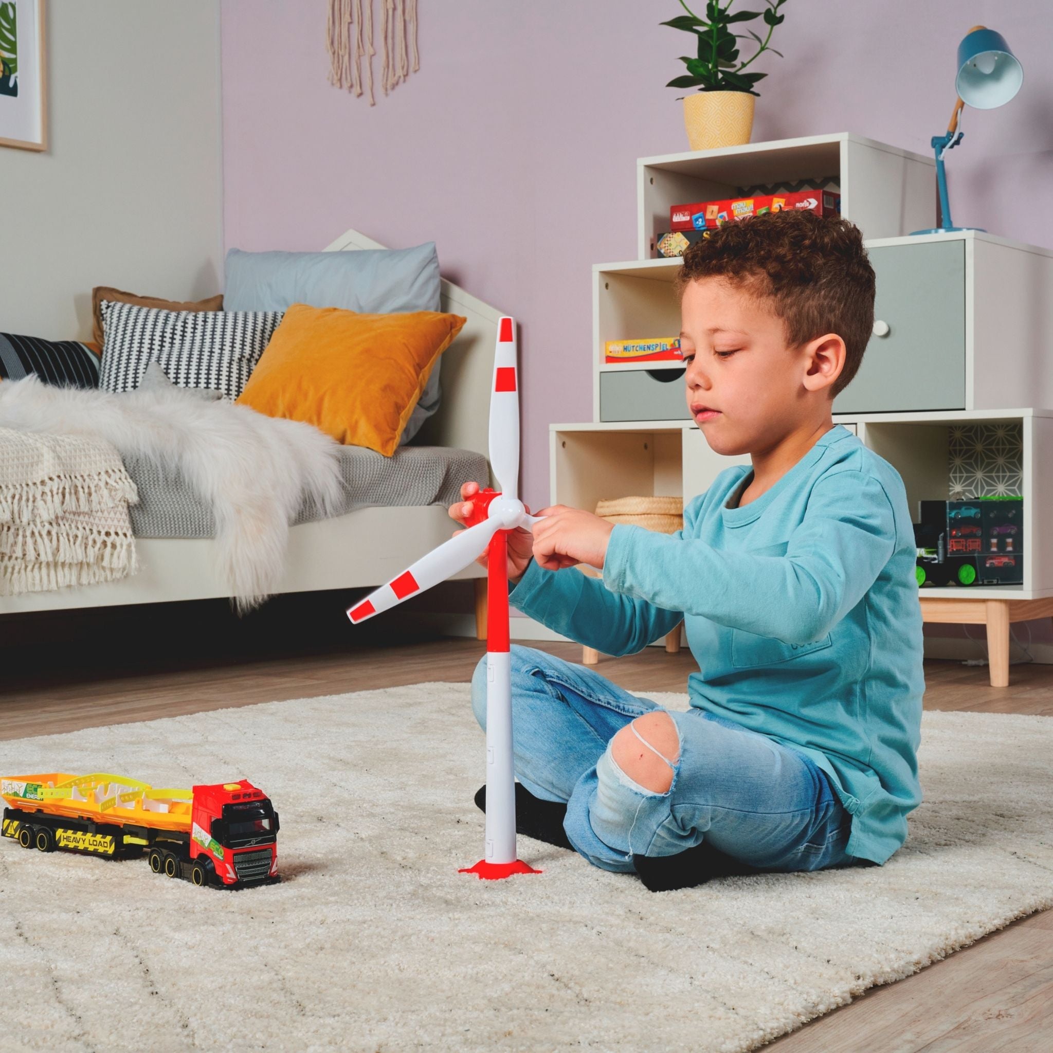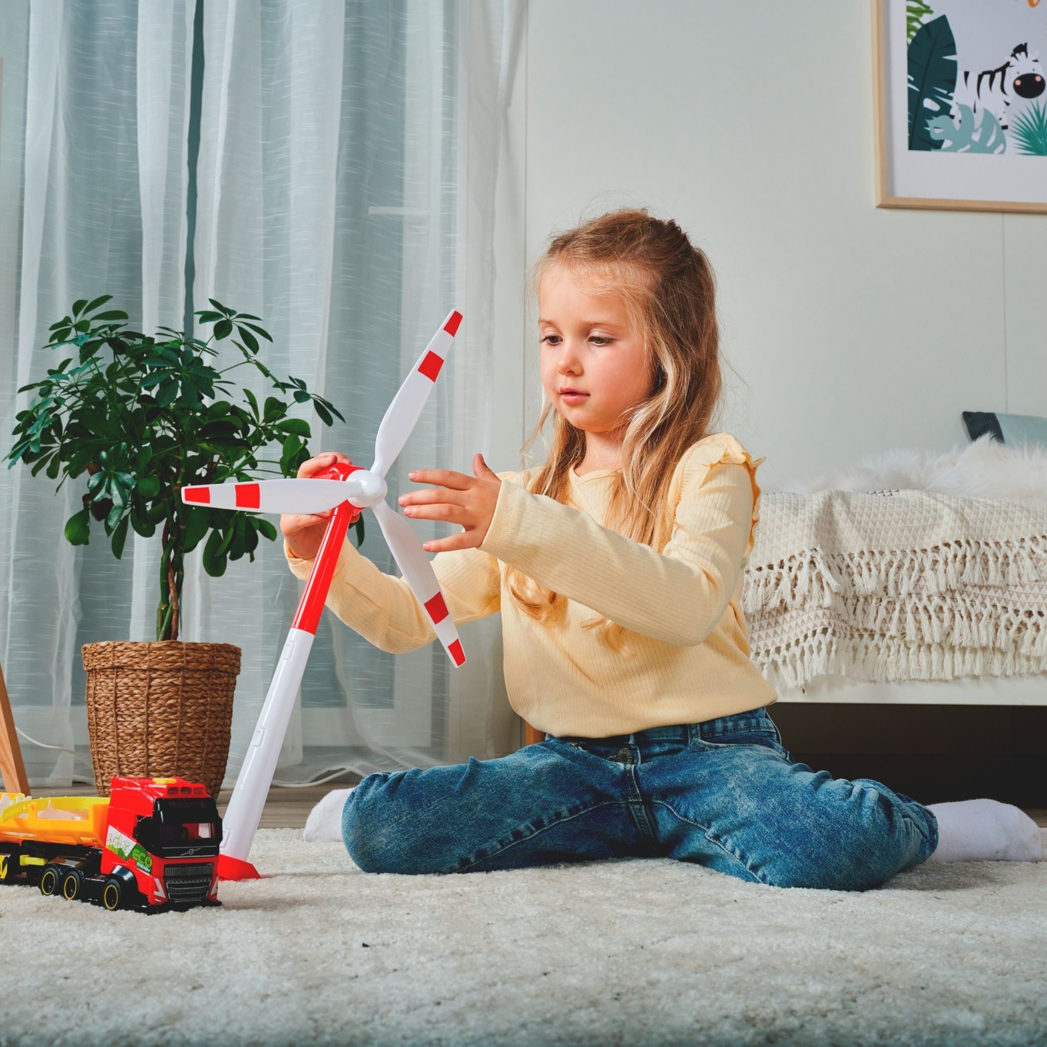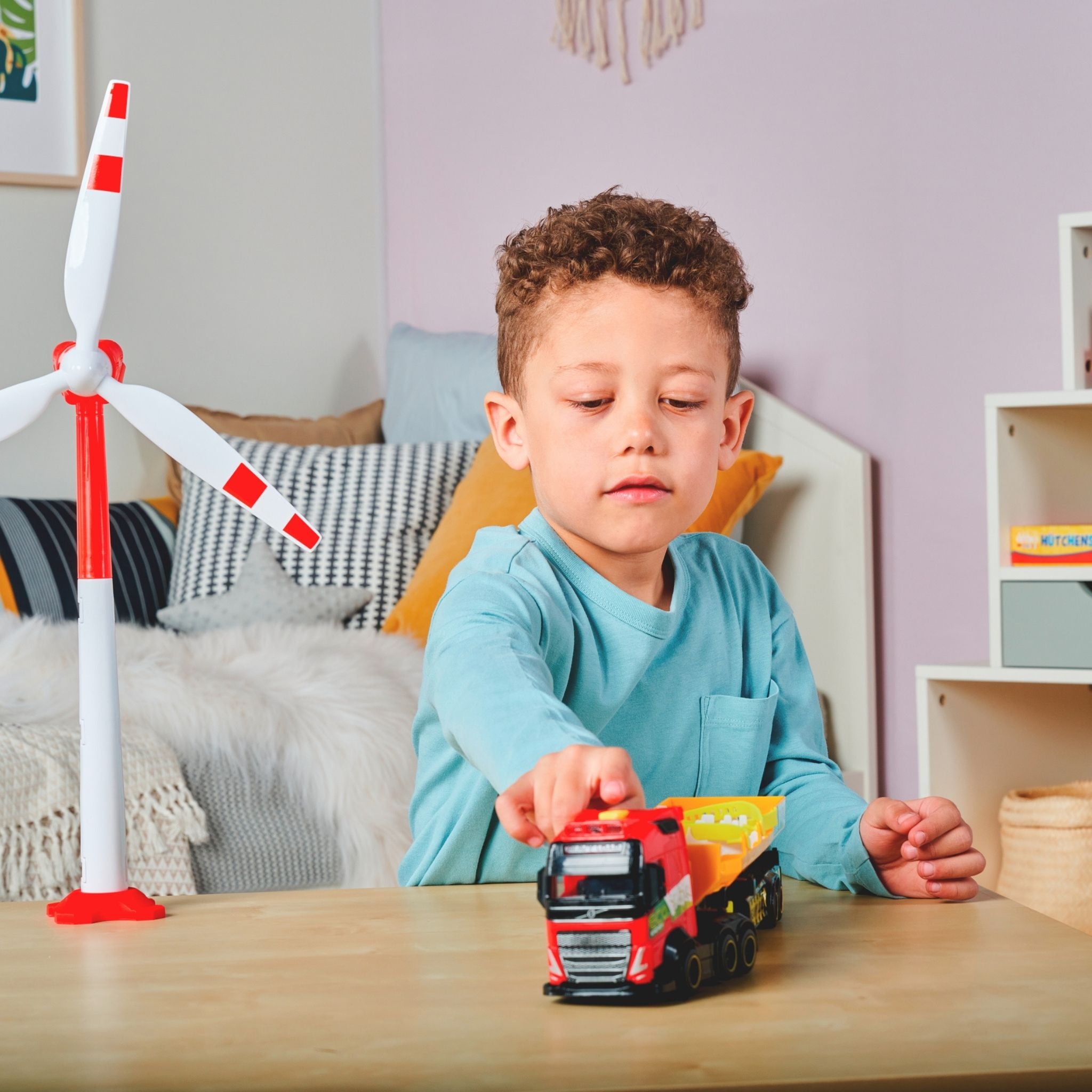 Gerçek Volvo lisansına sahip Dickie Ağır Yük Kamyonu, çocuklara yeşil enerji temalı bir oyun deneyimi sunar. Bu dev kamyon, 51 cm yüksekliğinde bir rüzgâr türbinini taşıyarak inşaat ve enerji dünyasını oyun alanına getirir. Kurmalı motor sistemi, rotor kanatlarının kendi kendine dönmesini sağlar ve oyunlara gerçekçilik katar. Işık ve ses efektleriyle donatılan kamyon, çocukların dikkatini çekerken interaktif eğlence sunar. Bu etkileyici set, çocuklara hem eğlenceli hem de öğretici bir oyun deneyimi yaşatır. Gerçekçi detayları, devasa boyutu ve işlevsel tasarımıyla Dickie Ağır Yük Kamyonu, küçük mühendislerin ve doğa dostu kahramanların favorisi olacak.