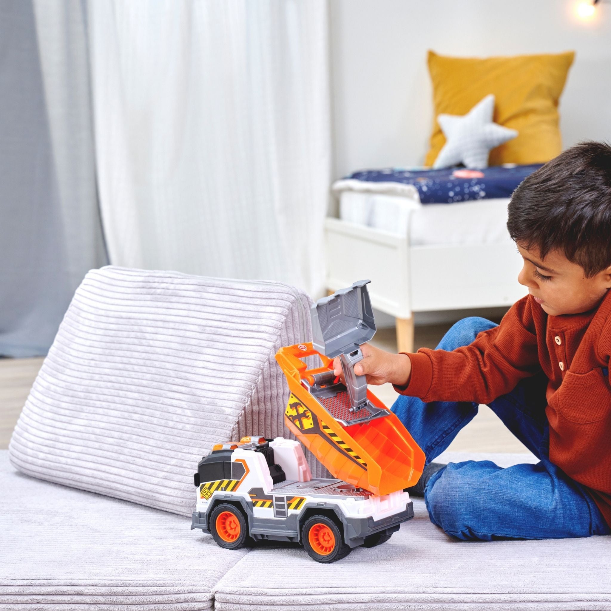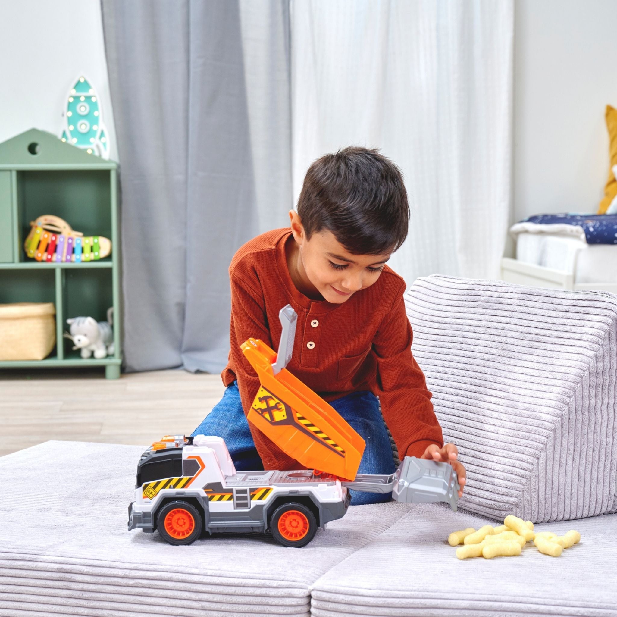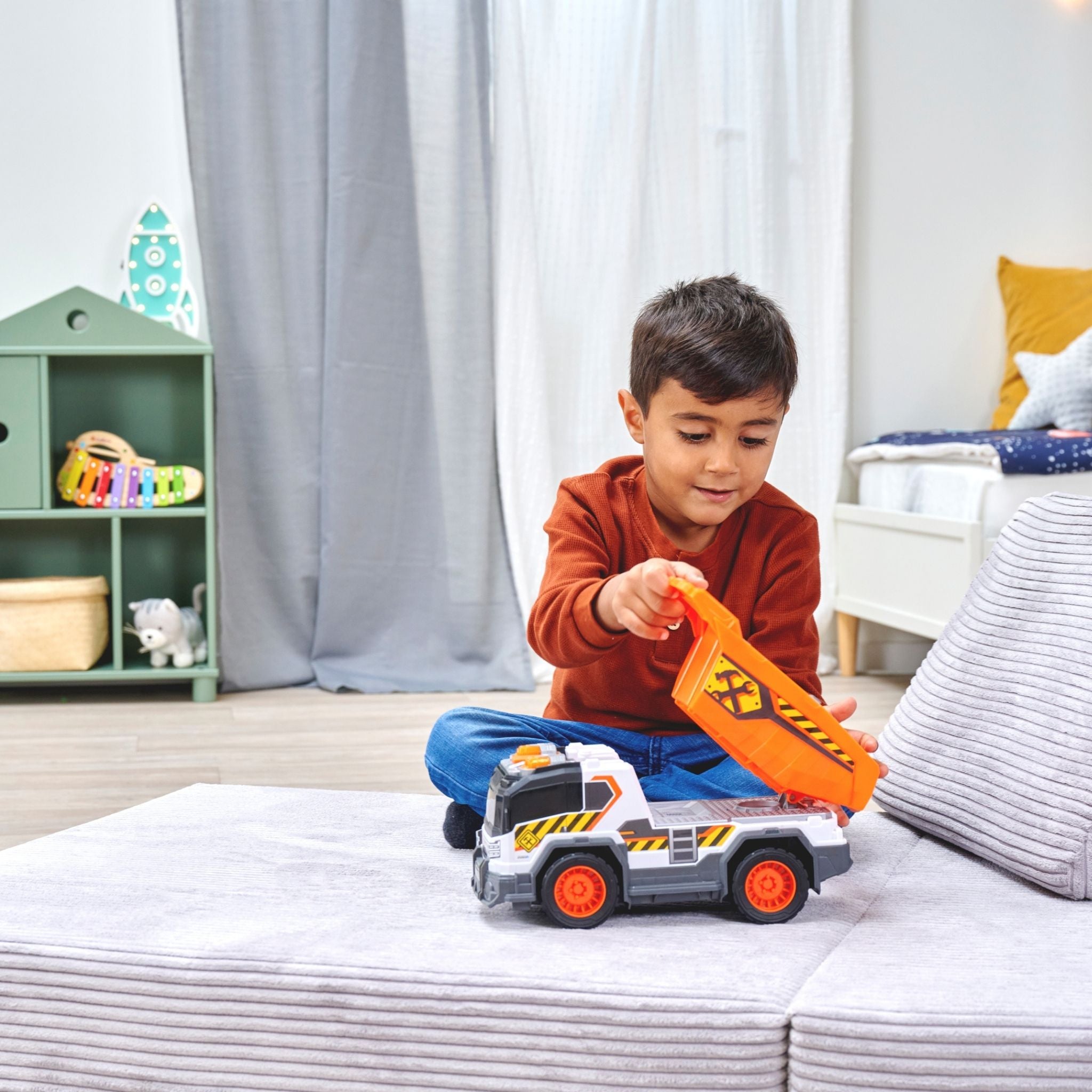Dickie çöp kamyonu, çocukların gerçek hayattaki belediye araçlarını yakından tanımasını sağlayan, detaylı ve etkileşimli bir oyuncak modelidir. Günlük temizlik ve geri dönüşüm süreçlerini oyunla birleştiren bu kamyon, ışıklı ve sesli özellikleriyle çocukların dikkatini çekerken uzun süreli ve eğlenceli bir oyun deneyimi sunar. Yaklaşık 30 cm uzunluğa sahip olan Dickie çöp kamyonu, büyük ve sağlam yapısı sayesinde hem iç hem de dış mekân oyunları için uygundur. Serbest tekerlek sistemi, kamyonun farklı zeminlerde rahatça hareket etmesini sağlarken manuel kaldırma ve boşaltma mekanizması, gerçek bir çöp toplama sürecini taklit eder. Bu özellik, çocukların el-göz koordinasyonunu ve ince motor becerilerini destekler. Işıklı ve sesli fonksiyonlar, oyuna gerçekçilik kazandırır. Motor çalıştırma sesi, geri vites uyarısı ve çöp boşaltma efektleri sayesinde çocuklar kendilerini adeta gerçek bir çöp kamyonu kullanıyormuş gibi hisseder. Ürünle birlikte gelen aksesuarlar, oyun senaryolarını zenginleştirerek hayal gücünü geliştirmeye yardımcı olur. Pillerin kutu içeriğine dahil olması, ürünü kutudan çıkar çıkmaz kullanıma hazır hale getirir. Dayanıklı malzemeden üretilen Dickie çöp kamyonu, 3 yaş ve üzeri çocuklar için güvenli bir kullanım sunar. Hem bireysel oyunlarda hem de arkadaşlarla oynanan grup oyunlarında keyifli bir deneyim sağlayan bu model, şehir temalı oyuncakları seven çocuklar için ideal bir tercihtir.