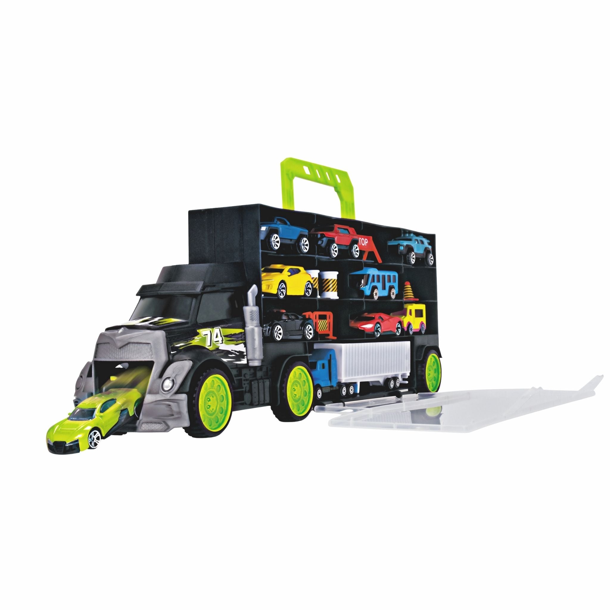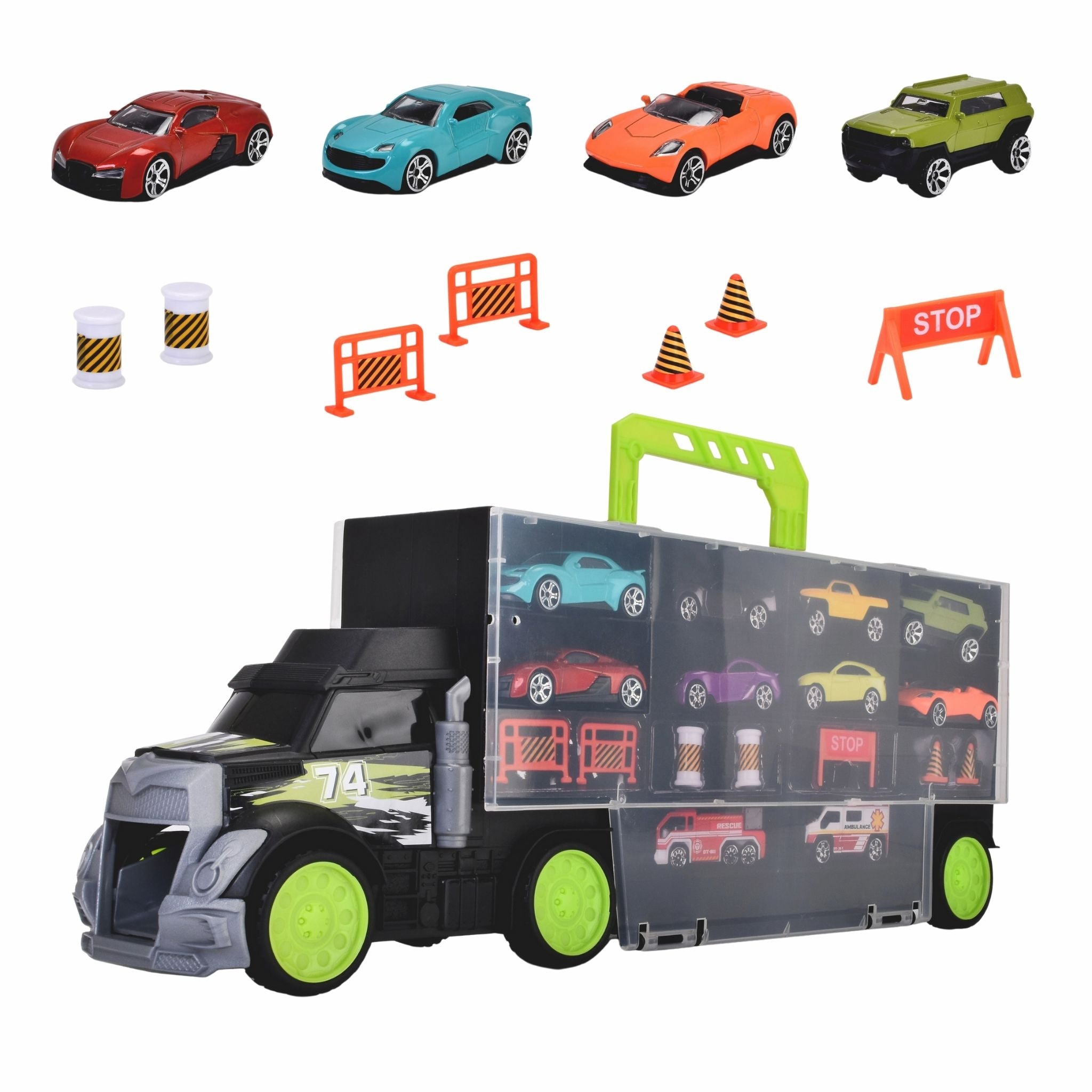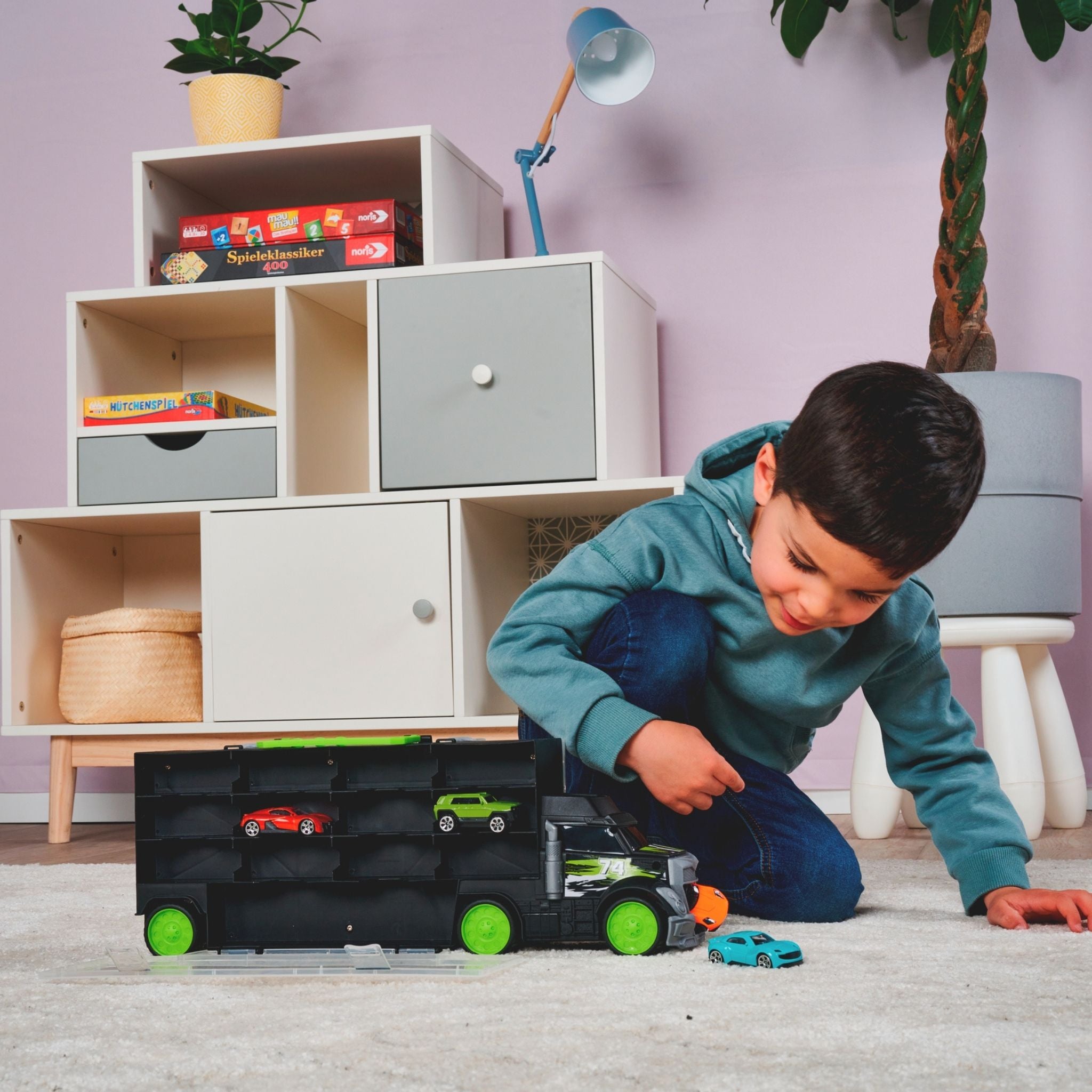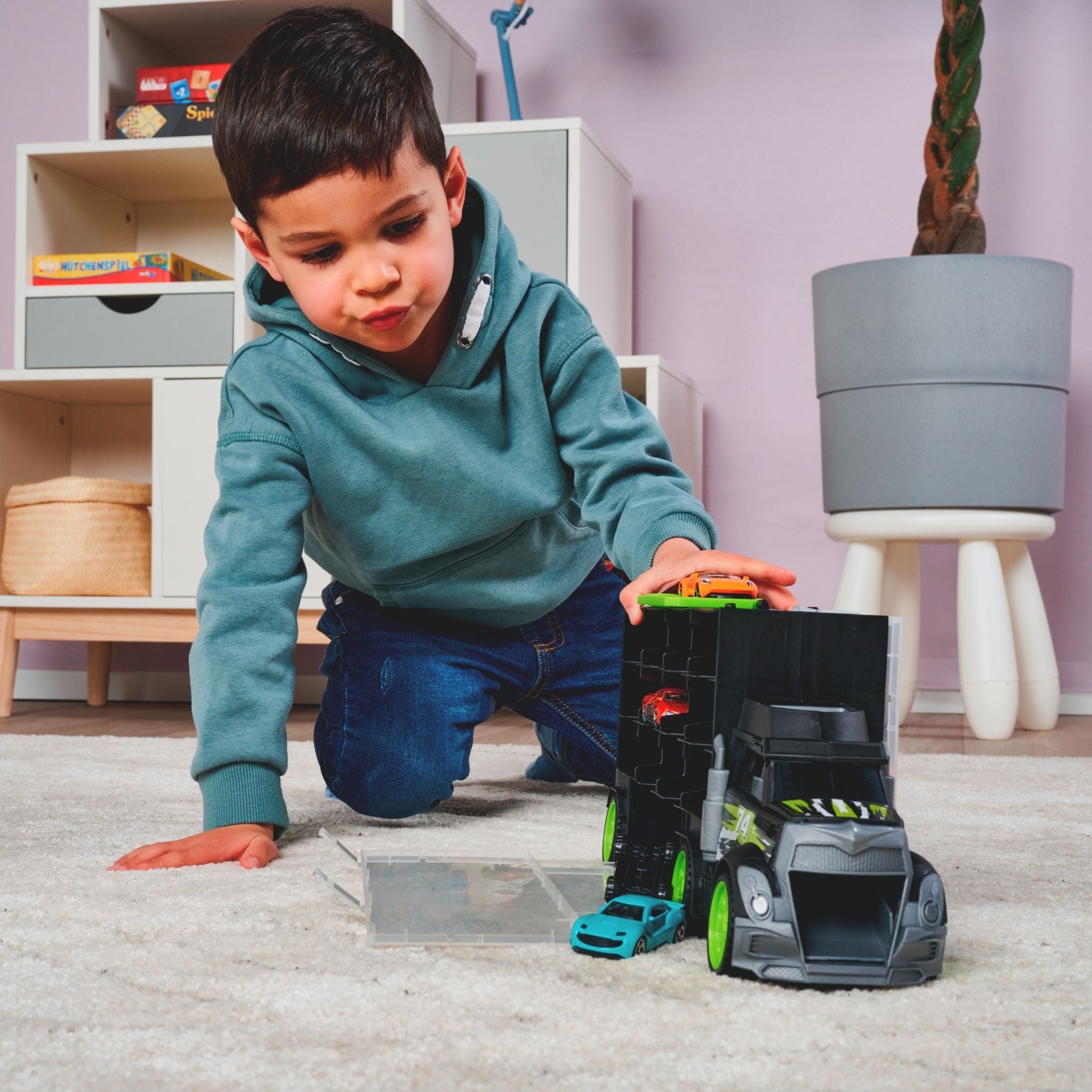 Dickie Kamyon Araba Taşıma Çantası, geniş depolama alanı ve işlevsel yapısıyla küçük otomobil tutkunlarının oyunlarını daha eğlenceli hale getirir. Dayanıklı gövdesi ve kolay taşınabilir tasarımı sayesinde çocuklar, en sevdiği oyuncak arabalarını tek bir çantada düzenli şekilde saklayabilir. Ürün; taşıma kamyonu görünümündeki tasarımıyla hem saklama çözümü hem de oyun aracı olarak kullanılabilir. Yan panel açıldığında iç kısımda çok katlı bir taşıma alanı bulunur. Bu alan sayesinde minik oyuncular dilediği arabayı kolayca yerleştirebilir, çıkarabilir ve oyun senaryolarını geliştirebilir. Ayrıca kamyonun ön tarafı rampa işlevi görerek arabaların aşağı doğru kaymasını sağlar. Setle birlikte gelen metal arabalar oyunu daha da keyifli hale getirir. Elektronik bir ürün değildir ve pil gerektirmez. Sağlam yapısı uzun süreli kullanım için uygundur.