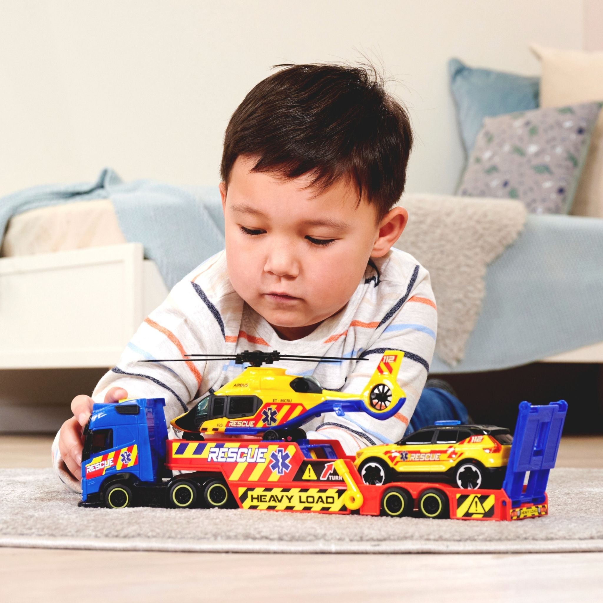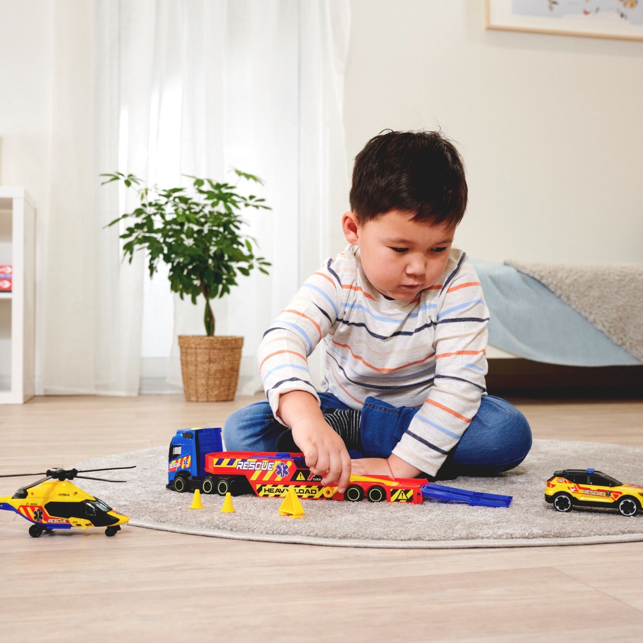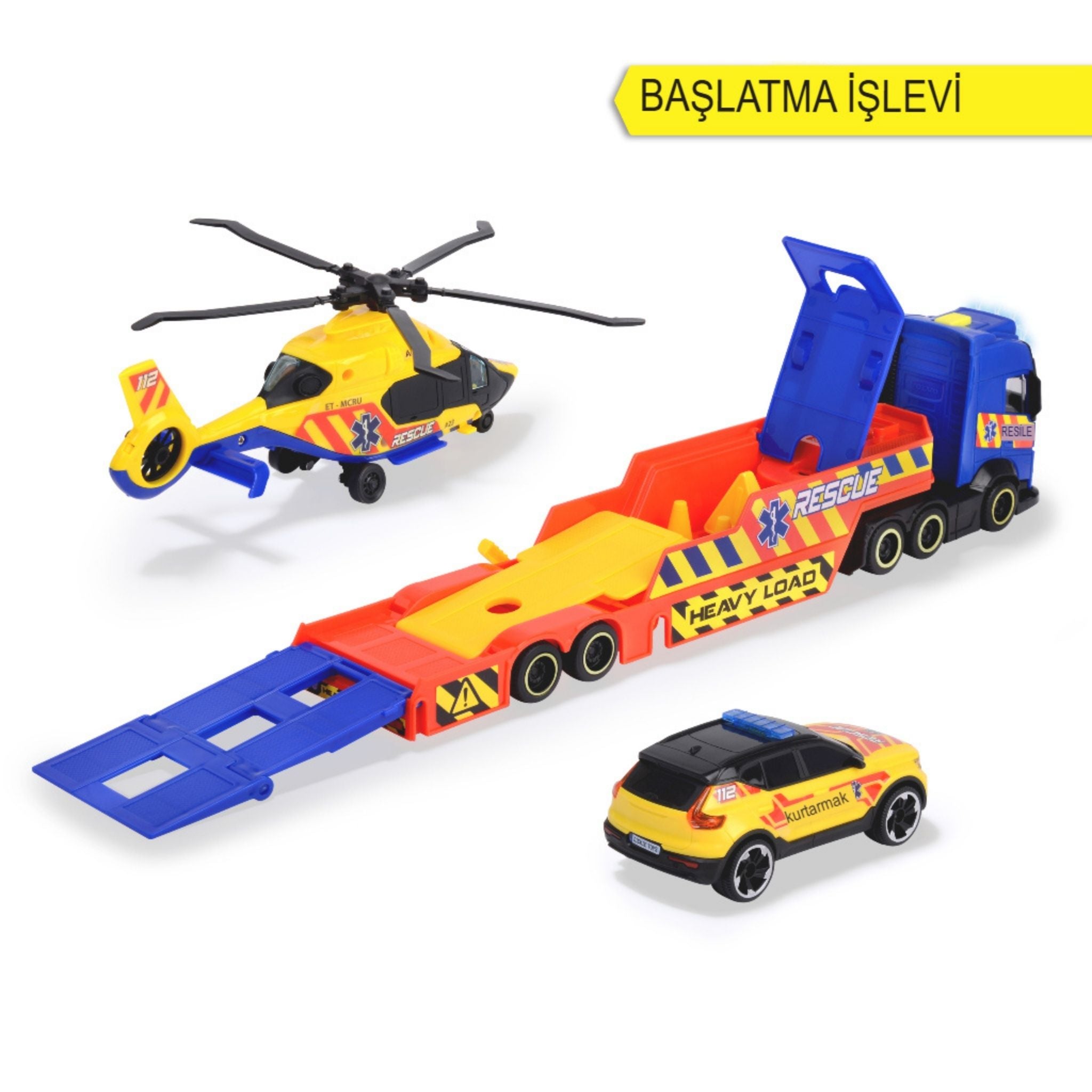 Dickie’nin lisanslı Volvo Rescue Transporter Seti, çocukları gerçek bir kurtarma operasyonunun heyecanına davet ediyor! Bu detaylı ve fonksiyonel oyun seti, bir tır, bir helikopter ve bir otomobilden oluşuyor. 40 cm uzunluğundaki Volvo FH16 kurtarma tırı, 13 cm’lik Volvo XC40 SUV ve Airbus H160 helikopter, çocukların hem hayal gücünü geliştiriyor hem de eğlenceli ve interaktif bir oyun deneyimi sunuyor. Tırın arka rampası açılarak araç yükleme ve indirme işlemleri kolaylaştırılmış, helikopterin dönen pervanesi ve otomatik hareket ettirilen araç sistemi oyunlara gerçekçilik kazandırıyor. Setin sesli ve ışıklı özellikleri ise çocukları oyun dünyasına daha fazla dahil ediyor. Ayrıca setin içinde yer alan uyarı levhaları ve direklerle oyun senaryoları daha zengin hale geliyor. Tüm bu özellikleriyle Dickie Volvo Rescue Seti, 3 yaş ve üzeri çocuklar için hem öğretici hem de eğlenceli bir tercihtir. Dickie Volvo Rescue Transporter Seti, çocukların saatlerce keyifle oynayabileceği, aksiyon dolu bir oyun dünyası sunuyor. Gerçekçi detaylar, ses ve ışık efektleri, kaliteli malzeme yapısı ve birleştirilebilir senaryolarla bu set, minik kurtarma kahramanlarının vazgeçilmezi olacak!