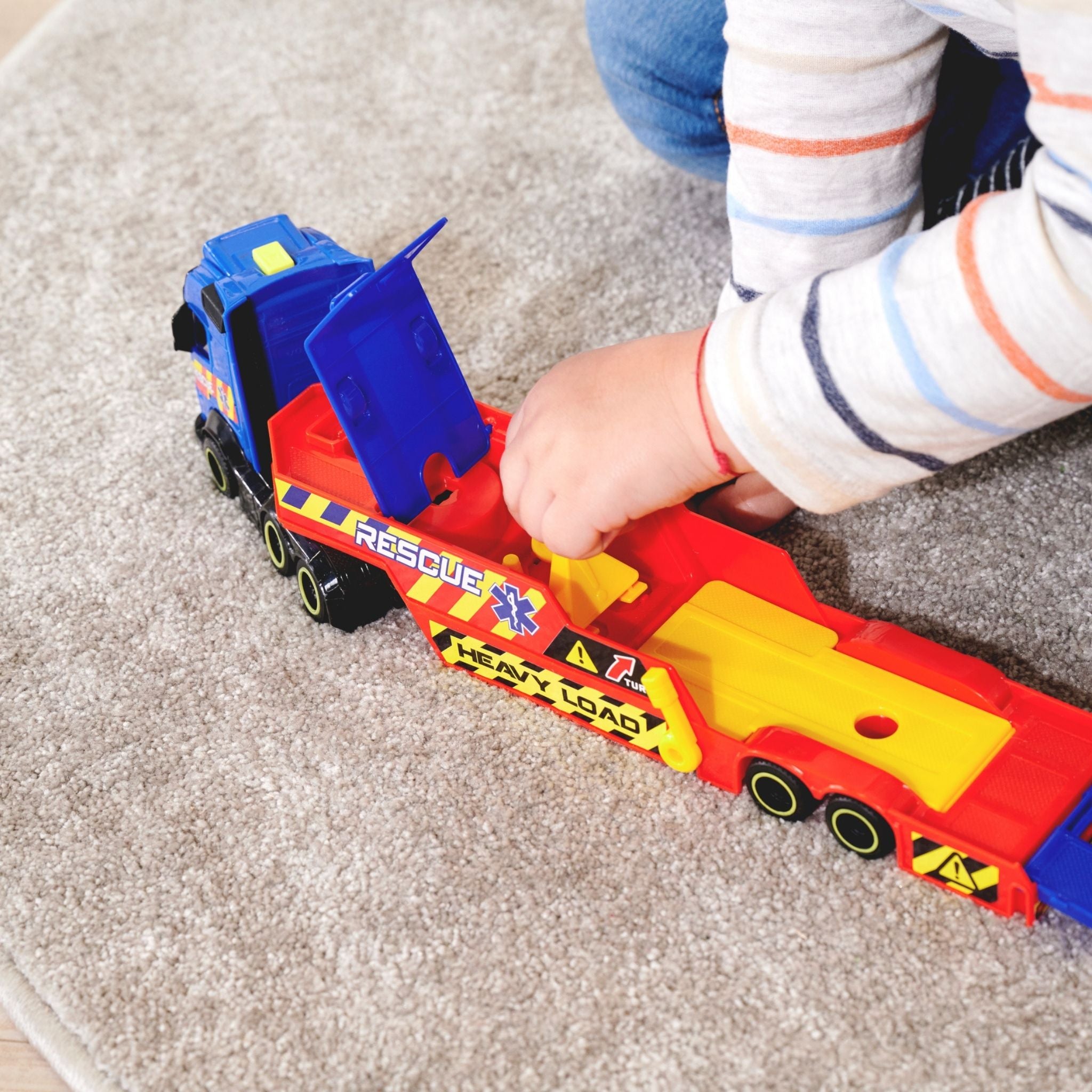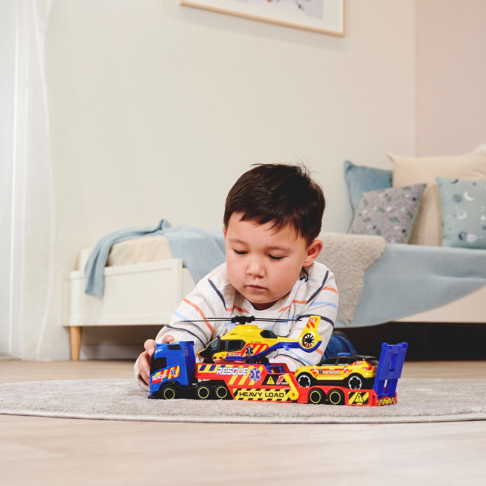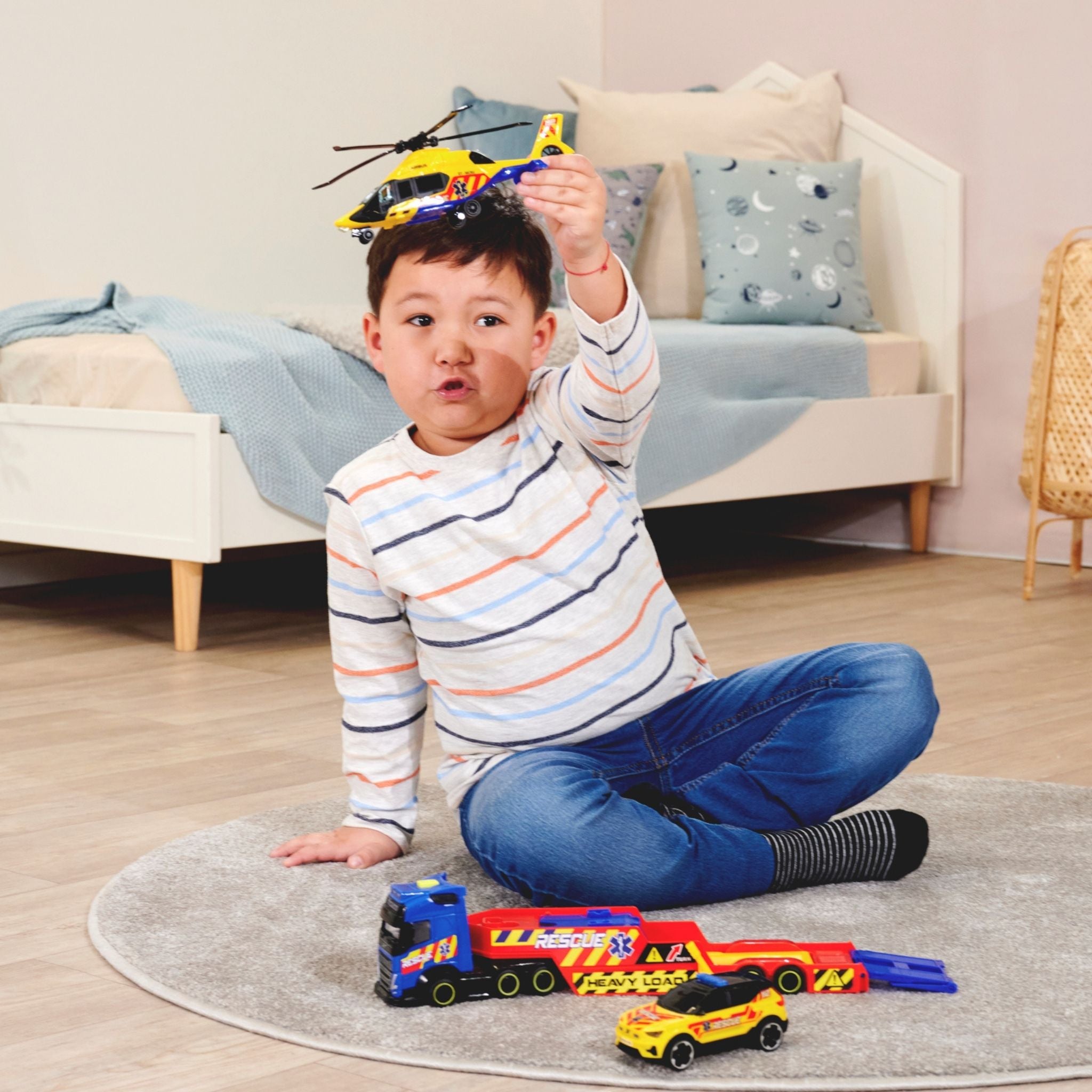 Dickie’nin lisanslı Volvo Rescue Transporter Seti, çocukları gerçek bir kurtarma operasyonunun heyecanına davet ediyor! Bu detaylı ve fonksiyonel oyun seti, bir tır, bir helikopter ve bir otomobilden oluşuyor. 40 cm uzunluğundaki Volvo FH16 kurtarma tırı, 13 cm’lik Volvo XC40 SUV ve Airbus H160 helikopter, çocukların hem hayal gücünü geliştiriyor hem de eğlenceli ve interaktif bir oyun deneyimi sunuyor. Tırın arka rampası açılarak araç yükleme ve indirme işlemleri kolaylaştırılmış, helikopterin dönen pervanesi ve otomatik hareket ettirilen araç sistemi oyunlara gerçekçilik kazandırıyor. Setin sesli ve ışıklı özellikleri ise çocukları oyun dünyasına daha fazla dahil ediyor. Ayrıca setin içinde yer alan uyarı levhaları ve direklerle oyun senaryoları daha zengin hale geliyor. Tüm bu özellikleriyle Dickie Volvo Rescue Seti, 3 yaş ve üzeri çocuklar için hem öğretici hem de eğlenceli bir tercihtir. Dickie Volvo Rescue Transporter Seti, çocukların saatlerce keyifle oynayabileceği, aksiyon dolu bir oyun dünyası sunuyor. Gerçekçi detaylar, ses ve ışık efektleri, kaliteli malzeme yapısı ve birleştirilebilir senaryolarla bu set, minik kurtarma kahramanlarının vazgeçilmezi olacak!