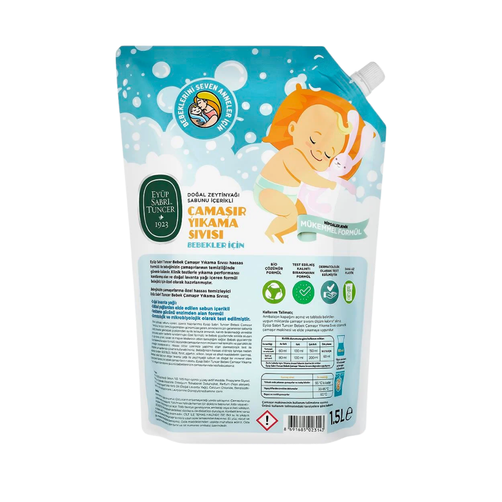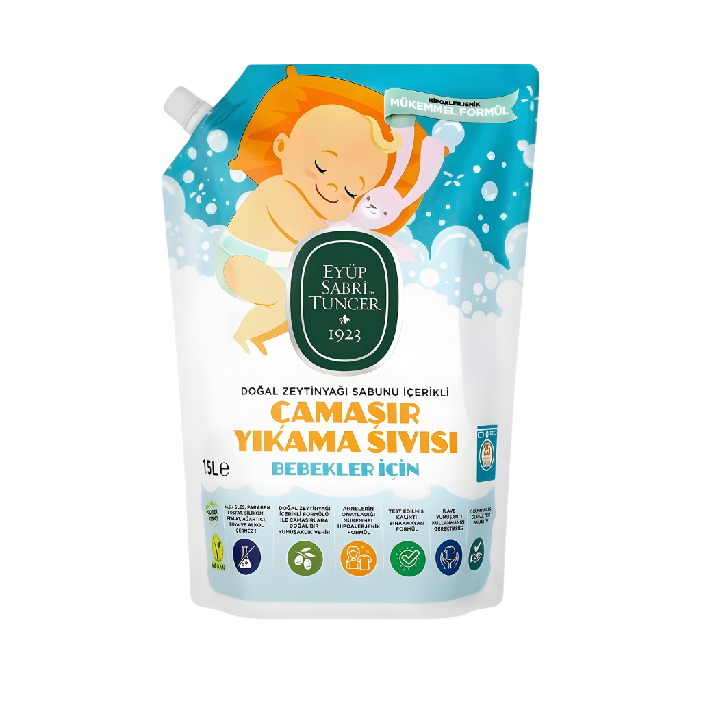 Eyüp Sabri Tuncer Doğal Zeytinyağı İçerikli Bebek Çamaşır Yıkama Sıvısı, bebeklerin hassas cilt yapısı göz önünde bulundurularak geliştirilmiş özel formülüyle güvenli ve etkili temizlik sunar. Doğal zeytinyağı sabunu bazlı yapısı sayesinde bebek giysilerinde kalıntı bırakmadan durulanır ve su ile kolayca arınır. Akredite laboratuvarlarda test edilen formülü, bebek cildinde tahrişe yol açabilecek bileşenler içermeden üretilmiştir. Lavanta yağı, doğal zeytinyağı ve doğal bir mineral olan boraks içeren yapısı ile hem temizlik hem de doğal bakım sağlar. Süt, mama, yağ, çimen, kakao ve meyve gibi zorlu lekelerde etkili sonuç verirken, ilave yumuşatıcı kullanımına ihtiyaç duyulmaz. Çevre dostu üretim anlayışıyla geliştirilen ürün, sürdürülebilir kaynak kullanımı ve düşük çevresel etki kriterlerini karşılayan ECO Label ve ECO Mark sertifikalarına sahiptir. Eyüp Sabri Tuncer Doğal Zeytinyağı İçerikli Bebek Çamaşır Yıkama Sıvısı 1,5 L, bebek giysileri için güvenli temizlik ve doğal bakım sunan, günlük kullanıma uygun bir çözümdür.