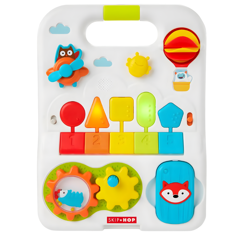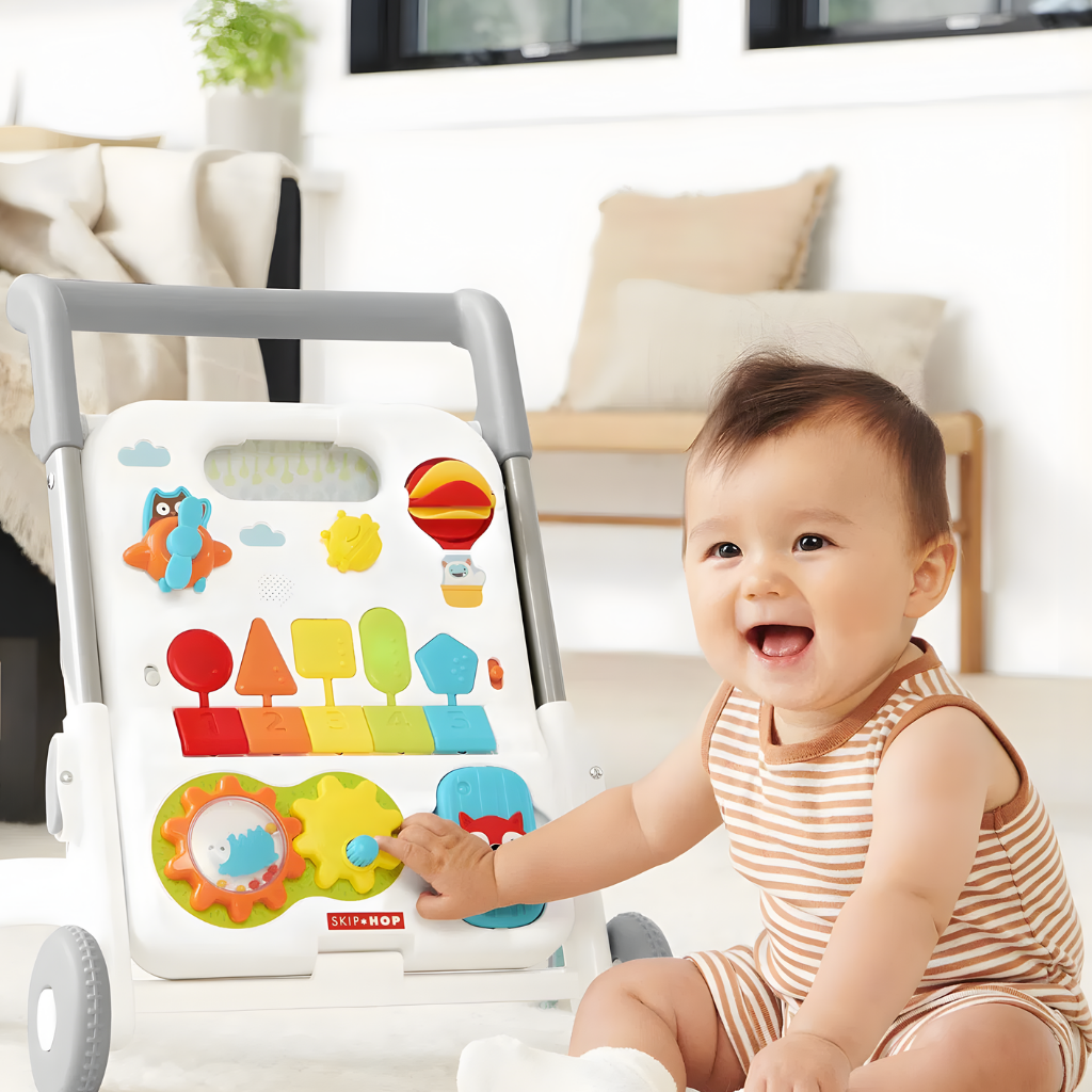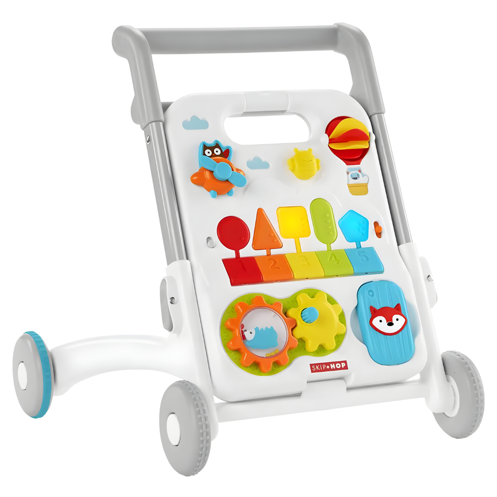 Skip Hop Explore More 4'in 1 Yürüteç, bebeğinizin gelişim sürecine uzun süre eşlik eden çok fonksiyonlu bir aktivite merkezidir. 40’tan fazla oyun özelliği, şarkı, ses ve ışık efekti ile donatılan bu dönüştürülebilir tasarım, hem eğlence hem de öğrenmeyi bir arada sunar. Oturarak oyun döneminden ilk adımlara kadar farklı gelişim aşamalarına uyum sağlar. Skip Hop Explore More koleksiyonuna ait bu model, 6 ay ile 4 yaş arası kullanım için uygundur. Dört farklı oyun modu sayesinde bebeğiniz büyüdükçe kullanım şekli değiştirilebilir. Oturarak aktivite paneli ile oynama, gezinerek yürüteç modu, alışveriş sepeti modu ve bebek arabası modu ile çok yönlü bir deneyim sunar. Çıkarılabilir oyuncak paneli, yerde oyun veya şövale olarak kullanım imkânı sağlar. Panel üzerinde pervaneli uçak, tıkırtılı arı, sıcak hava balonu döndürücü, dönen vites ve aynalı çıngıraklı telefon gibi eğitici detaylar bulunur. Işıklı müzik klavyesi şekiller ve sayılarla etkileşim kurmayı destekler. Beş şarkı, beş ses efekti ve beş piyano notası ile müzikli keşif imkânı sunar. Denge ve hareket gelişimini destekleyen kaymaz arka tekerlekler ile hız kontrol anahtarı güvenli kullanım sağlar. Üç farklı yükseklik ayarı bulunan tutmaç, çocuğun boyuna göre ayarlanabilir. Şarkı modu, piyano modu ve ses efektleri arasında geçiş yapılabilir. Ses seviyesi ayarlanabilir özelliktedir. Skip Hop Explore More 4 Aşamalı Yürüteç 6 Ay+, çok yönlü kullanım yapısı ve zengin aktivite içeriği sayesinde bebeğinizin ilk keşiflerinden ilk adımlarına kadar gelişimini destekleyen kapsamlı bir öğrenme ve oyun merkezidir.
