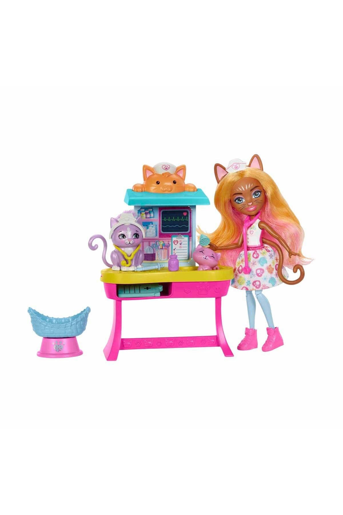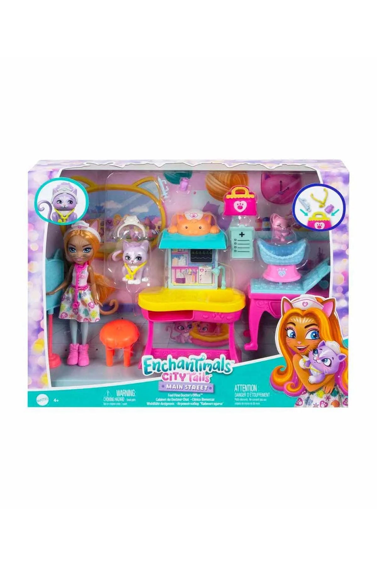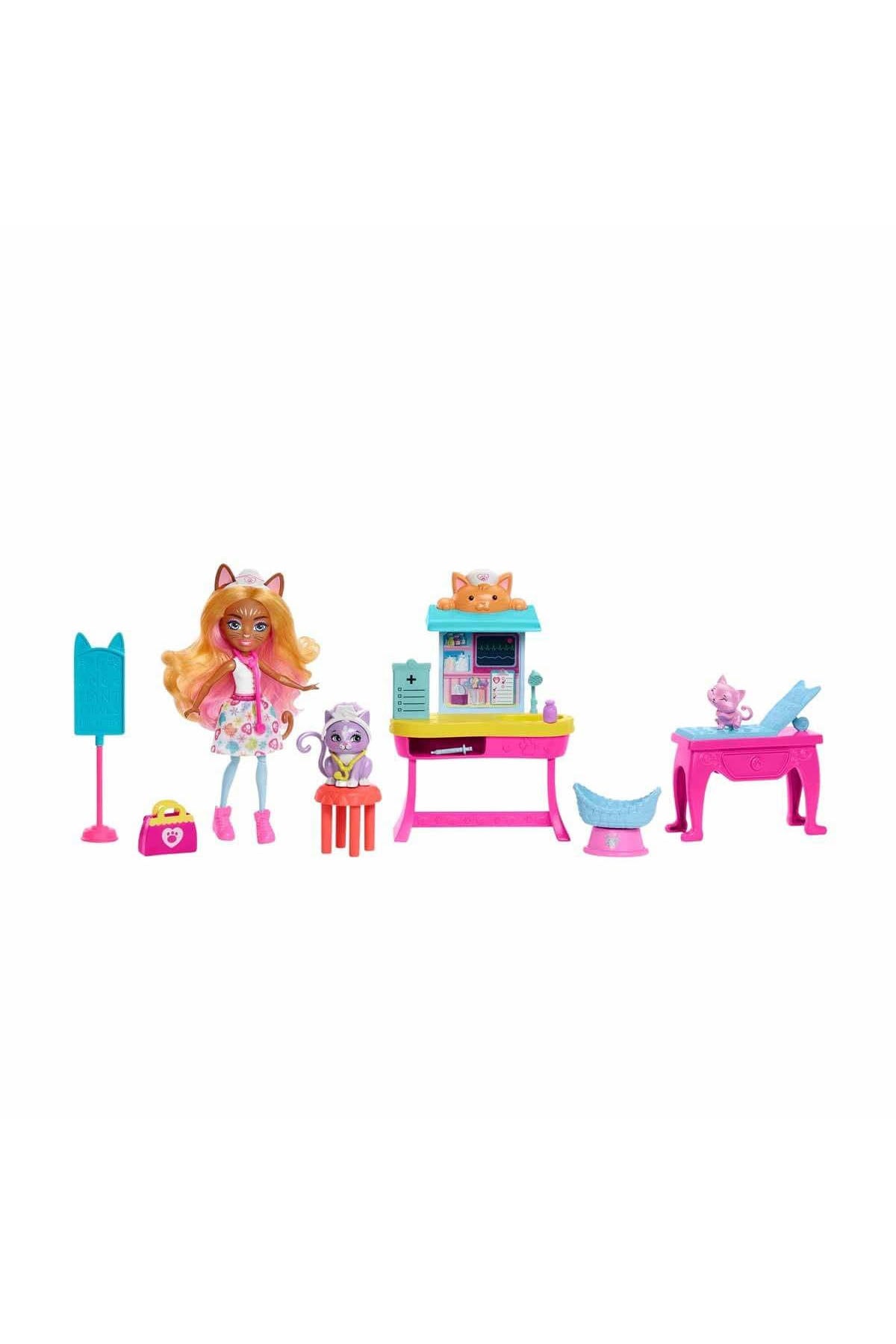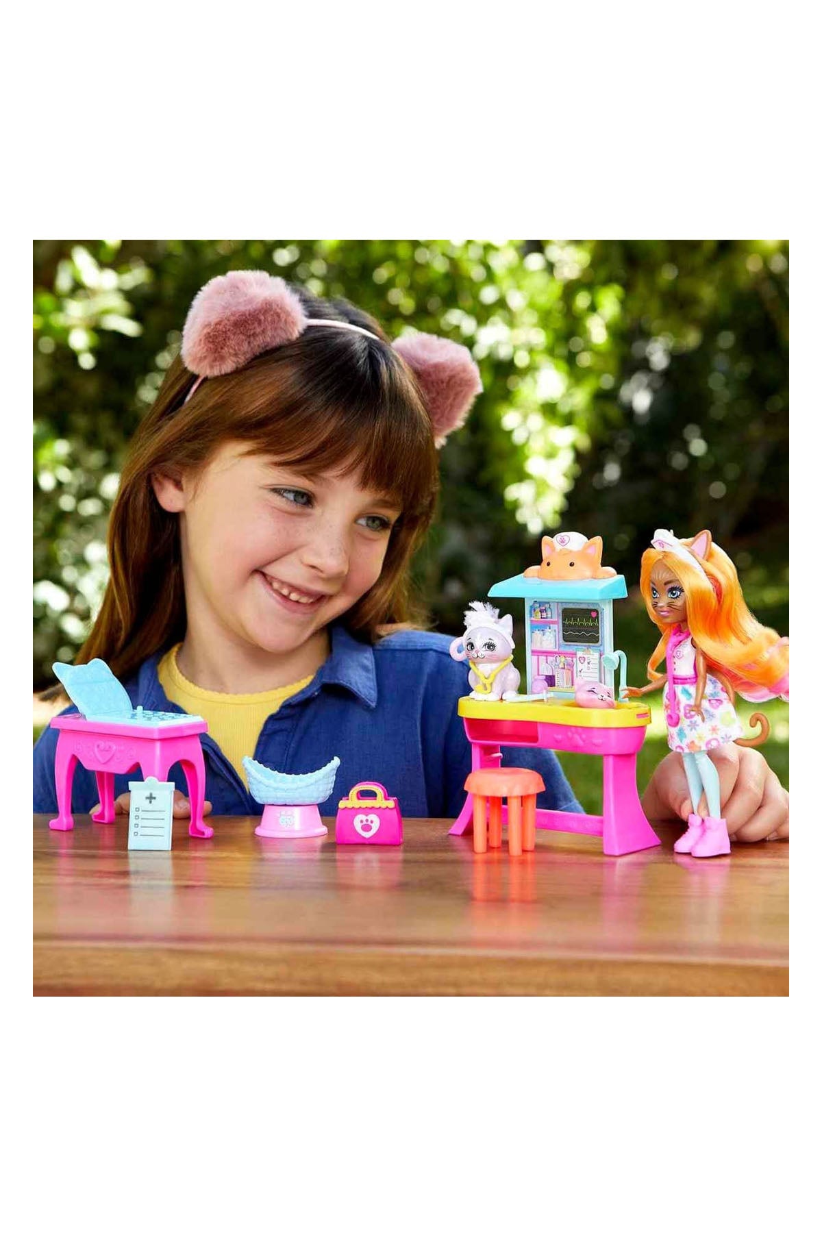 Enchantimals bebekler ve oyun setleri, hayvan dostlarıyla beraber sevimli bebekleri içerir. Bu bebekler; stetoskobuyla Doktor Carlin Cat bebek, onun en iyi hayvan dostu Hurdle ve bir tane daha oyunbaz kedinin olduğu Enchantimals Klinik Oyun Seti'ne hayvan dostlarını getirmeyi çok seviyor. Muayene masası, çocukların ekipmanla doldurabileceği bir tıbbi çanta, bir sepet, göz muayene tablosu ve çok daha fazlası muayenehane aksesuarları arasında yer alır. Enchantimals Klinik Oyun Seti hayvan dostlarıyla beraber sevimli bebekleri içerir. Doktor Carlin Cat bebek Enchantimals Klinik Oyun Set'inde herkesi iyileştirebilir! Hurdle ve kedi figürlerinin detaylı bir muayene için muayene masasına çıkmasına yardım edin. Büyüleyici tıbbi çantada şırınga ve şişe gibi pek çok doktor aleti bulunur. Sevimli hayvanlar sıralarını beklerken sepette yatabilir. Doktor Carlin Cat bebeğin çıkarabilen bir stetoskobu, eteği ve ayakkabıları vardır. Hurdle figürünün de stetoskobu vardır!