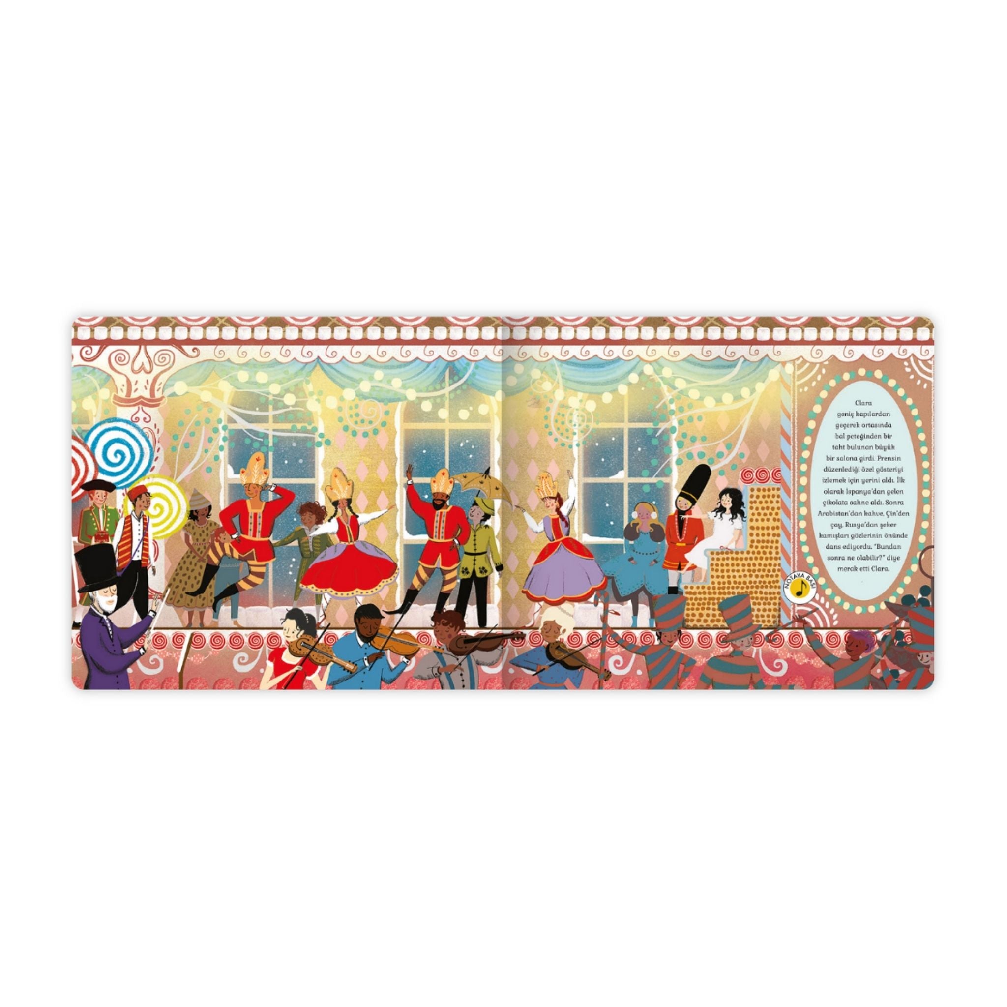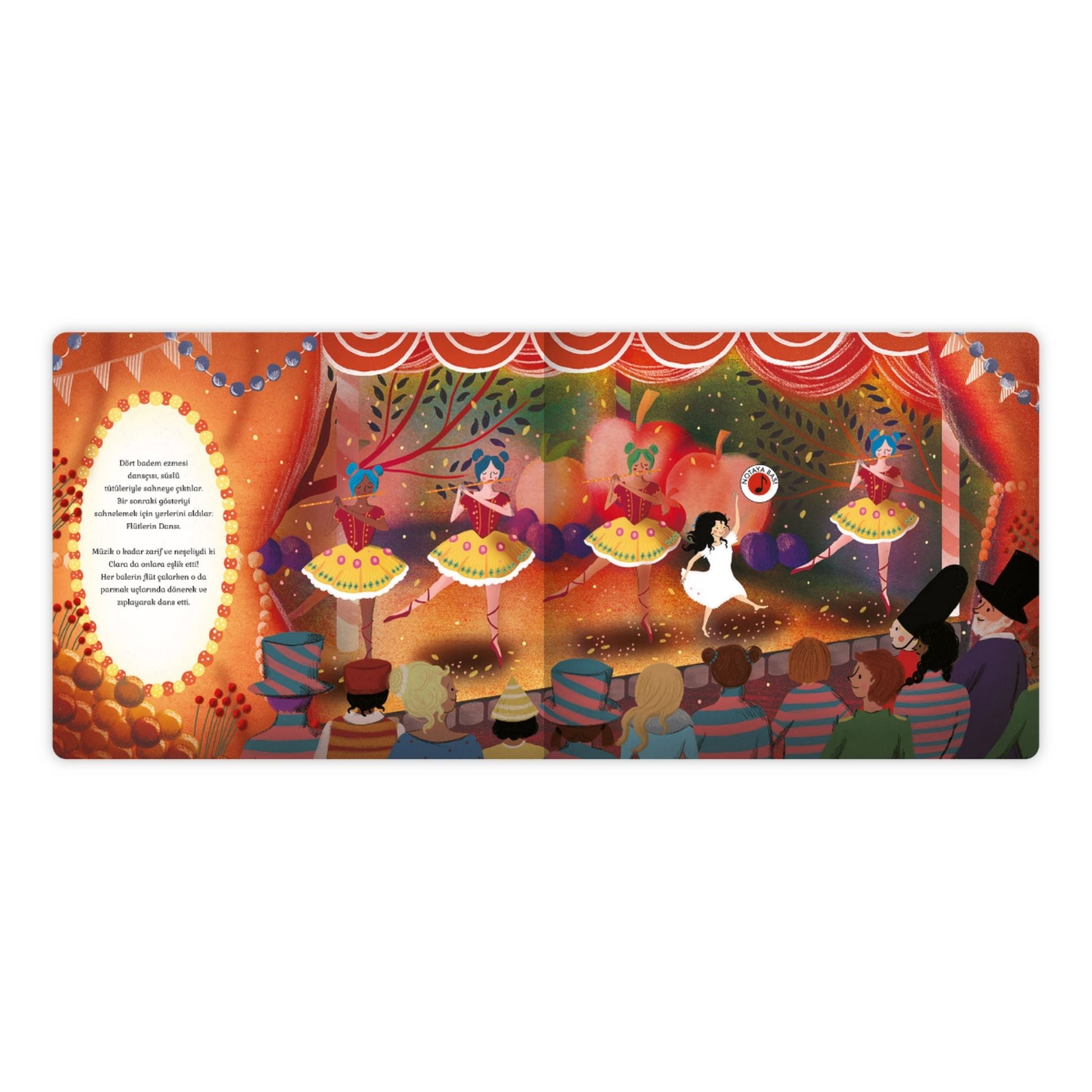 Fındıkkıran balesinin bu muhteşem müzikal yeniden anlatımı, yılbaşı coşkusunu çocuklarla paylaşmanın en sihirli yollarından biri. Çaykovski’nin dünyaca ünlü bestesi eşliğinde, küçük Clara’nın Noel gecesinde yaşadığı renkli ve heyecanlı yolculuğa davetlisiniz. Hikâye Orkestrası serisinin bir parçası olan bu kitap, her sahnede yer alan düğmelere basarak orkestranın 10 saniyelik müzik performanslarını dinleyebilme özelliğiyle öne çıkıyor. Böylece çocuklar, sadece okumakla kalmayıp klasik müziği de birebir deneyimleyebiliyor. Clara’nın evinde Noel hazırlıkları tüm hızıyla devam ederken, mis kokulu zencefil, çikolata ve nane aromaları mutfağı dolduruyor. Küçük kardeşi Fritz’in neşeyle süslediği Noel ağacının altında ise en büyük sürpriz Clara’yı bekliyor: Vaftiz babasının getirdiği tahtadan oyulmuş, özel bir fındıkkıran. Bu oyuncak, sadece Noel’i değil, aynı zamanda Clara’nın hayal dünyasını da baştan sona değiştirecek bir anahtar görevi görüyor.