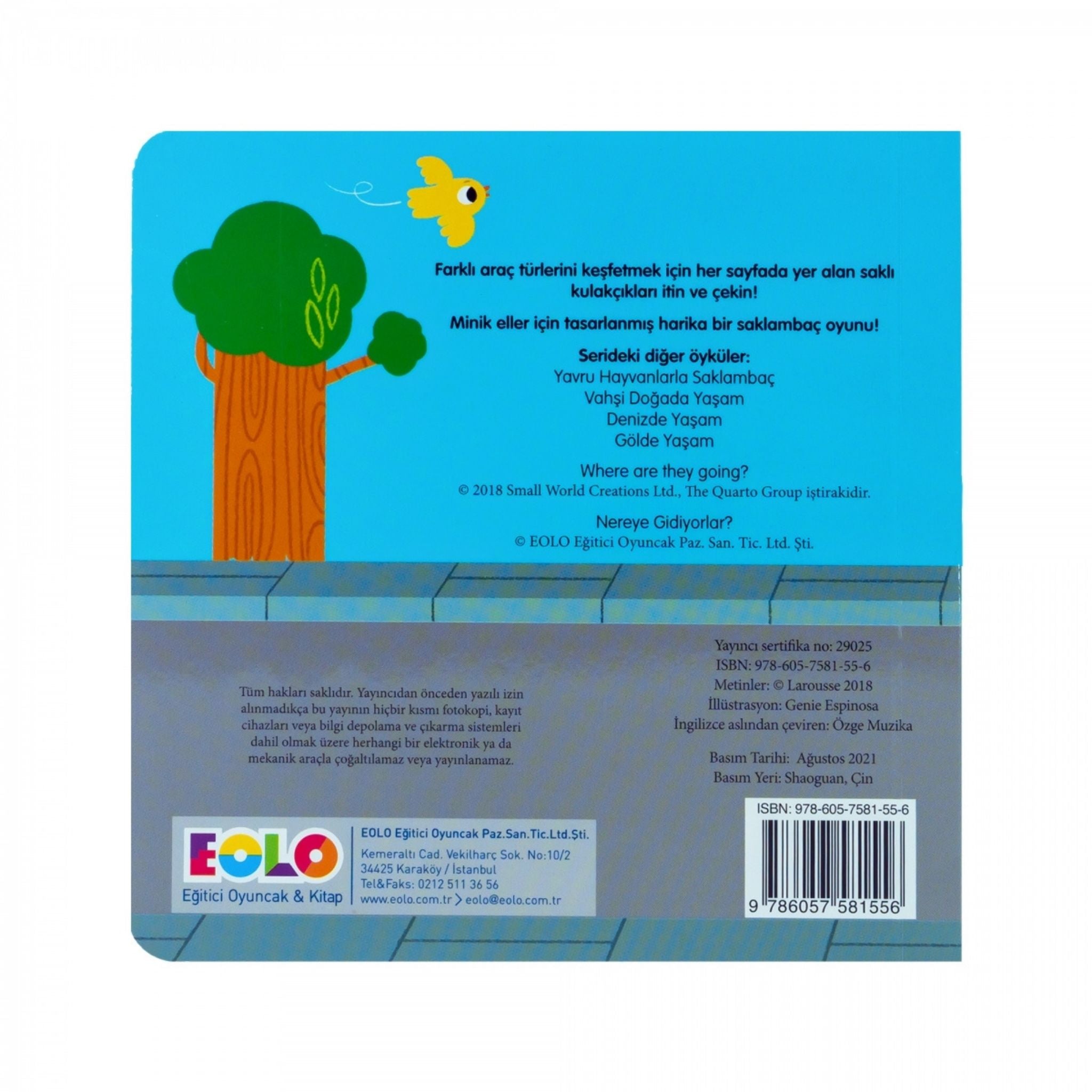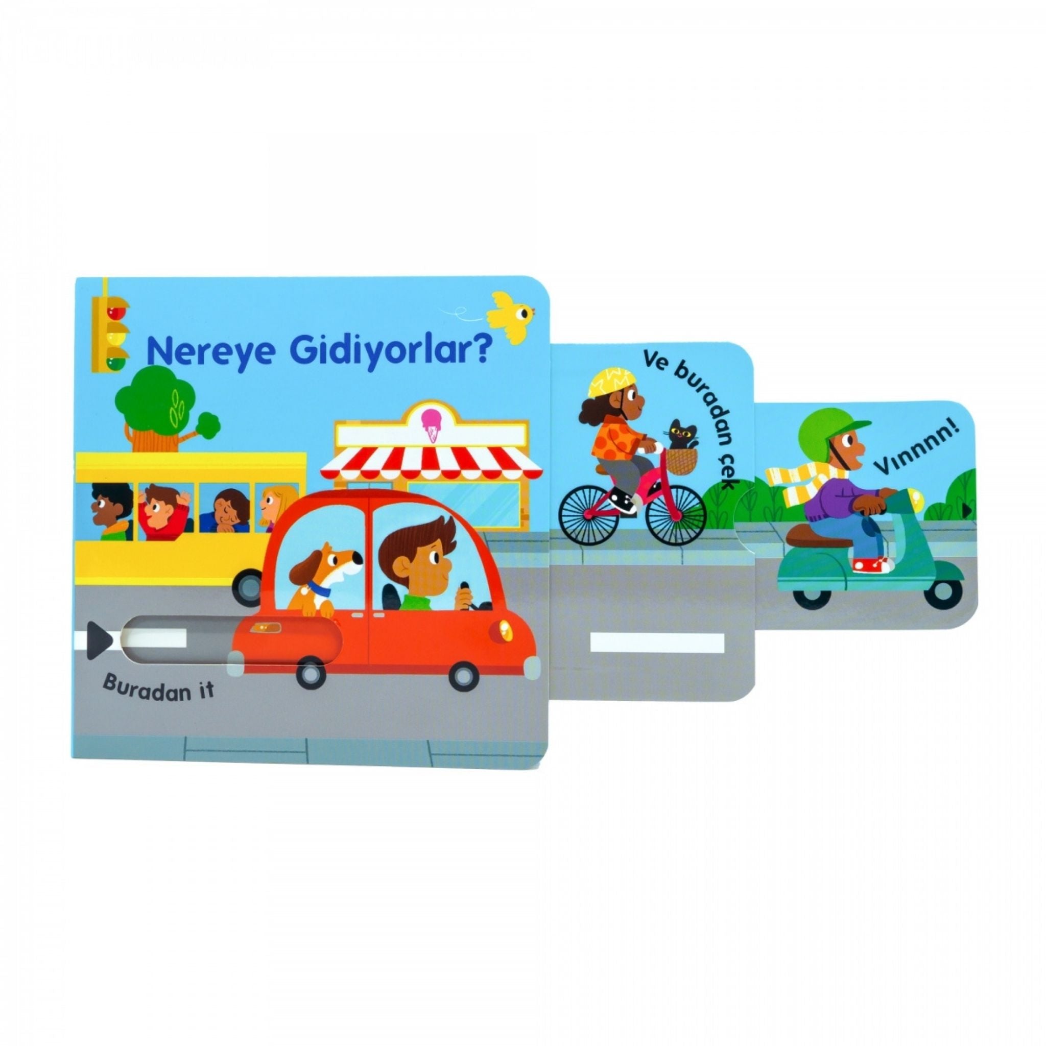 Nereye Gidiyorlar? 2 yaş ve üzeri çocuklara yönelik hazırlanan, sürgülü sayfalarıyla taşıtların dünyasını keşfetmeyi eğlenceli hâle getiren bir kitaptır. Minikler bu kitapla, farklı taşıtların hangi özelliklere sahip olduğunu öğrenirken kelime dağarcıklarını da geliştirir. Parça-bütün ilişkisi kurma, dikkat ve konsantrasyonu artırma, el-göz koordinasyonu ile ince motor becerilerini destekleme gibi pek çok yönden çocukların gelişimine katkı sağlar. Renkli ve canlı tasarımı sayesinde çocuklar, her yeni sayfada merak duygularını koruyarak keyifli bir okuma deneyimi yaşar.