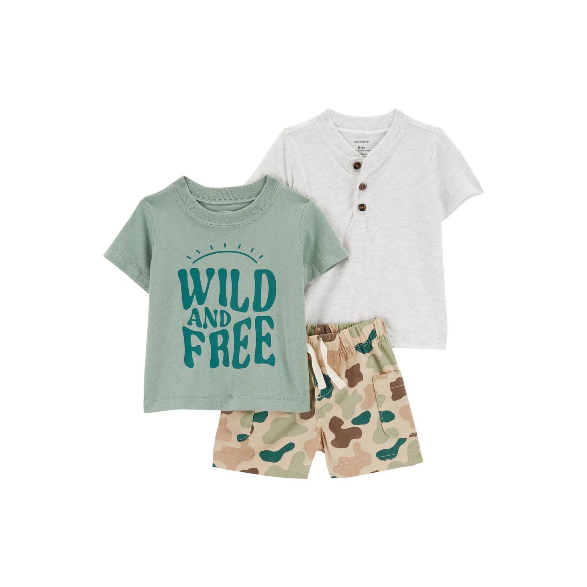 Carter's Erkek Bebek Alt Üst Set Yeşil Wild And Free, miniklerinizin günlük giyim için mükemmel bir seçenektir. 3 parçalı set, rahat ve şık tasarımıyla bebeklerinize konfor sunar. İki kısa kollu tişört ve kolay giyilen şortla kombin edilebilen bu set, yumuşak pamuklu kumaşıyla bebeğinizin cildine dosttur.