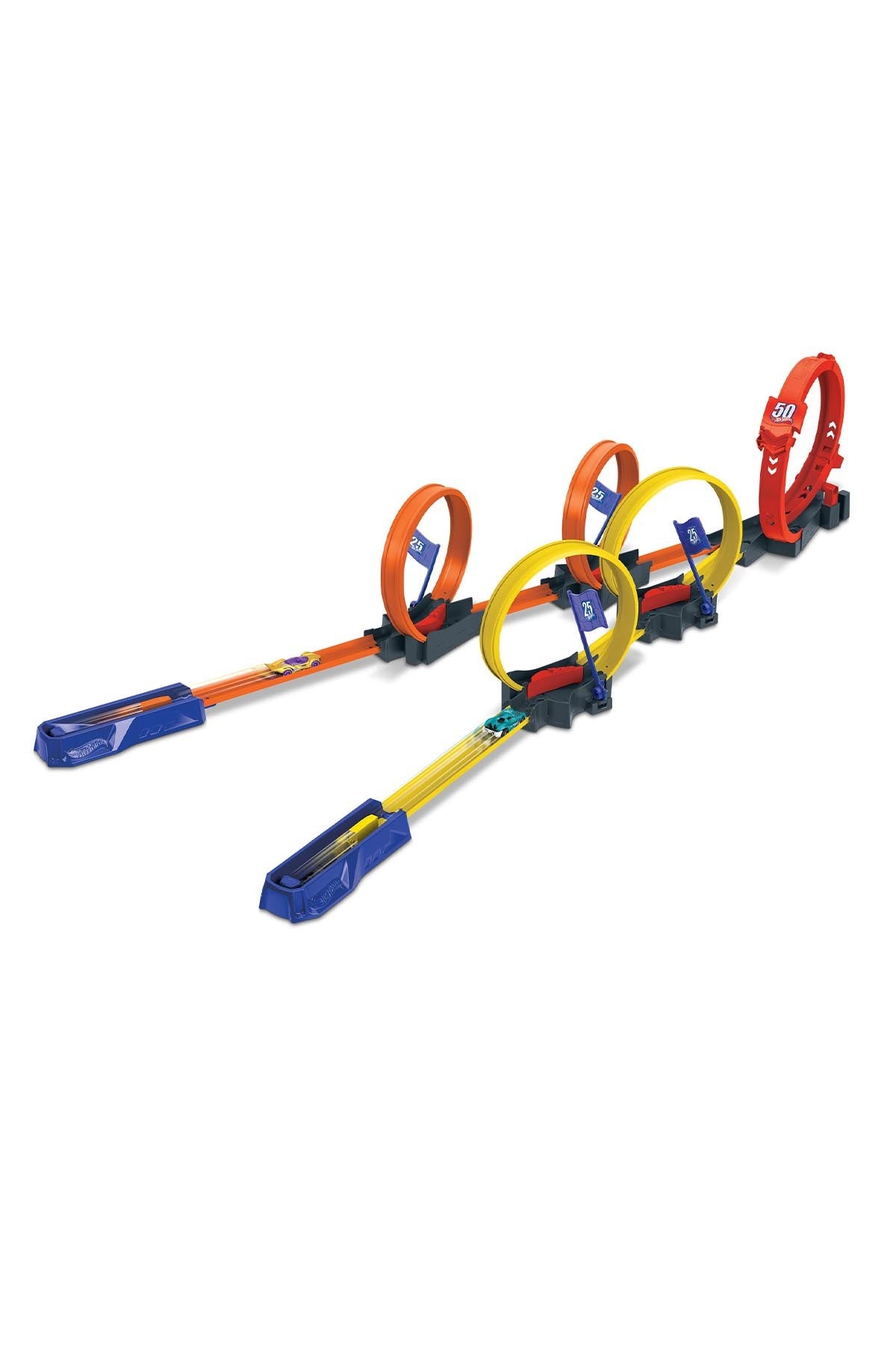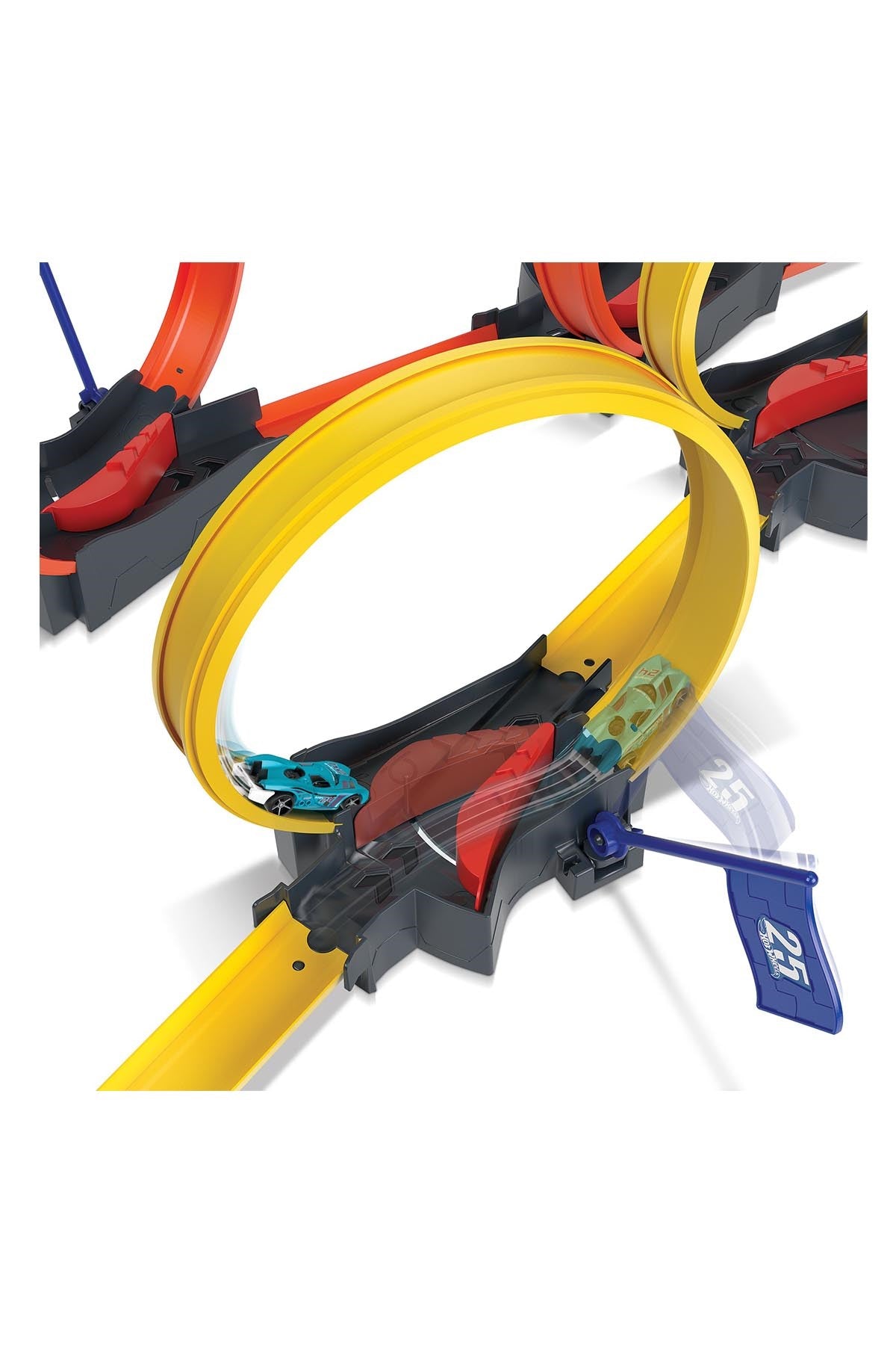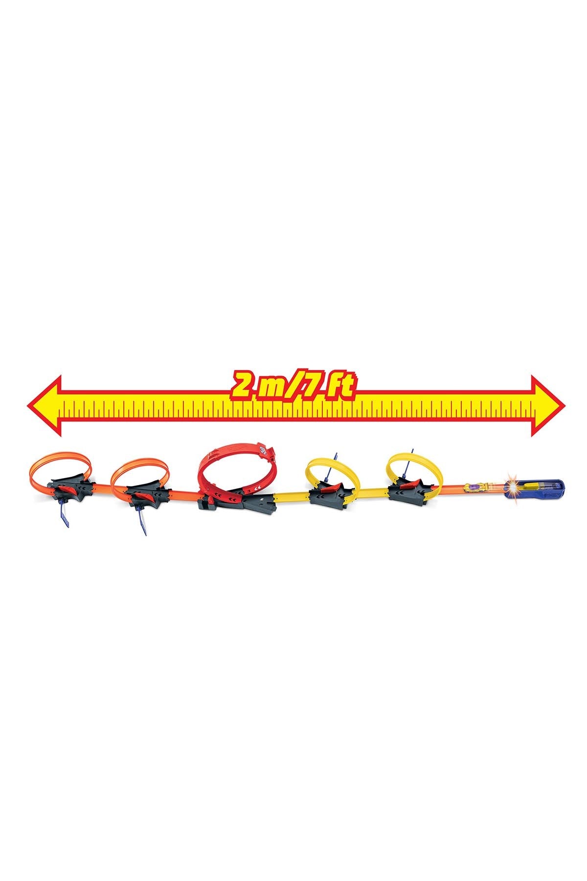 Çemberleri hızla geçerek bayrakları indirin ve puanları toplayın. En fazla puanı kazanan yarışçı büyük çemberi ilk tamamlayarak diğer araçları pistten fırlatır. Yarış ve akrobasi maceralarını yeni boyutlara taşımak için set, diğer Hot Wheels pistleriyle birleştirilebilir.