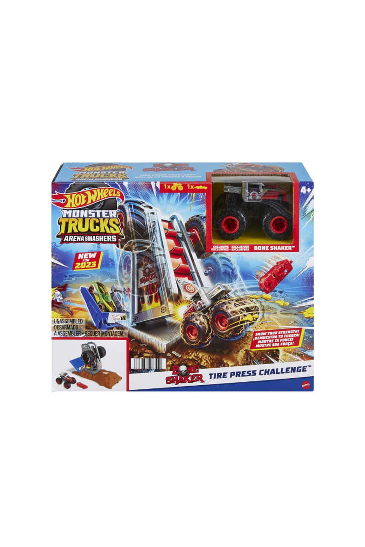 Hot Wheels Monster Trucks Arena Smashers Bone Shaker Tire Press Challenge ile heyecanı zirvede yaşayın. Sallanan zeminde dengenizi koruyarak kuleye lastik ağırlıkları fırlatın ve Bone Shaker’ın gücünü test edin. Çarpma ve yıkım etkisini gerçekçi bir şekilde hissettiren hareketli taban, oyun deneyimini daha da heyecanlı hale getiriyor.