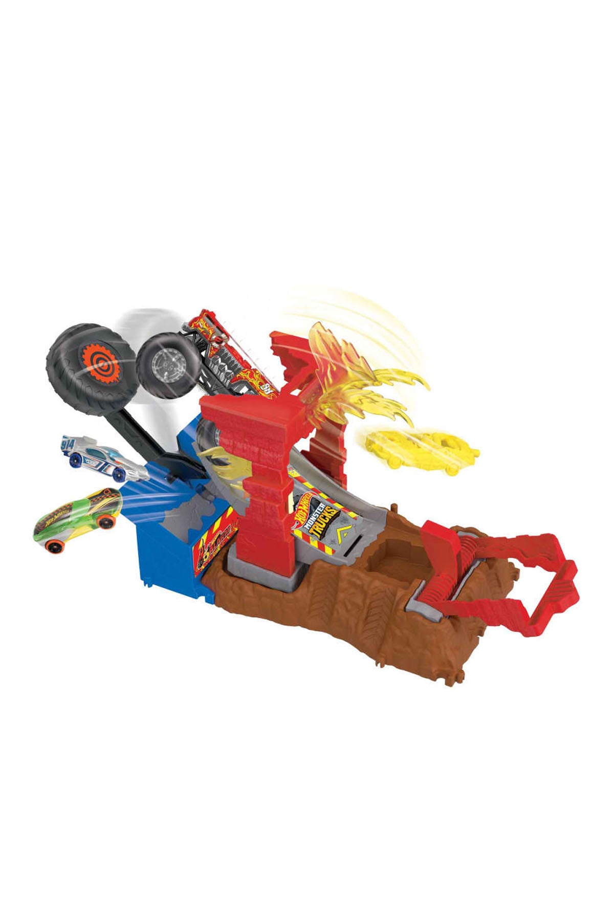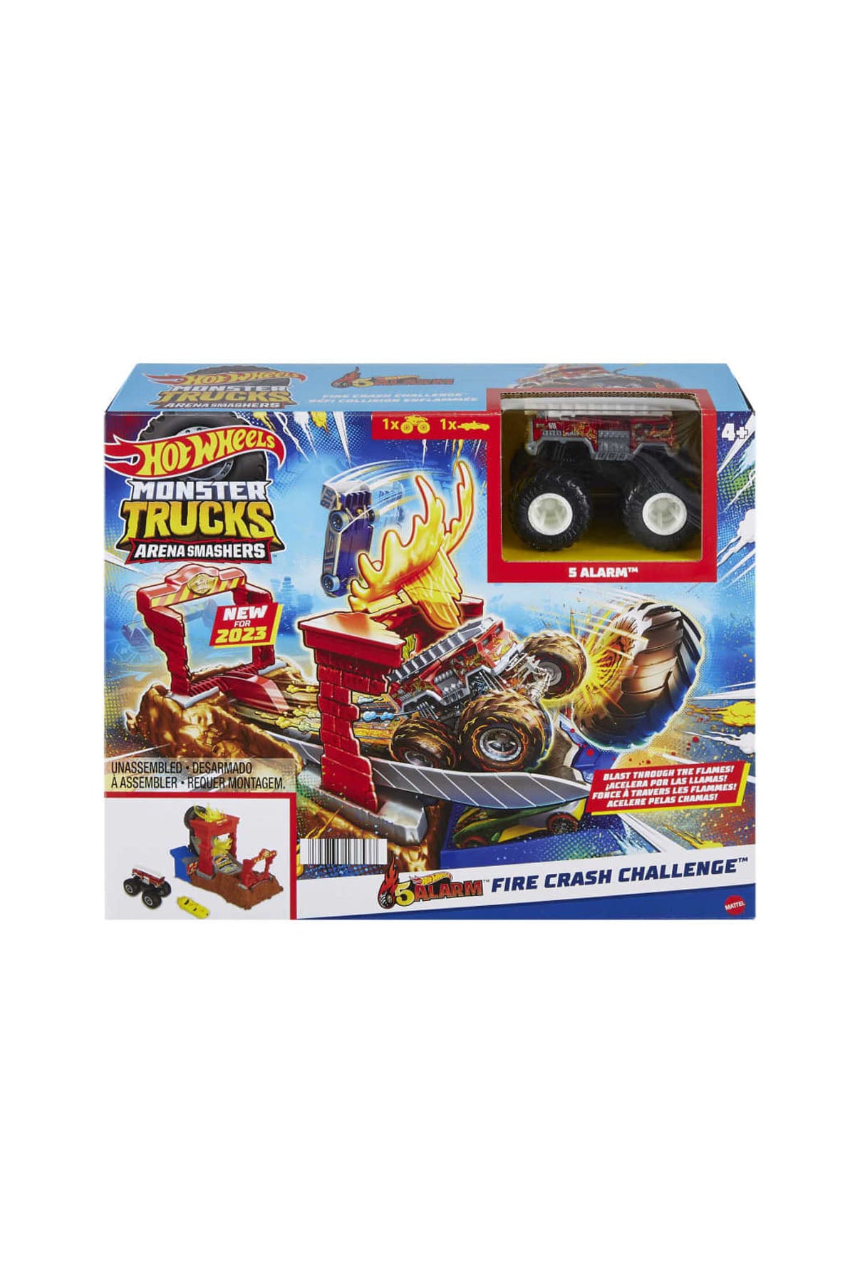 Hot Wheels Monster Trucks Arena Smashers 5-Alarm Fire Crash Challenge oyun setinde HW 5-Alarm'ı hayali alevlerin içinden geçirerek parçalama noktasına vurun ve yangını söndürün. Hareket eden ve sallanan taban, gerçekten sürükleyici bir oyun için duyusal geri bildirim oluşturur - çocuklar çarpmanın ve parçalamanın gücünü avuçlarının içinde hissedebilir!