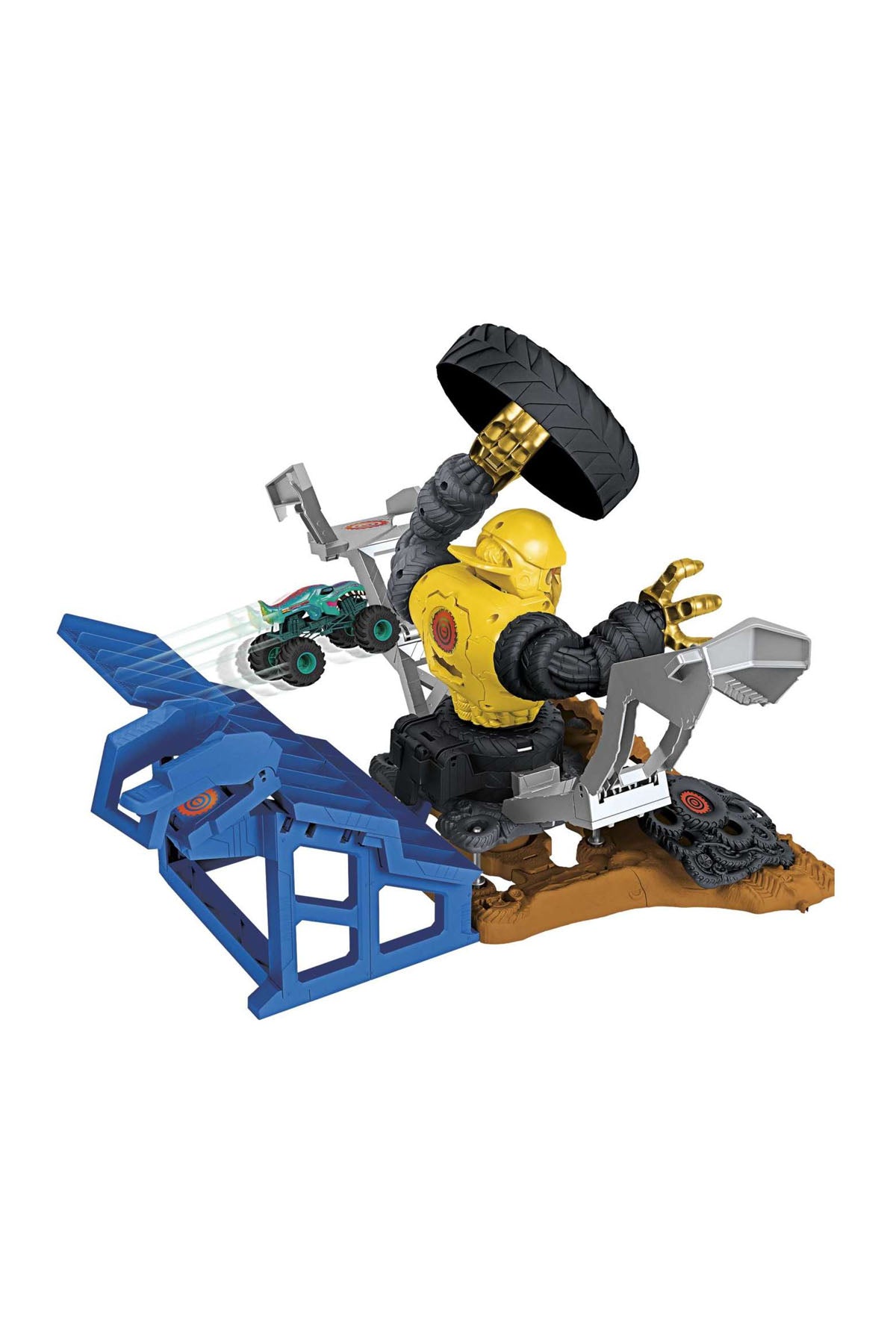 ● Set, 1:64 ölçekli bir Hot Wheels Monster Trucks Mega-Wrex ve çocukların tribünlere koyabileceği veya Crushzilla'ya yem olabilecek iki ezilebilir araba içerir