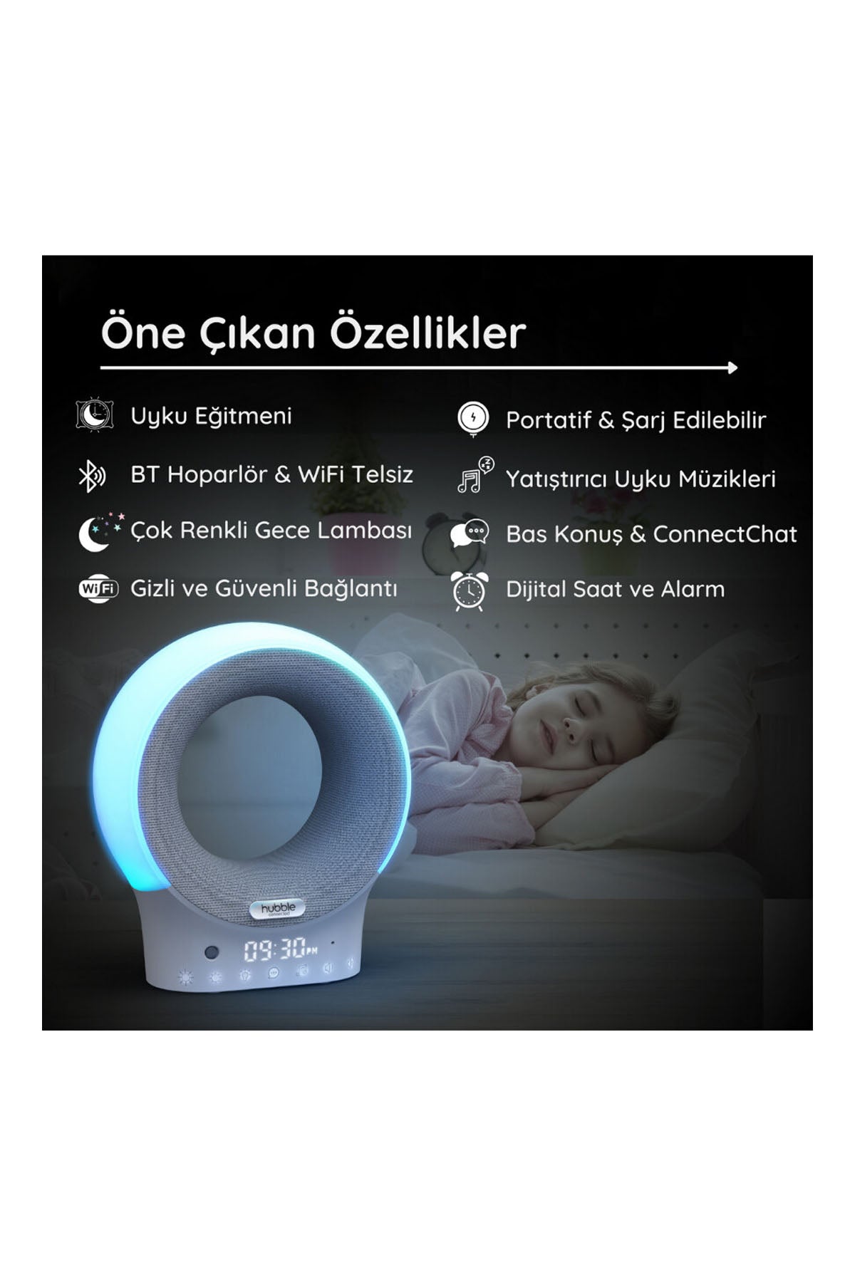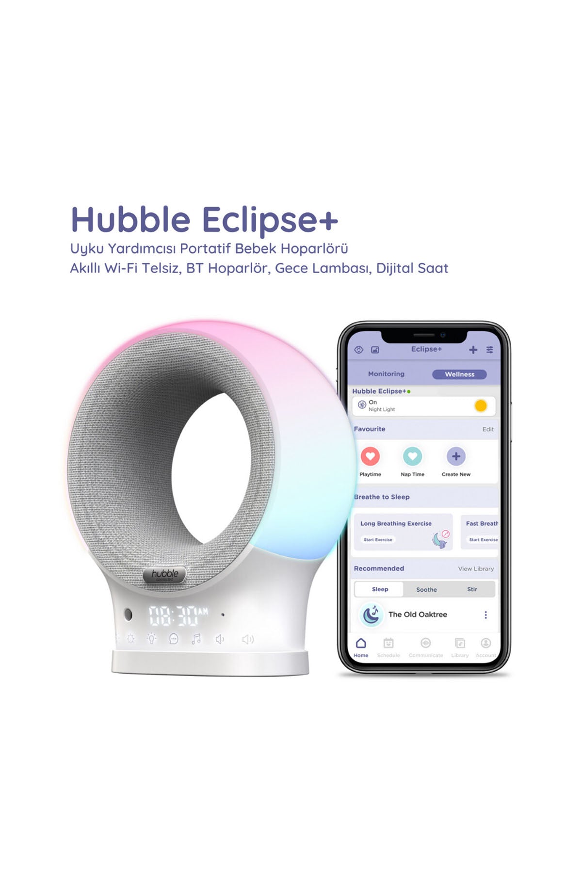 Uyku Yardımcısı Portatif Bebek Hoparlörünüzün 7 farklı renkte gece lambası ve uyku eğitmeni özelliğiyle bebeğiniz için kişiselleştirilmiş bir uyku rutini oluşturabilirsiniz. HubbleClub uygulamasıyla yatıştırıcı sesleri, ninnileri ve daha fazlasını kontrol edebilirsiniz. Bebeğinize belirli bir uyanma rutini kazandırmak için belirlediğiniz saatlerde hoparlörün sesini yükseltecek şekilde ayarlama yapabilirsiniz. Eclipse+ aynı zamanda telsiz işlevi görür ve uyumlu akıllı cihazlardan canlı olarak ortamı dinleyebilirsiniz. Portatif ve şarj edilebilir bu model, Eclipse+ ile HubbleClup uygulaması arasında iletişimi sağlayan Connect Chat'i kullanmanıza olanak sağlar. Hubble Eclipse+, sizin ve bebeğinizin ihtiyacı olan uyku için yardımcı olur.