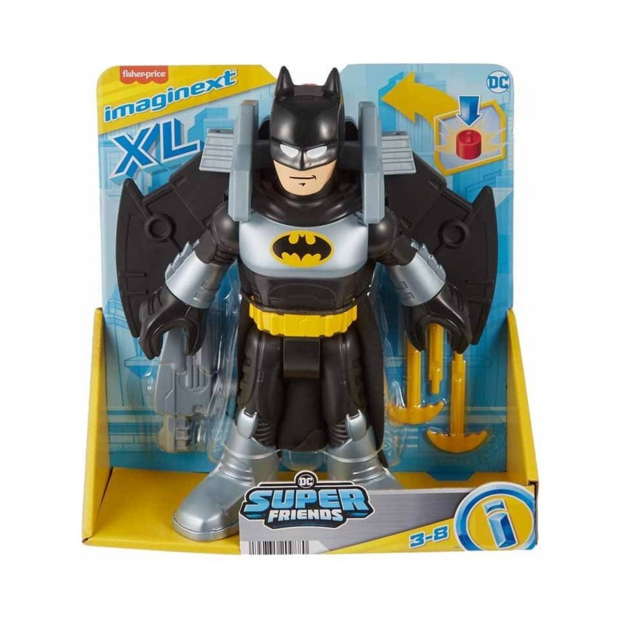 Gotham City'nin kahramanı Batman, 25 cm uzunluğundaki XL figürü ve dönüşen Batglider ile kötülere karşı aksiyon dolu bir mücadeleye hazır! Bükülebilen eklemleri sayesinde dinamik pozlar alabilen figür, takılabilen disk fırlatıcısı ve 3 disk ile çocukların hayal gücünü harekete geçirir. Güç düğmesine basıldığında Batglider'ın kanatları açılır, Batman uçuşa geçer ve suçla mücadeleye başlar.