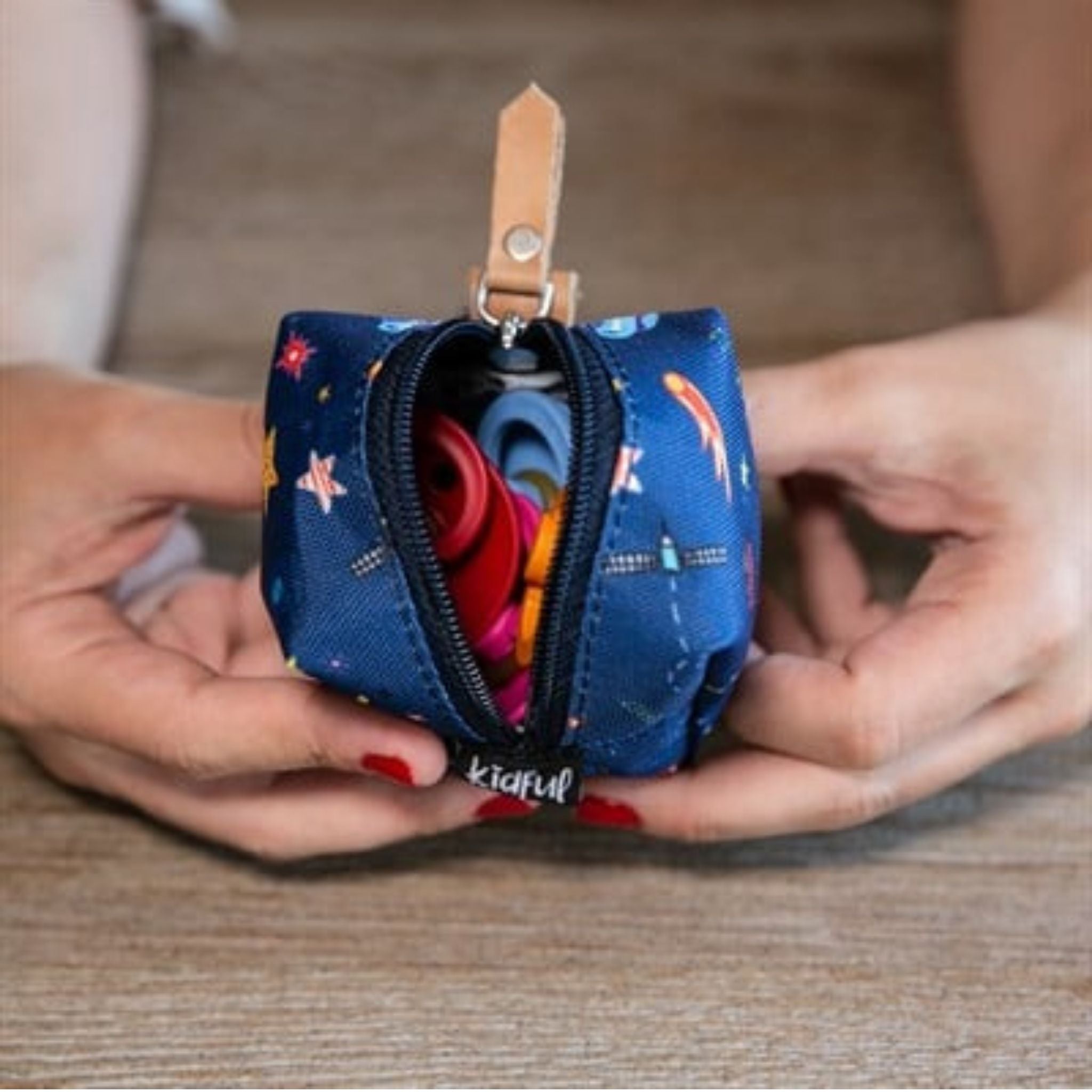 Kidful Emzik Kutusu Space, ebeveynlerin hayatını kolaylaştırmak için tasarlanmış, hem pratik hem de estetik bir üründür. Birbirinden renkli ve özgün desenleriyle dikkat çeken bu emzik kutusu, alışılmış tasarımların dışına çıkarak hem fonksiyonel hem de göz alıcı bir kullanım sunar. Geniş haznesi sayesinde kullandığınız emziğin boyutuna bağlı olarak 2-4 adet emziği kolayca muhafaza edebilirsiniz. Klipsli tasarımıyla çantanıza veya fermuar ucuna asılabilen Kidful Emzik Kutusu, çantanızda arama derdini ortadan kaldırır. BPA, fatalat ve nikel gibi zararlı maddeler içermeyen yapısıyla bebeğinizin sağlığına zarar vermez. Dış ve iç yüzeyi silinebilir kumaştan yapılmıştır, bu da temizliği oldukça kolay hale getirir. İç yüzeyde kullanılan BPA içermeyen kaygan yüzeyli peva, emziklerinizi toza veya kire karşı koruyarak hijyenik bir saklama ortamı sağlar. %100 gerçek deri detaylar ise hem kaliteyi hem de şıklığı artırarak her kullanımda yumuşak dokusunu hissettirir.