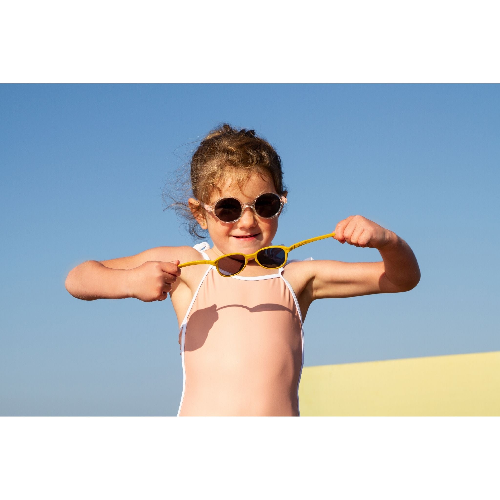 Dayanıklı Çocuk Güneş Gözlüğü: Tek parça enjeksiyonlu çerçeve (TPEE): KIRILMAZ, küçüklere mükemmel uyum sağlar. Menteşesi olmadığından küçük metal parçaların sıkışması veya yutulması riski yoktur. Yumuşak ve rahat siyah kordonla birlikte satılır.