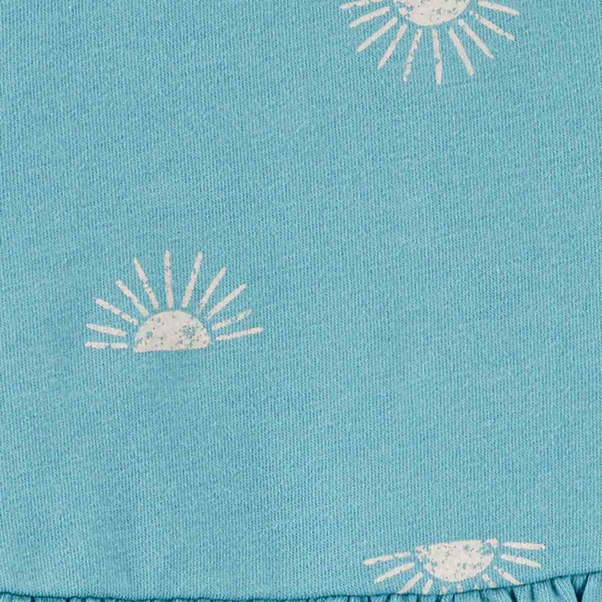 Carter's Kız Bebek Elbise Turkuaz Desenli, minik kızınızın hem günlük hem de özel anlarda rahatlıkla giyebileceği şık ve sevimli bir seçenektir. Güneş baskılı turkuaz rengiyle dikkat çeken bu elbise, yumuşak polar karışımı kumaşı sayesinde soğuk havalarda sıcaklık sunarken esnek yapısıyla da konfor sağlar. Volan detaylı uzun kollu tasarımı ve bel kısmındaki lastikli yapı, elbiseye zarif bir görünüm katarken hareket özgürlüğü de sunar. Elbisenin arka kısmındaki düğme patleti kolay giydirme sağlar. Takıma dâhil olan pamuklu iç külot, uyumlu görünüm ve ekstra rahatlık sunar.